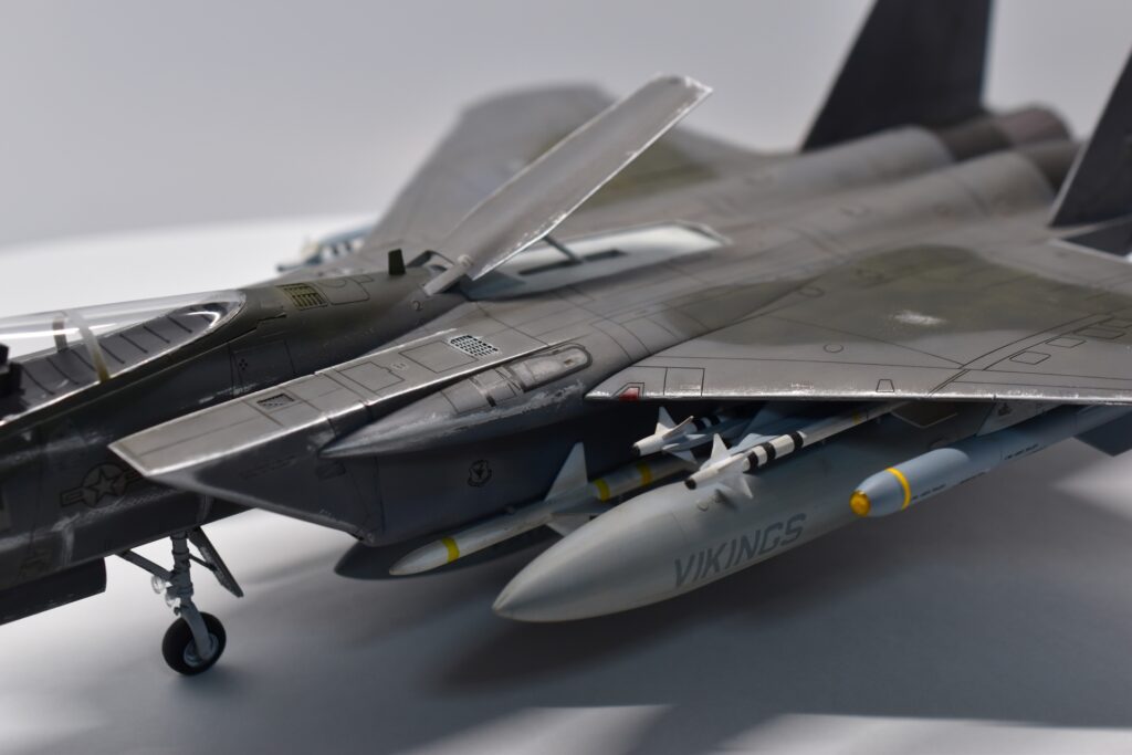 F-15Cは、双発エンジンを搭載し、マッハ2.5という高速を実現しています。また、F-15Cのデザインは、強力なエアフレームと高い機動性が特徴的で、これにより優れたステルス性とともに、空中戦での圧倒的な優位性を誇ります。