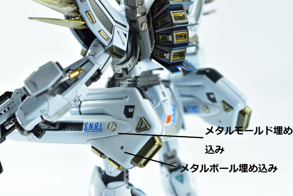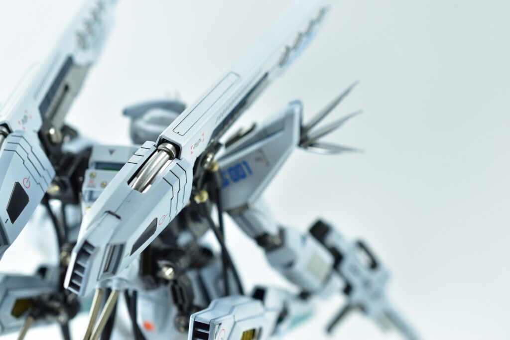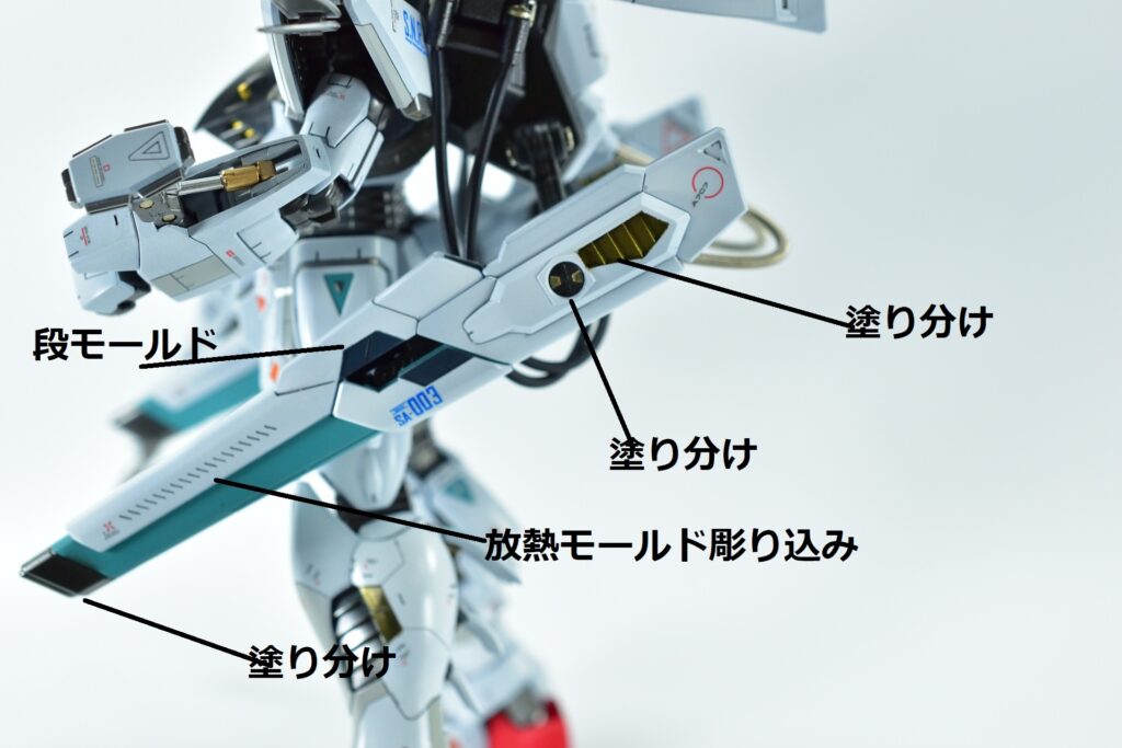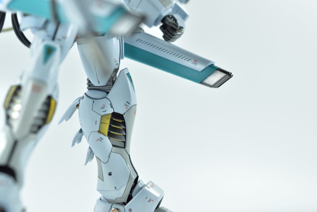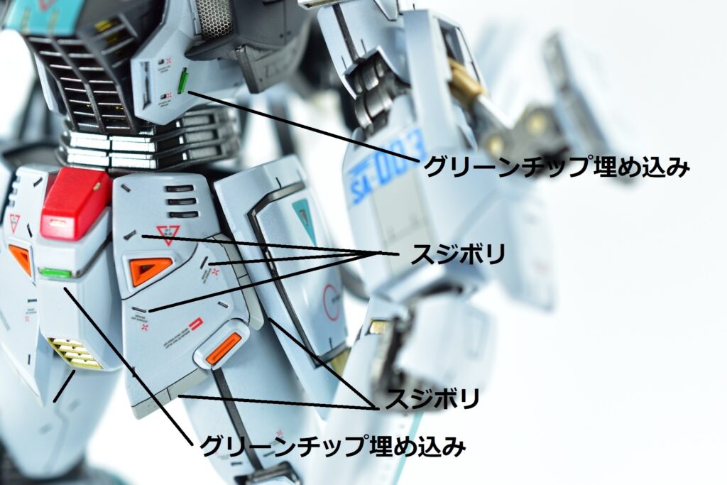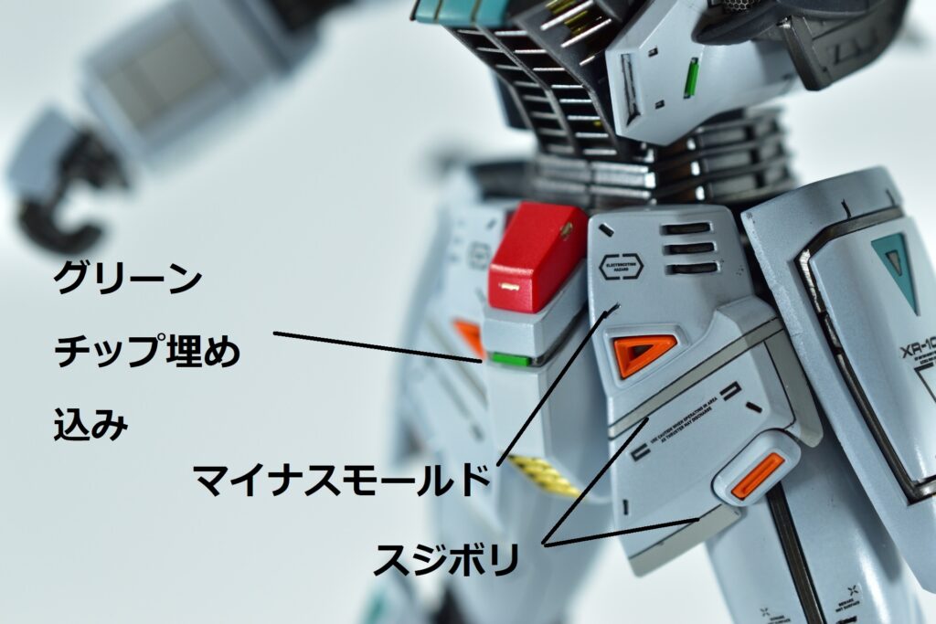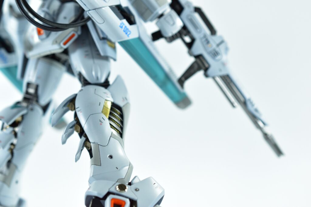その他の外装や武装については、0.2~0.8ミリのスジボリを使い分け、バランスよくディテールを追加。UVジェルクリア硬化を武装やヘッドパーツの一部に施すことで、輝きと質感を強調しました。