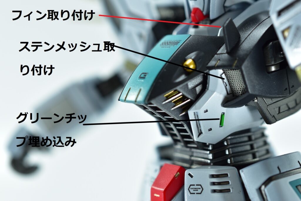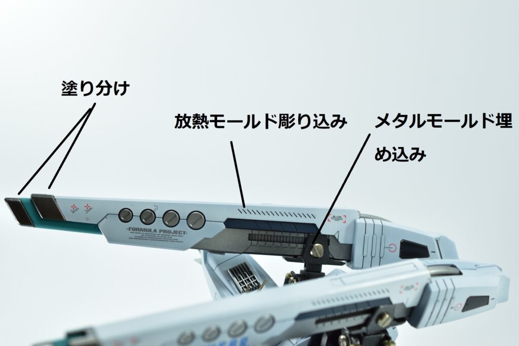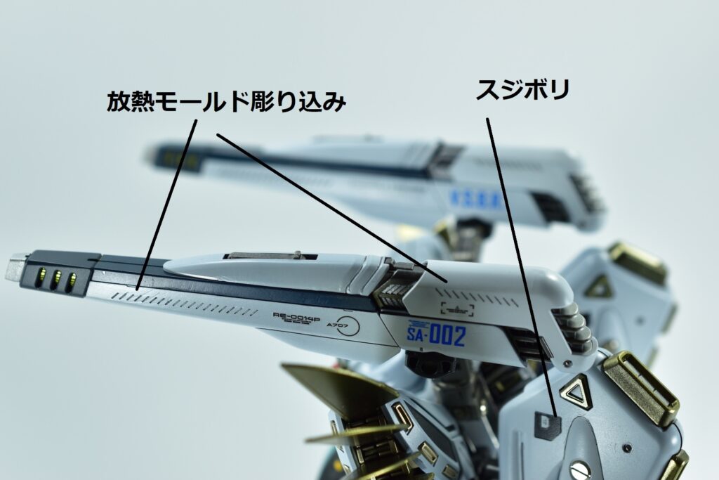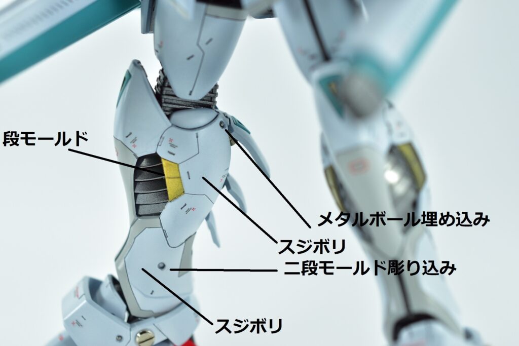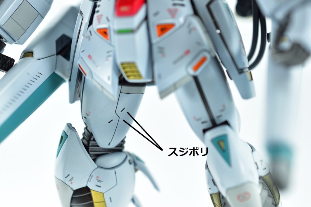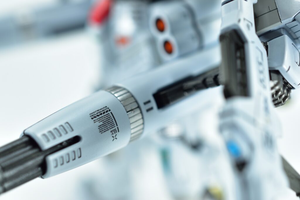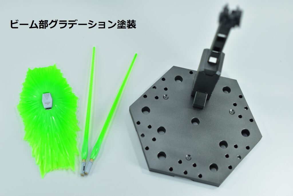 その他の外装や武装については、0.2~0.8ミリのスジボリを使い分け、バランスよくディテールを追加。UVジェルクリア硬化を武装やヘッドパーツの一部に施すことで、輝きと質感を強調しました。