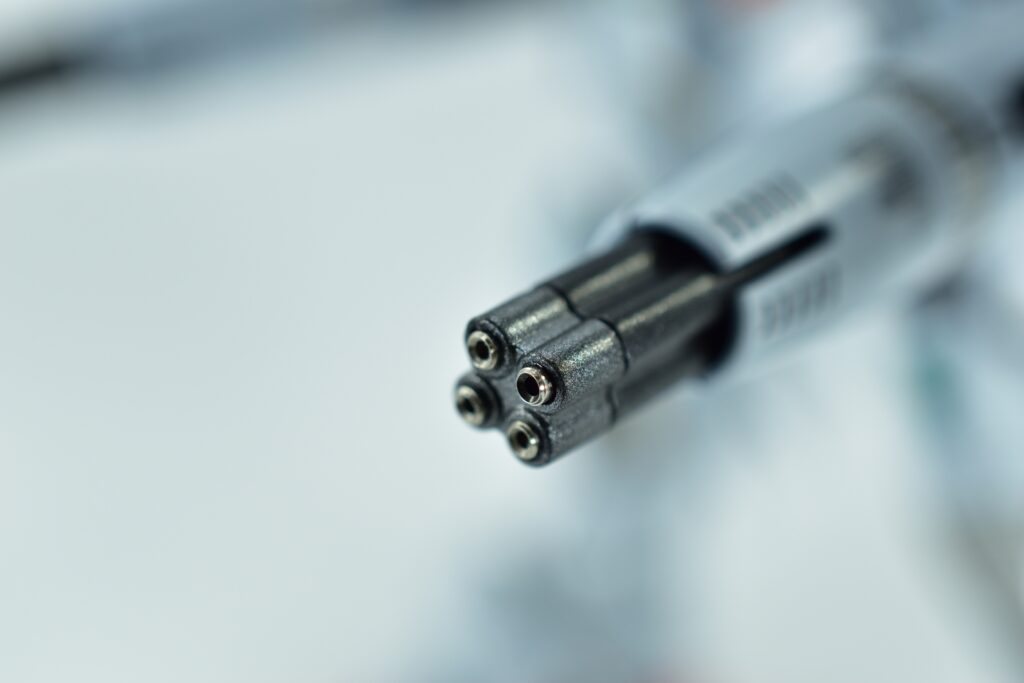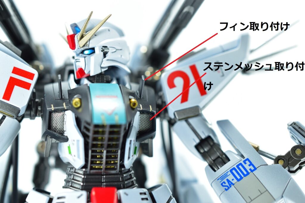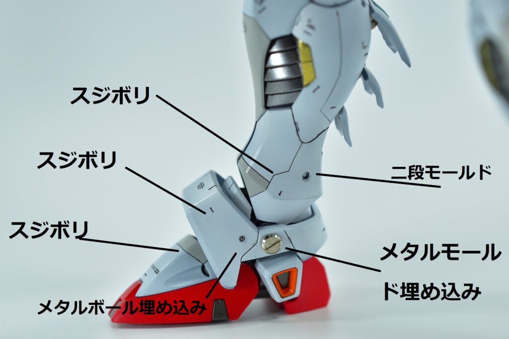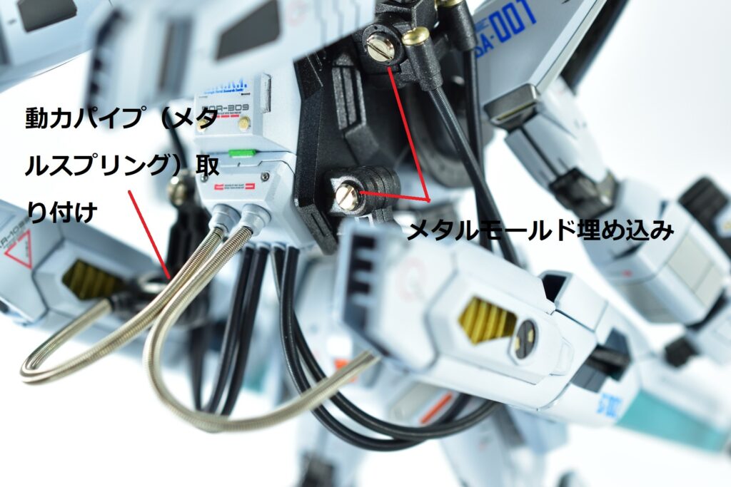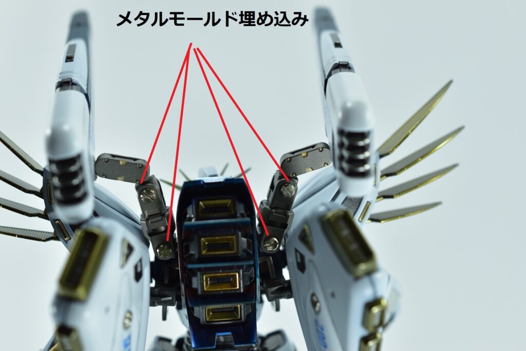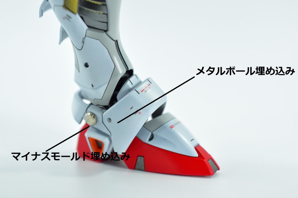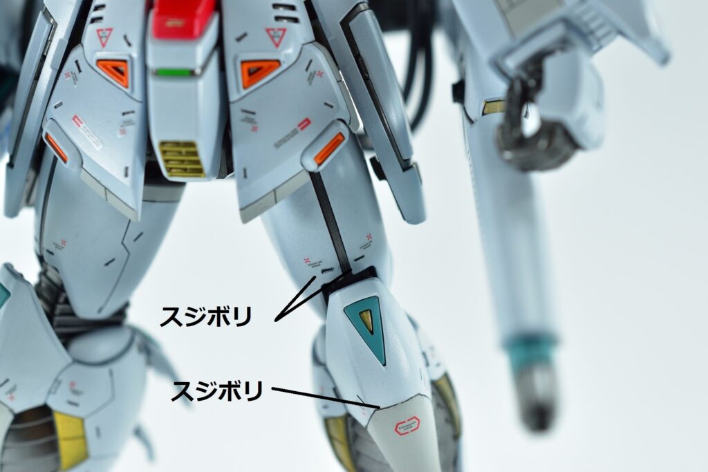 その他の外装や武装については、0.2~0.8ミリのスジボリを使い分け、バランスよくディテールを追加。UVジェルクリア硬化を武装やヘッドパーツの一部に施すことで、輝きと質感を強調しました。