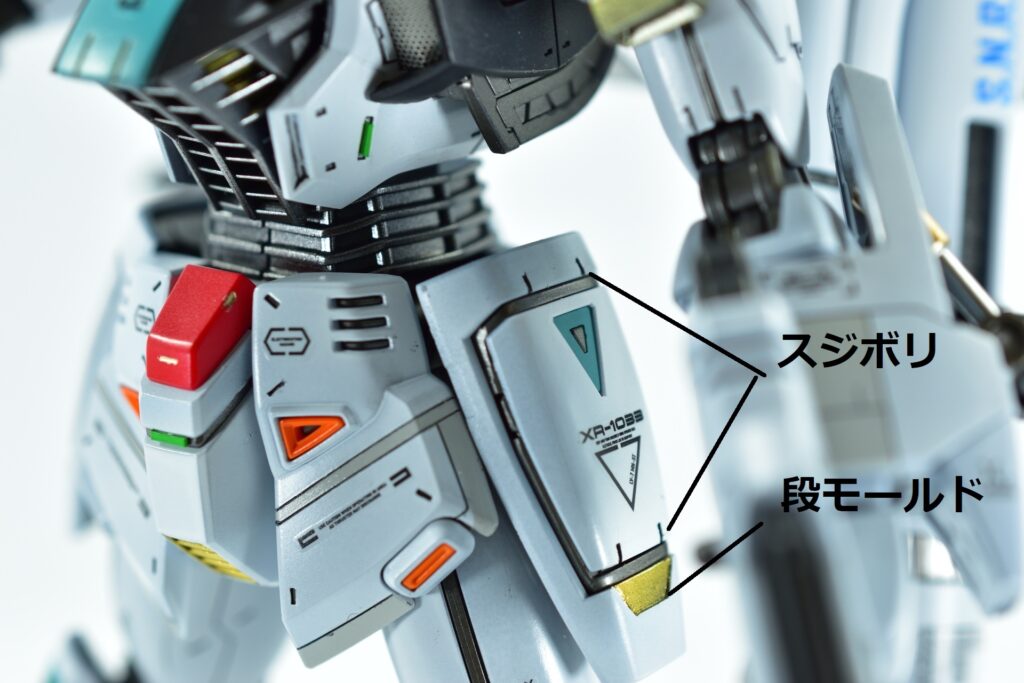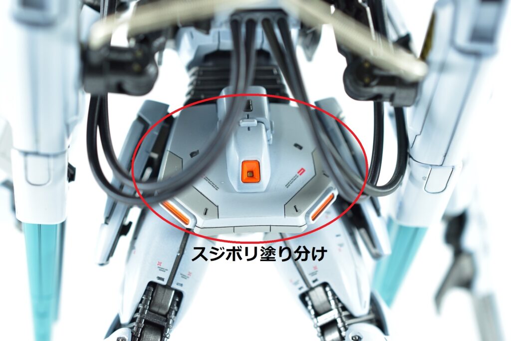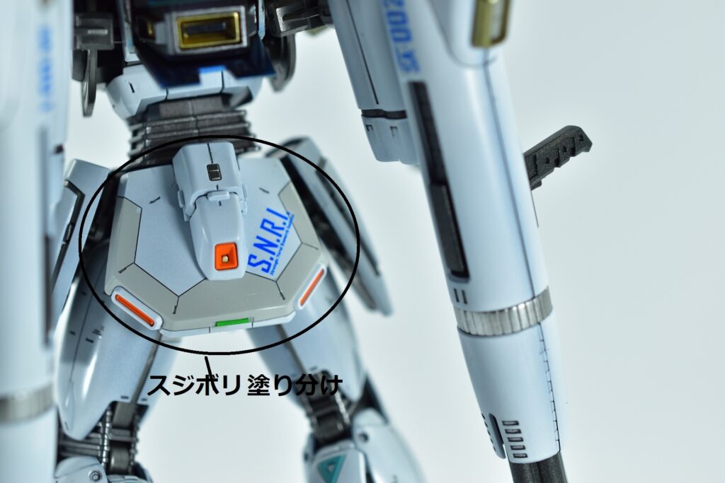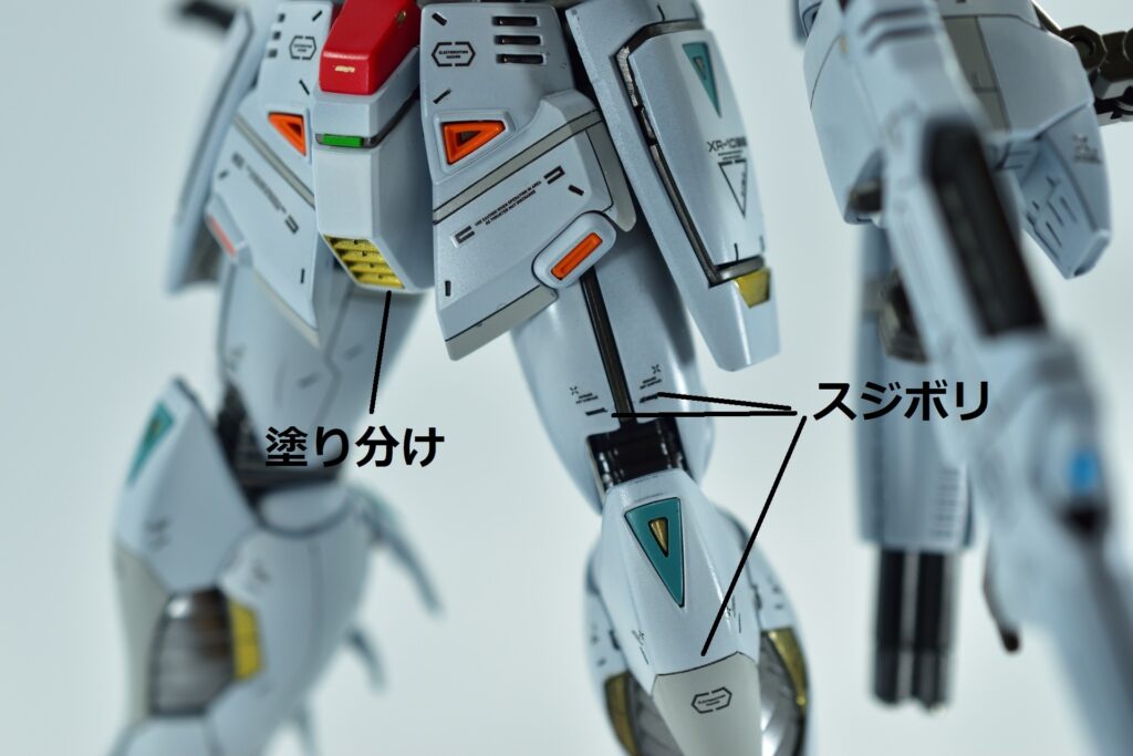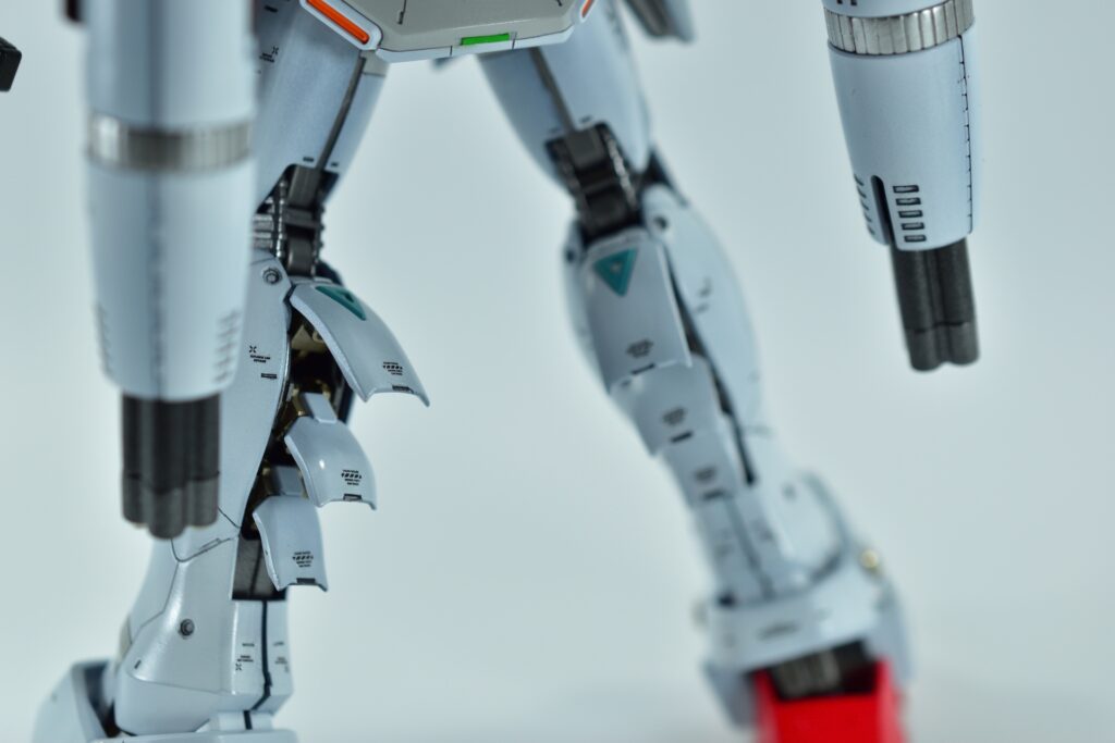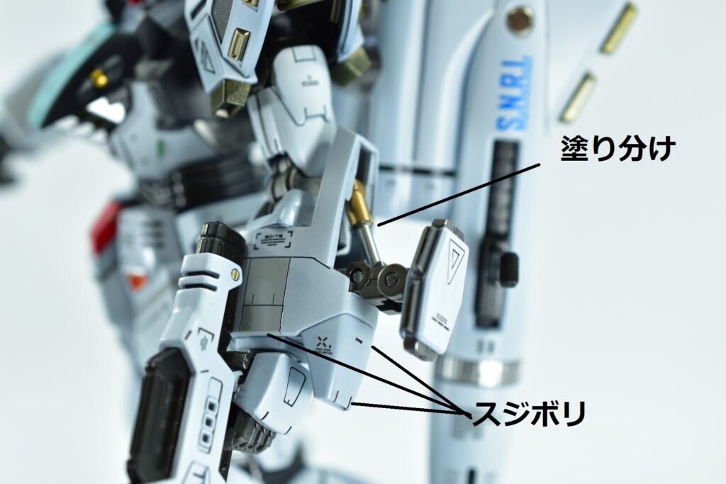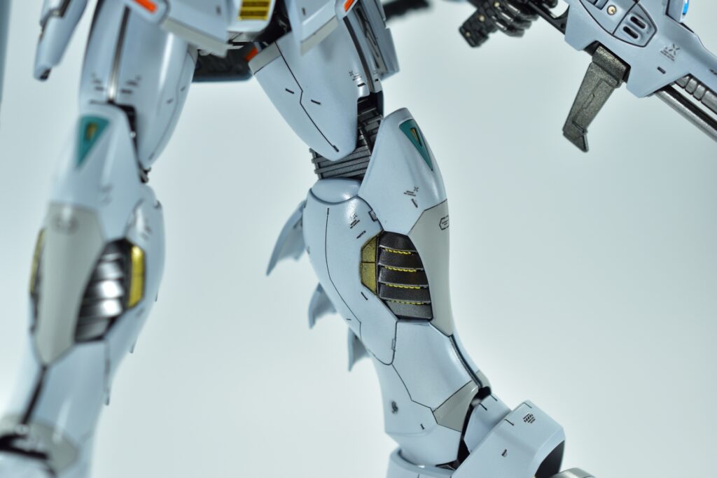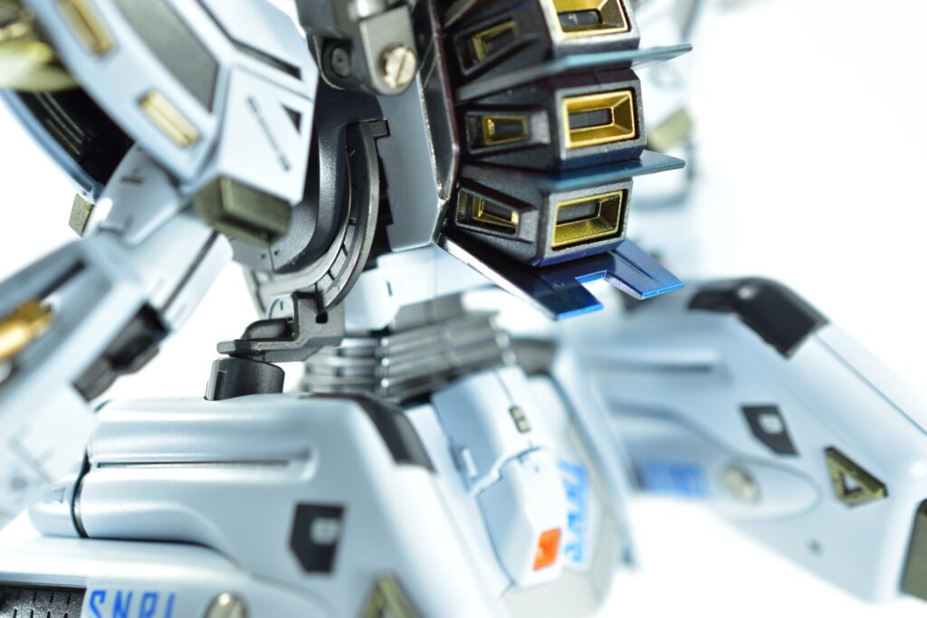 白の外装には黒サフを下地に使用し、その上からホワイトを重ねて重厚感を演出。部分的にはガイアニュートラルグレー2を用いて塗り分けを行い、立体感を引き立てています。モールド部分にはグレーやブラックで墨入れを施し、細部を際立たせました。