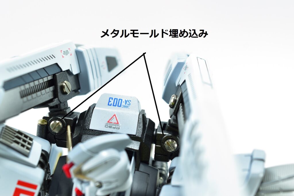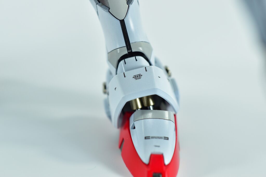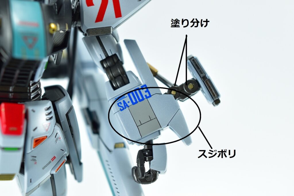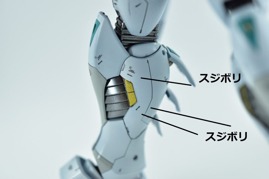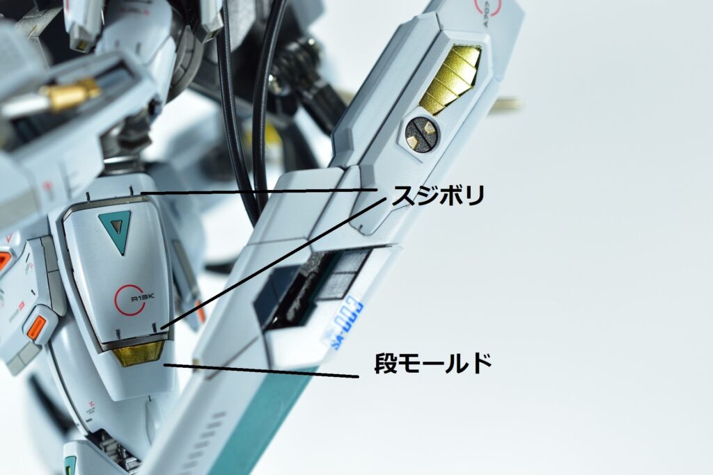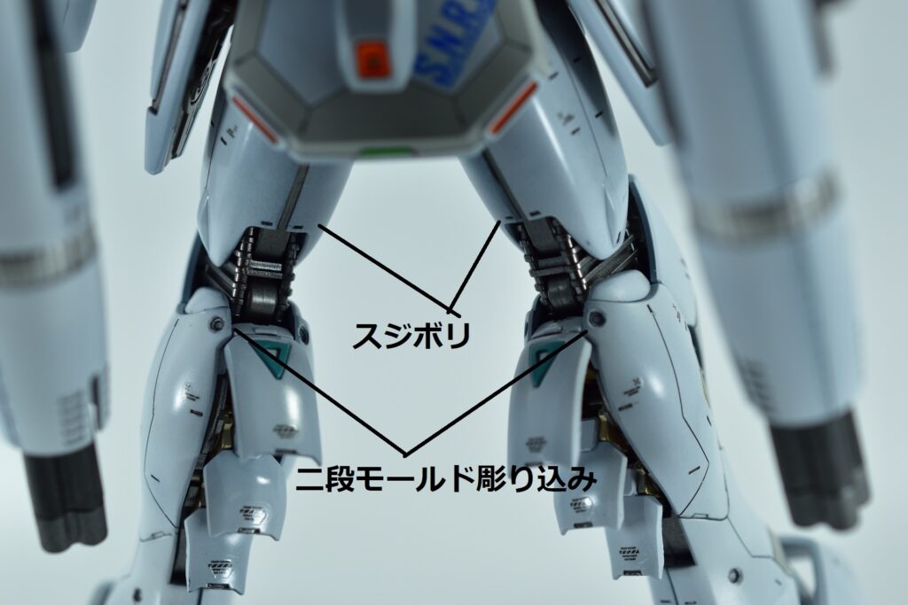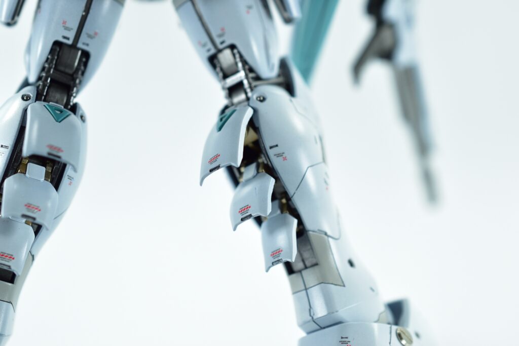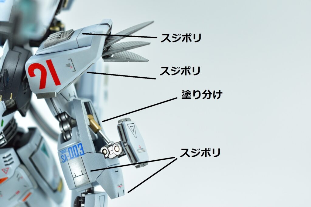 白の外装には黒サフを下地に使用し、その上からホワイトを重ねて重厚感を演出。部分的にはガイアニュートラルグレー2を用いて塗り分けを行い、立体感を引き立てています。モールド部分にはグレーやブラックで墨入れを施し、細部を際立たせました。