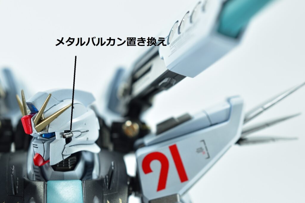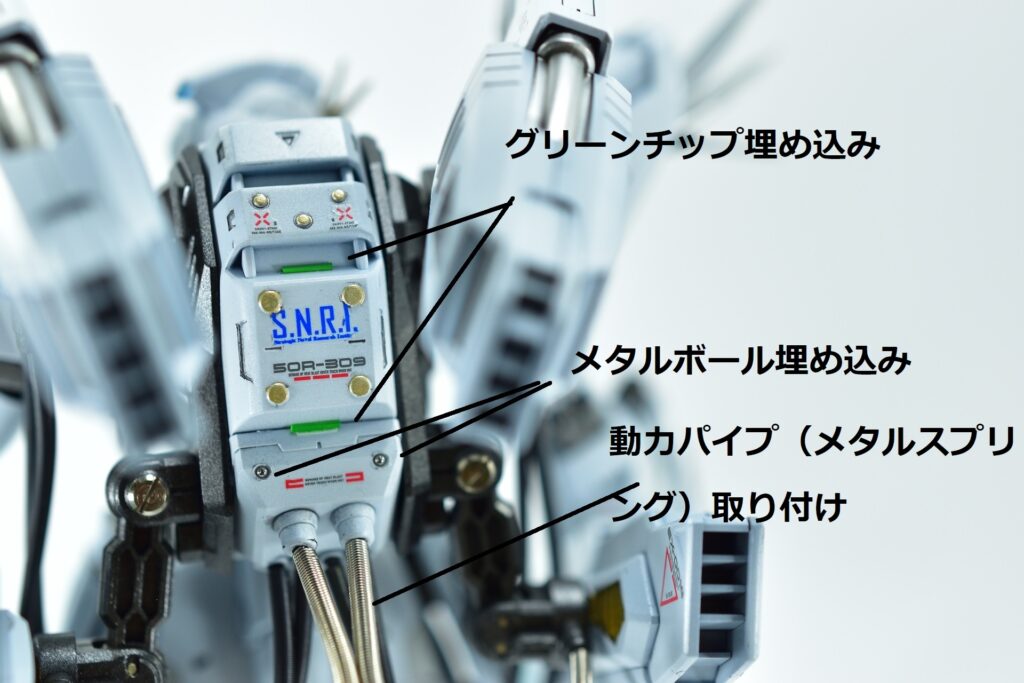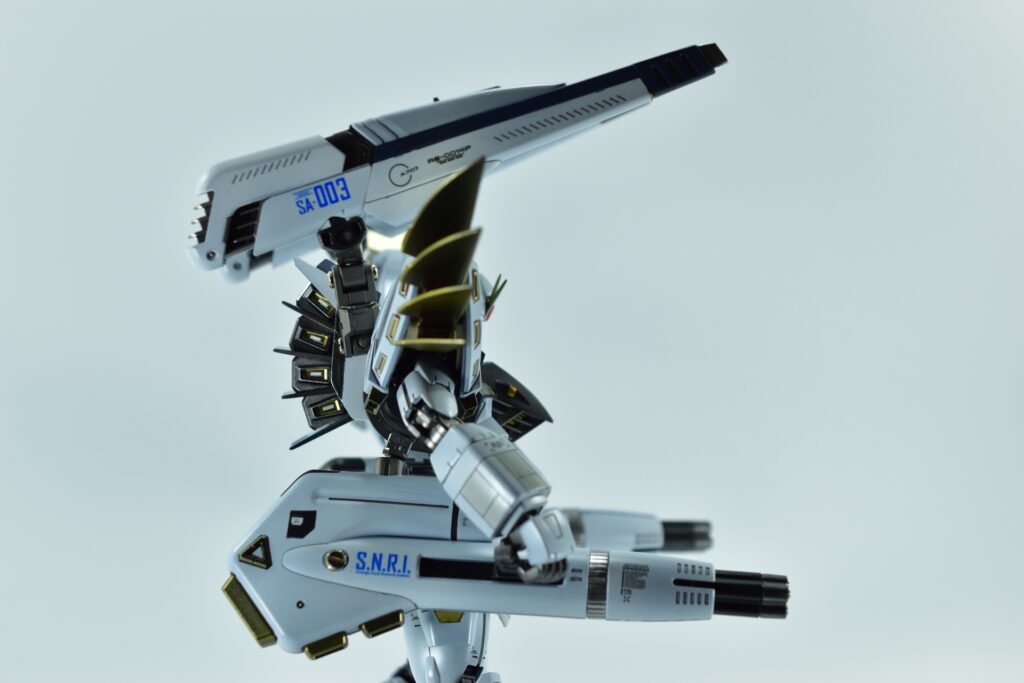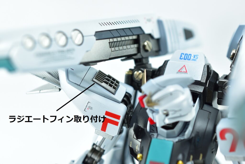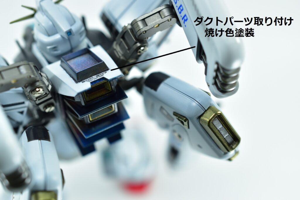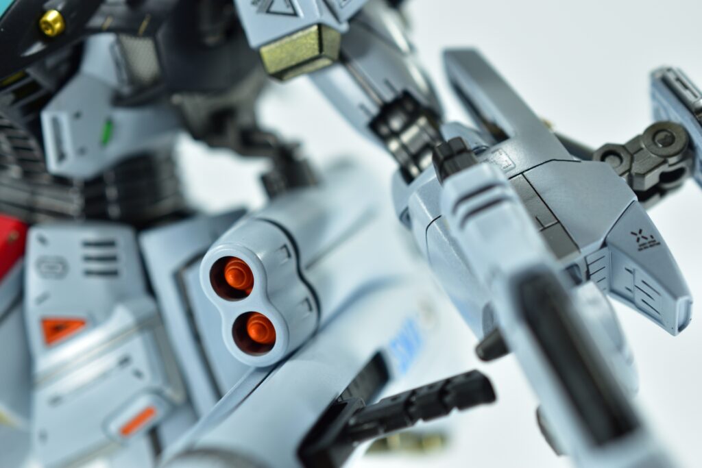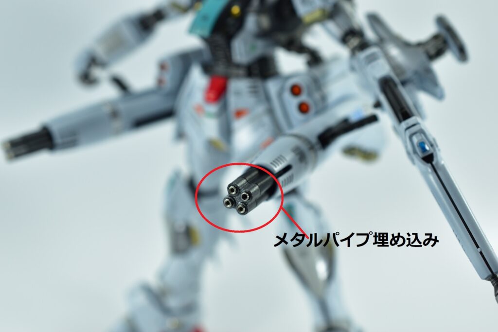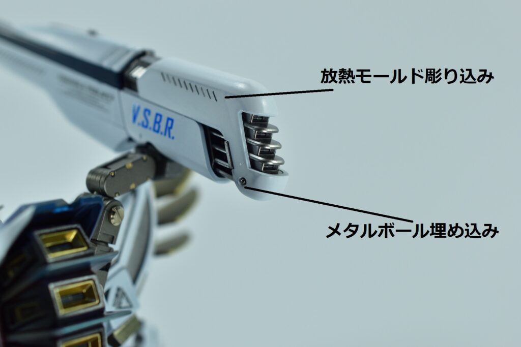 余剰パーツとなるノーマルヴェスバーを他社製アームジョイントでバックパックへ追加装備。これにより、機体の後部シルエットをボリュームアップさせ、より重装備感のあるスタイルに仕上げました。