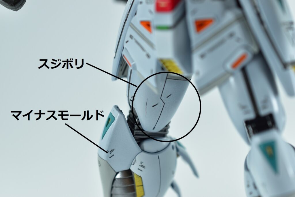 基本工作では、ゲート処理と表面処理(#600~#1500)を丁寧に行い、エッジ出しを意識しました。スジボリは特にスタイリッシュさを意識し、白の外装には0.15ミリで統一。過剰なディテールを避けるため、マイナスモールドを多用し、シンプルながらも洗練された印象を狙いました。