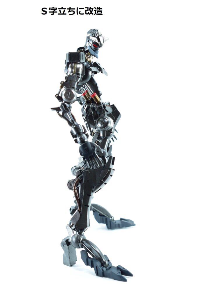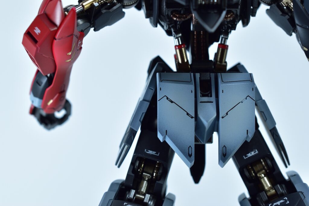 バルバトスルプスの腰部関節を6mm延長することで、機体のスタイルを改修し、S字立ちを自然に決めることができました。これにより、よりダイナミックなポーズが可能になり、全体的にしっかりとした存在感を持つ機体に仕上がっています。