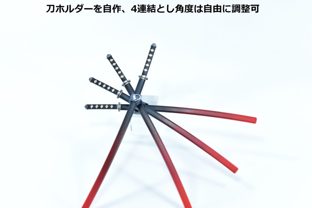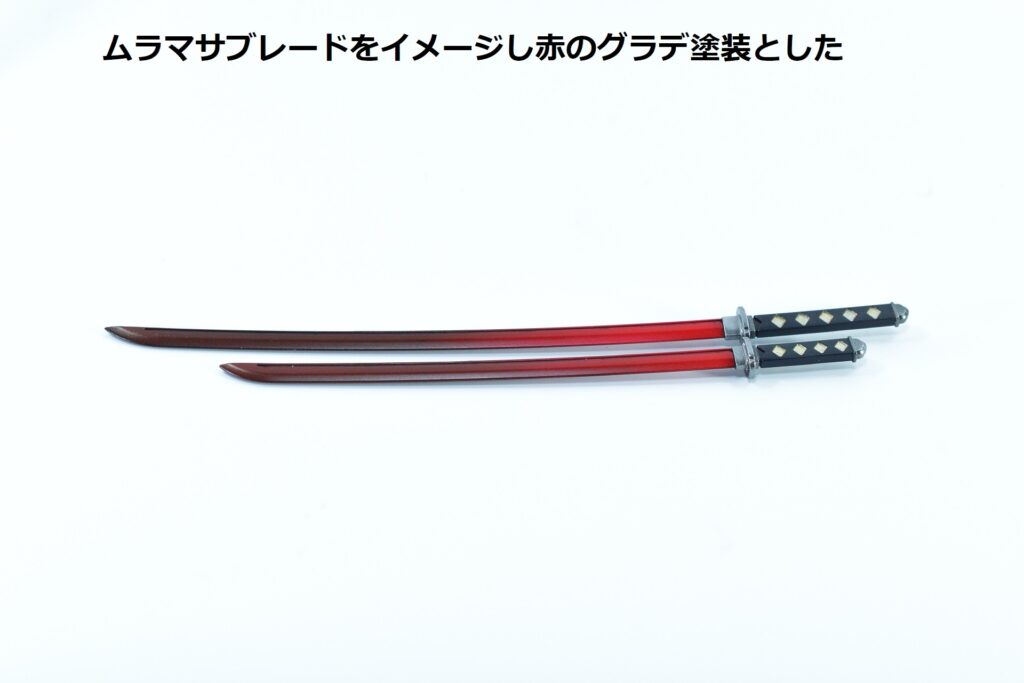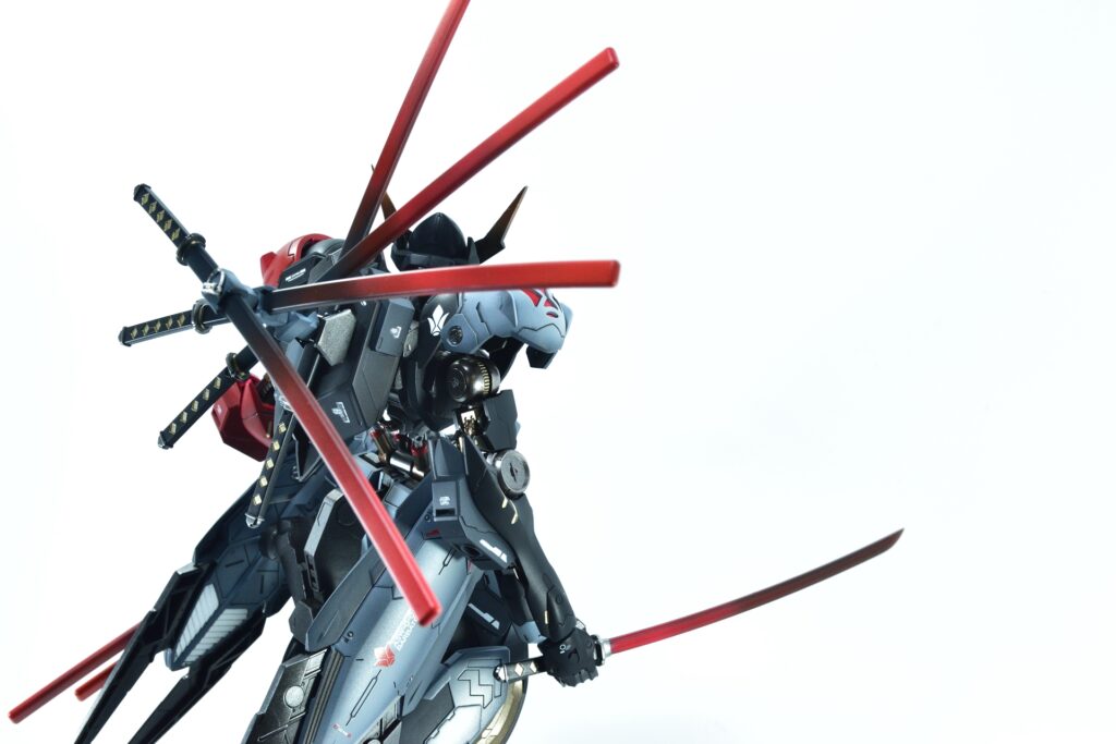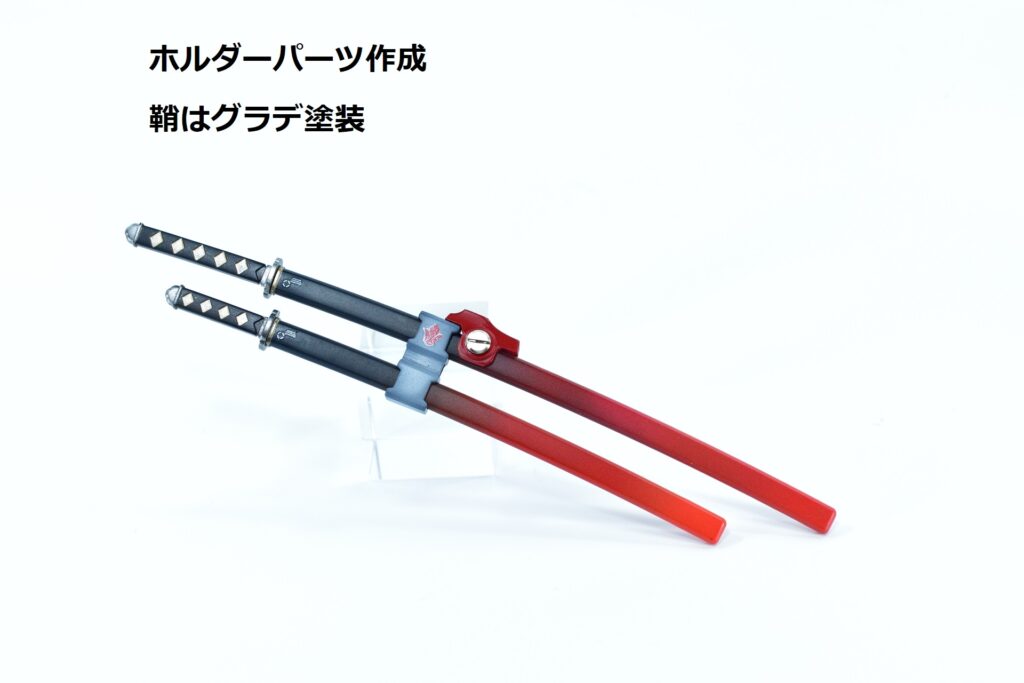 カラーリングにはこだわり、黒を基調としたシンプルながら力強い印象を与える色合いを選びました。赤のグラデーションは刀や鞘、持ち腕の外装に使用し、視覚的なアクセントを加えています。グラデーション塗装では、色の変化をスムーズに見せるためにエアブラシを駆使し、自然な陰影を作り出しました。