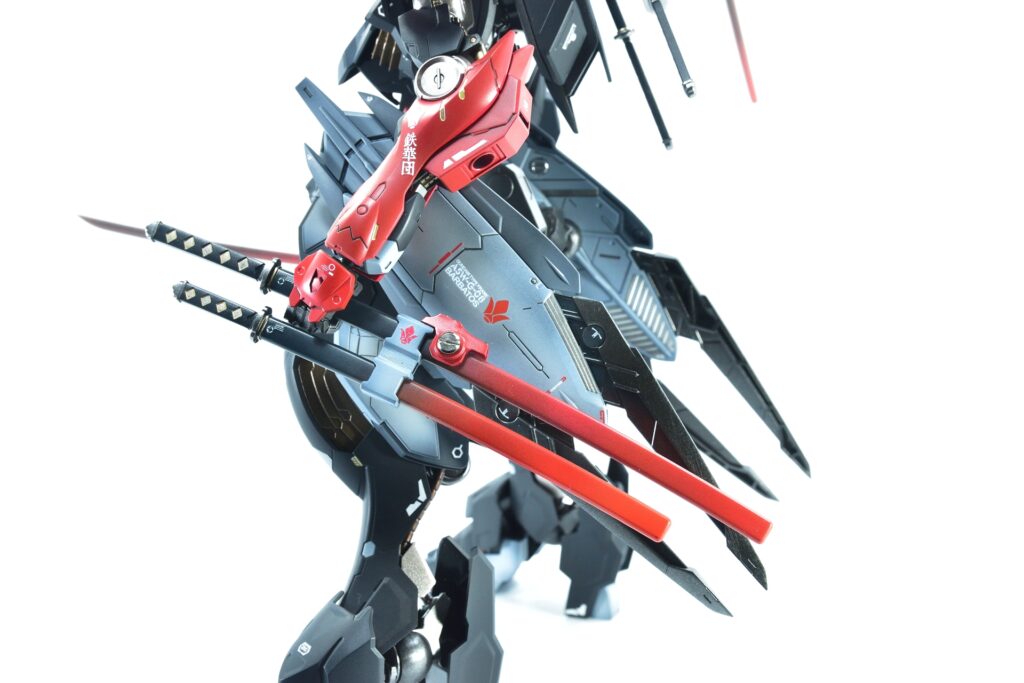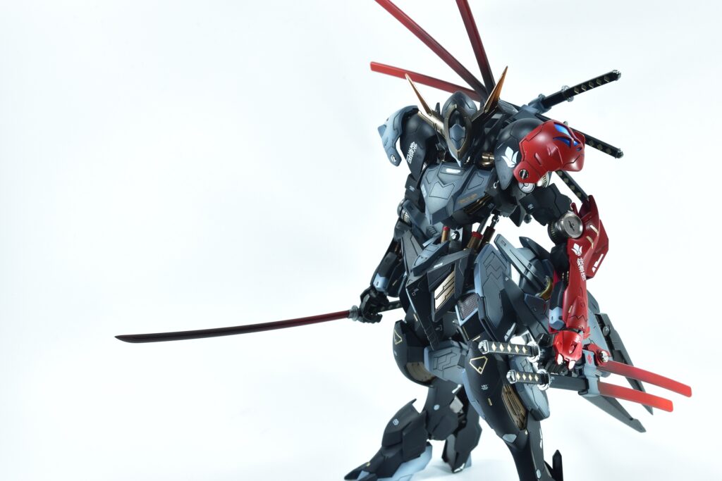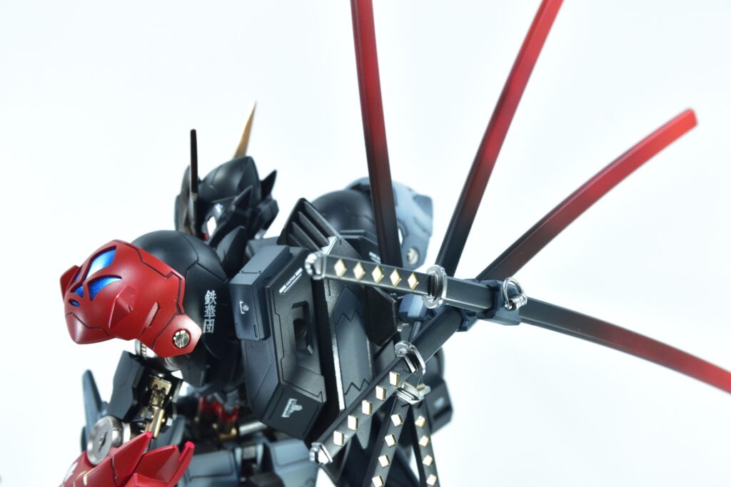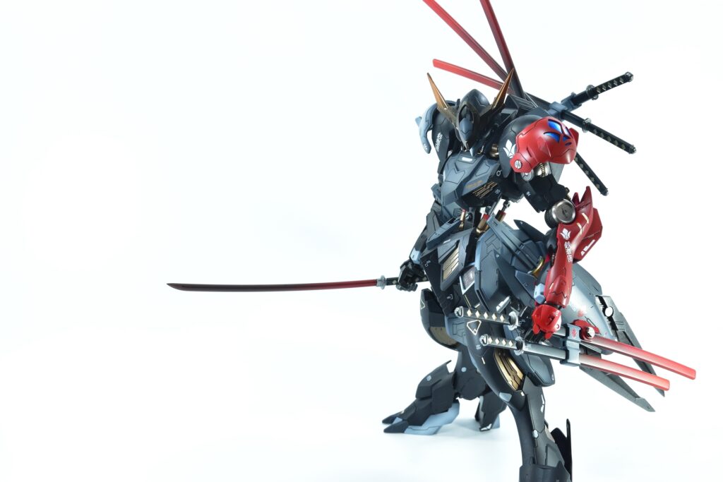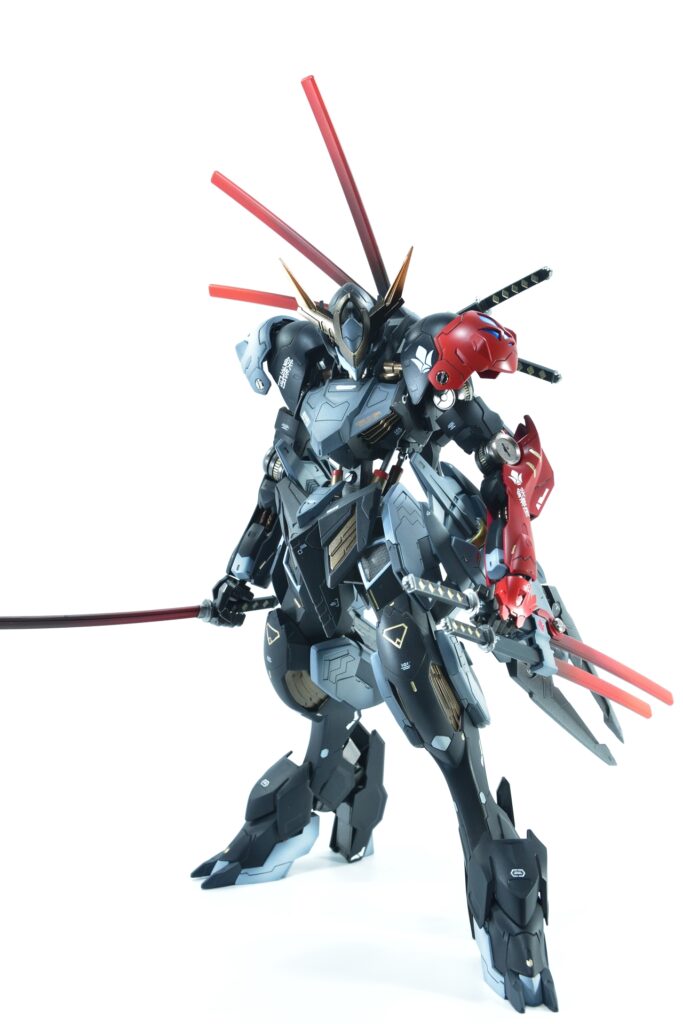 今回はMGバルバトスルプスをベースに、サムの愛刀「ムラマサブレード」を参考にしたカスタムを行いました。全体的に黒を基調としたシックなカラーリングを採用し、刀や鞘には赤のグラデーションを施し、威厳と美しさを強調しました。持ち腕の外装を赤にし、左右非対称のカラーリングを採用することで、独特な個性を持つ機体として仕上げました。刀の装備を増やすことで、武装感をアップし、バルバトスルプスの力強さと美しさを両立させた作品です。