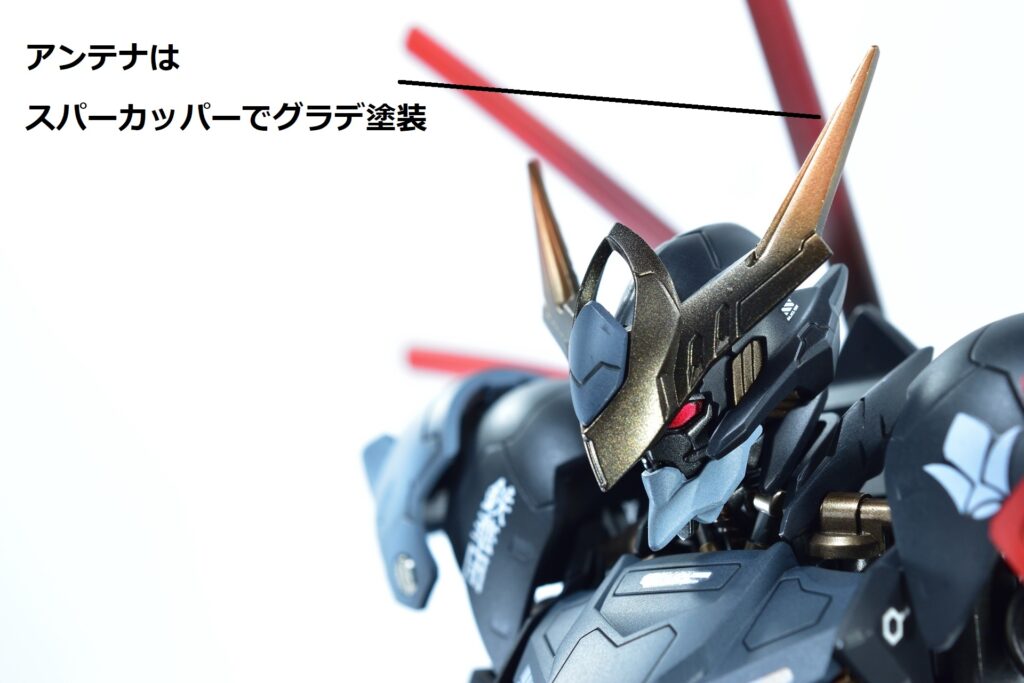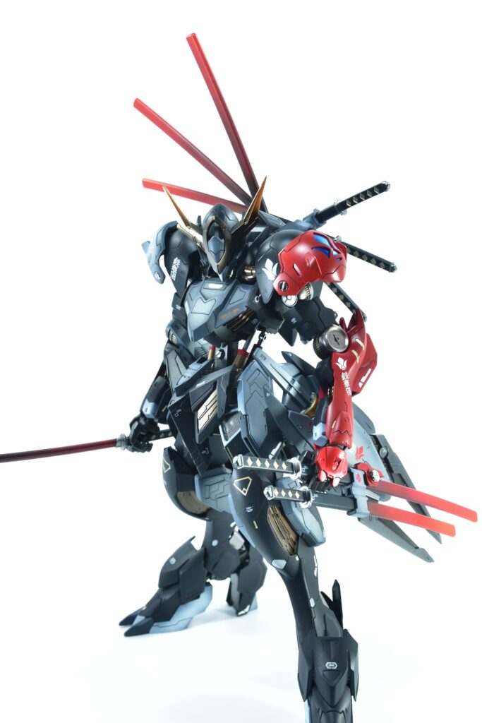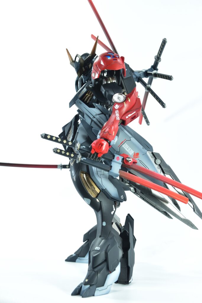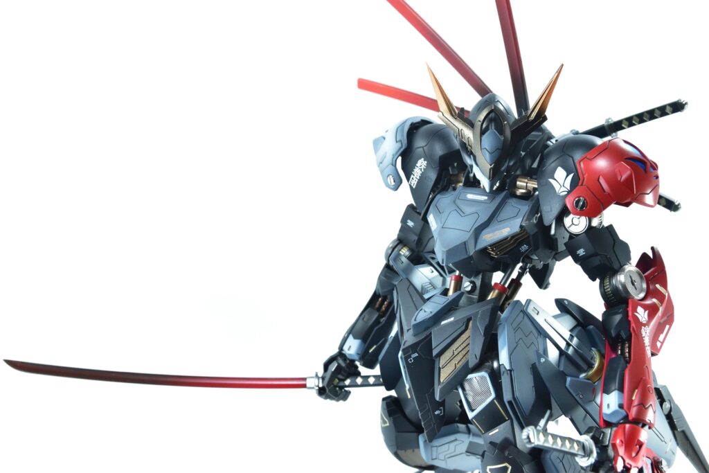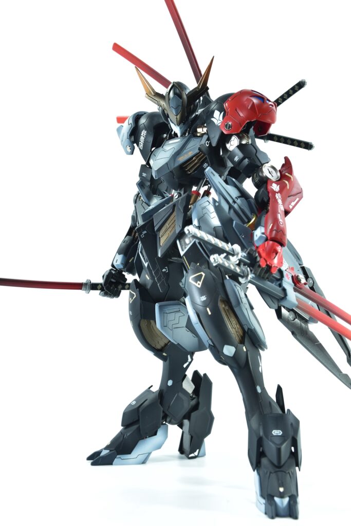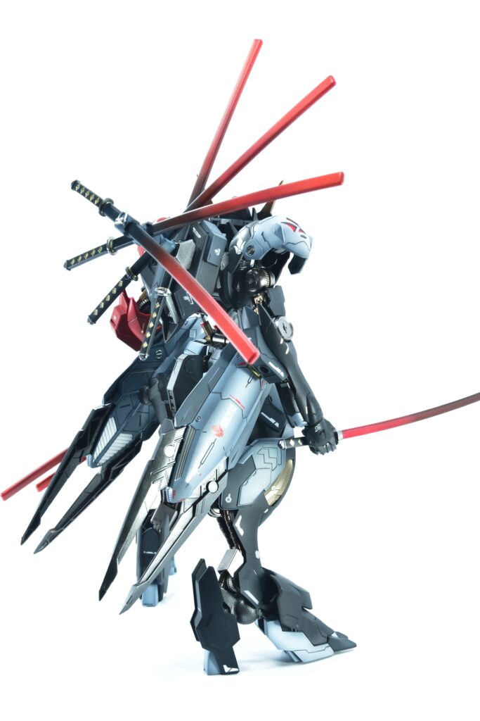 今回はMGバルバトスルプスをベースに、サムの愛刀「ムラマサブレード」を参考にしたカスタムを行いました。全体的に黒を基調としたシックなカラーリングを採用し、刀や鞘には赤のグラデーションを施し、威厳と美しさを強調しました。持ち腕の外装を赤にし、左右非対称のカラーリングを採用することで、独特な個性を持つ機体として仕上げました。刀の装備を増やすことで、武装感をアップし、バルバトスルプスの力強さと美しさを両立させた作品です。