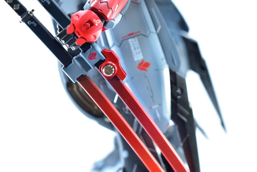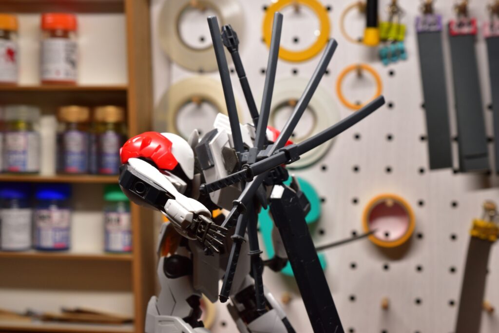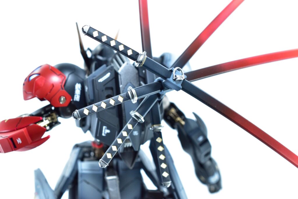 刀と鞘には細かな改修を施し、ホルダーも新たに造作しました。ムラマサブレードのデザインにインスパイアされ、刀の刃や鞘の形状をリアルに再現しました。これにより、バルバトスルプスに新たな武器の個性を与え、戦闘シーンでの迫力を増しています。