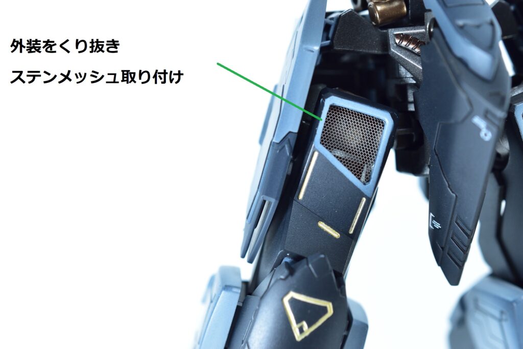 太もも部分をくり抜き、メッシュを取り付けることで、軽やかさと動きを感じさせるディテールを加えました。この変更により、太ももの装甲がよりスリムに見え、動きやすさが強調されました。