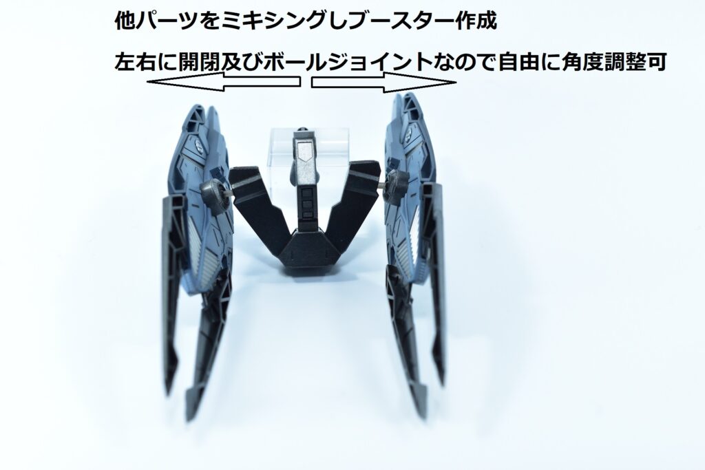 ブースター部分に他のキットのパーツをミキシングし、より迫力のある後ろ姿を実現しました。追加したブースターは機体のバランスを考慮し、重さを適切に分散させるよう工夫しました。