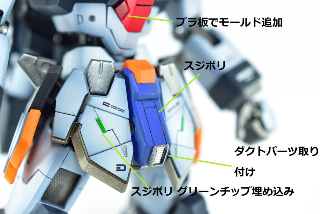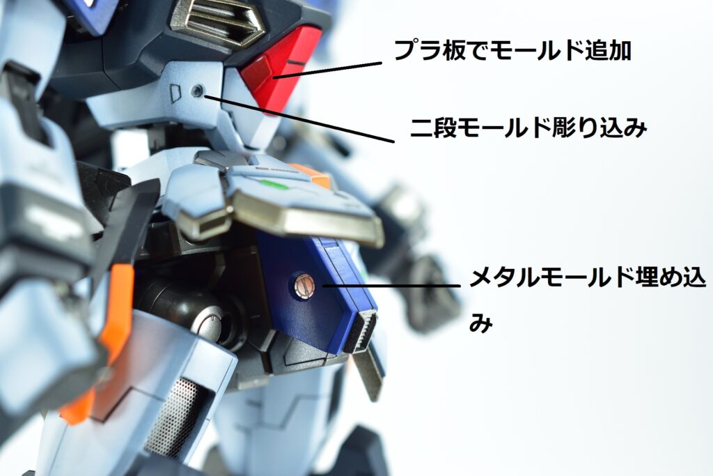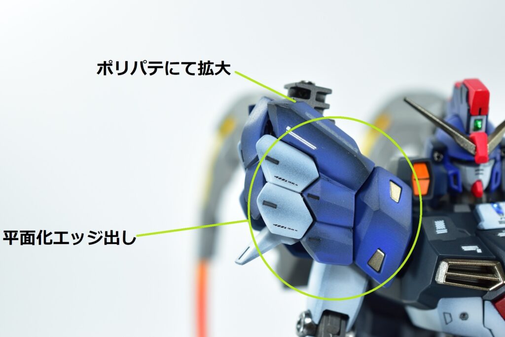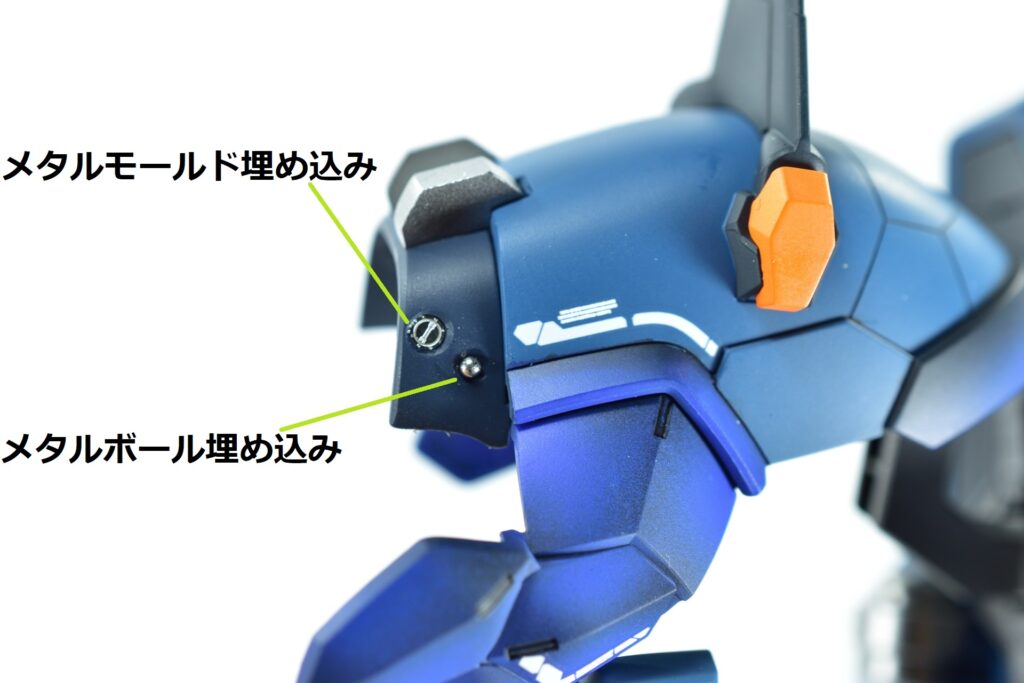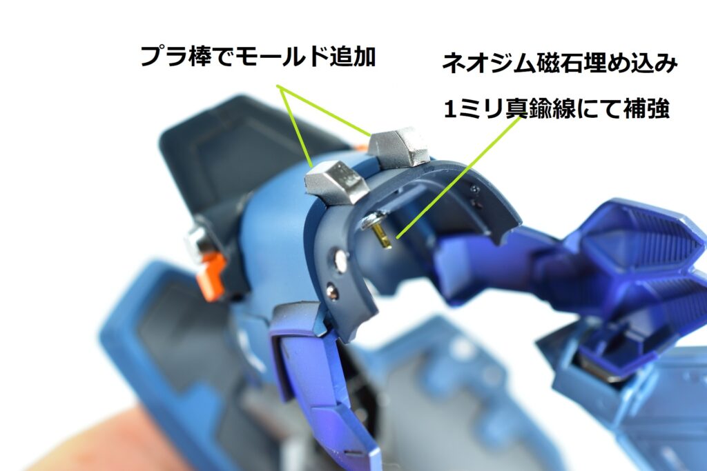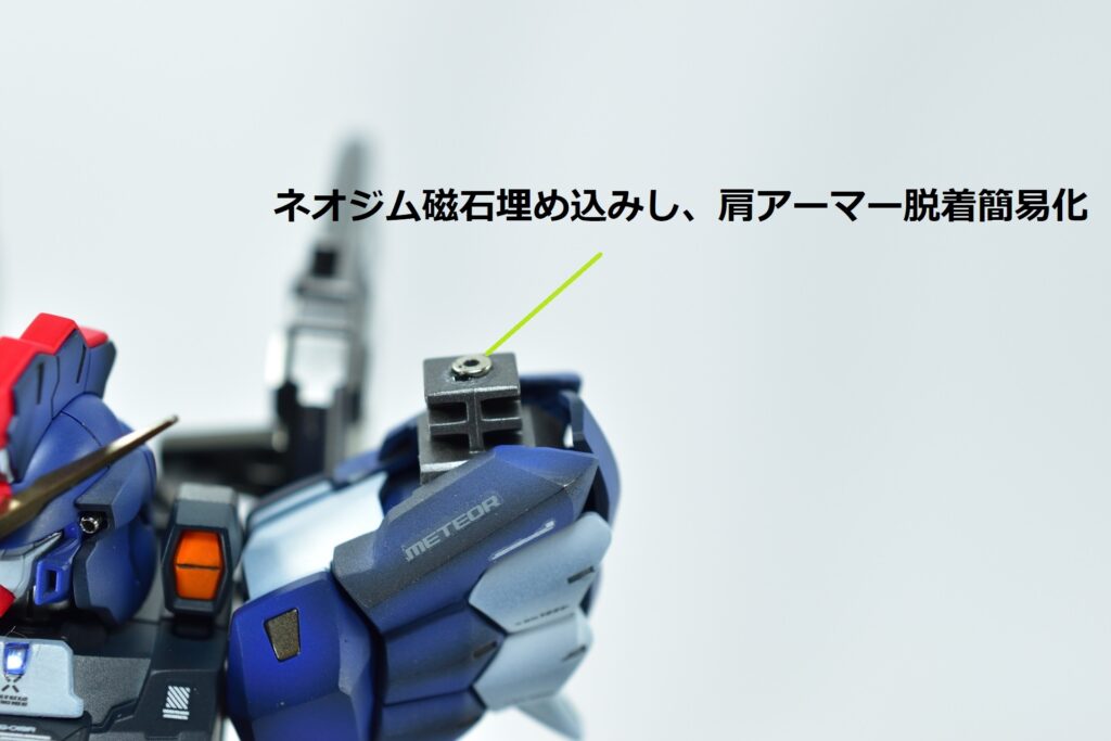 肩アーマーはエッジ出しを行い、エポキシパテで若干拡大。さらにアーマディロ装備の肩アーマーは拡大に伴い干渉部分を調整。ネオジム磁石を使い着脱式に改造。1ミリ真鍮線で補強しているため、取り外し時のズレも防止しています。