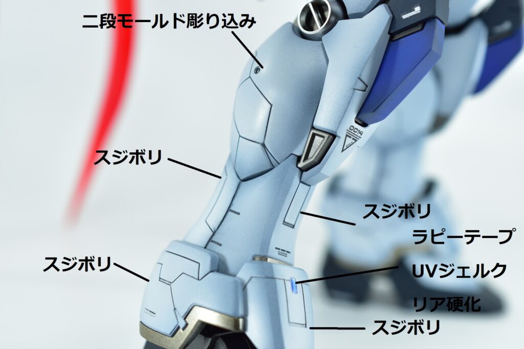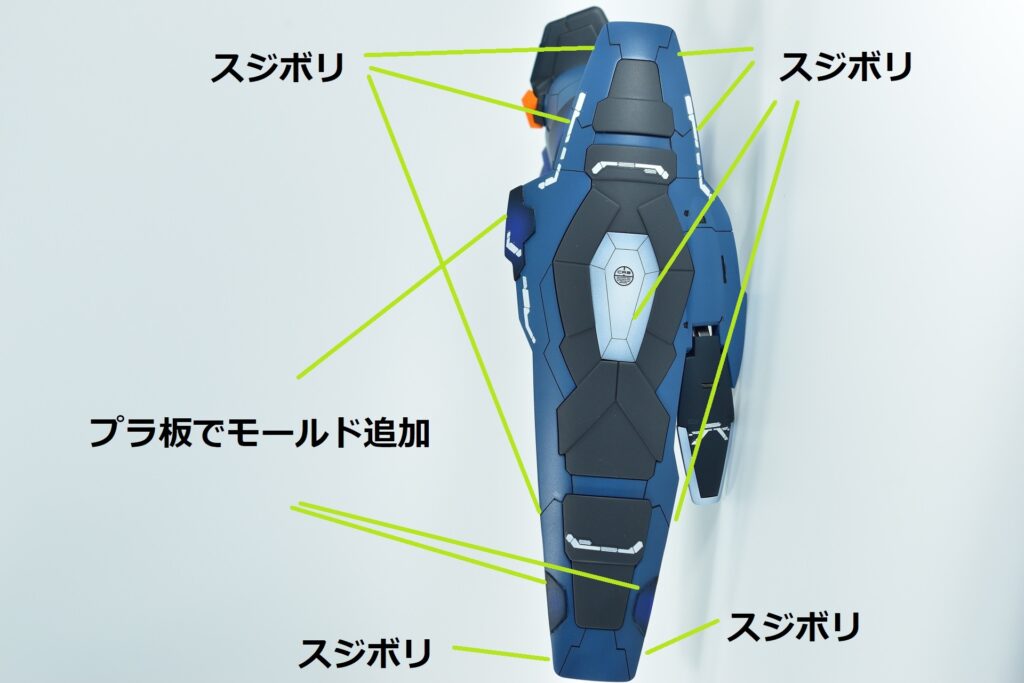 スジボリは外装や武装に0.2~0.8ミリを使い分け、情報量を増やしつつ精密感をアップさせました。