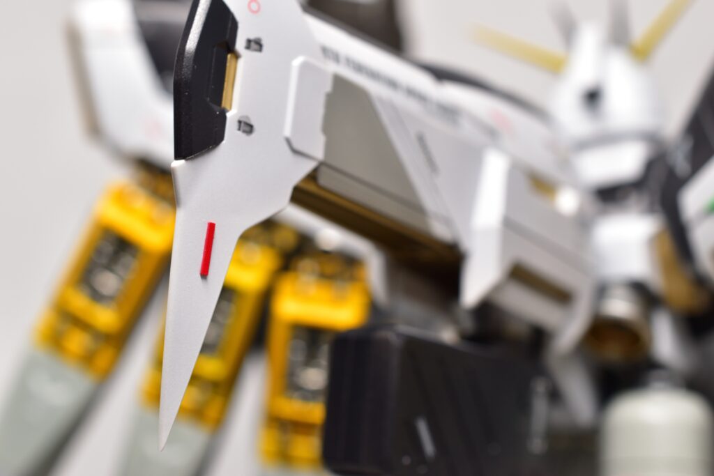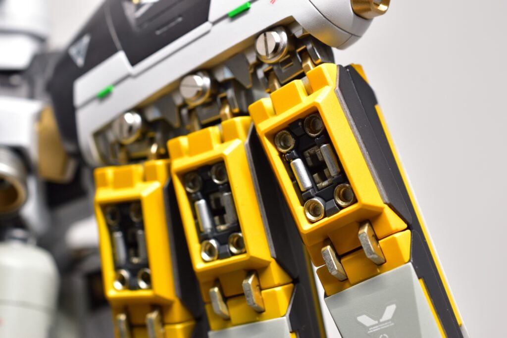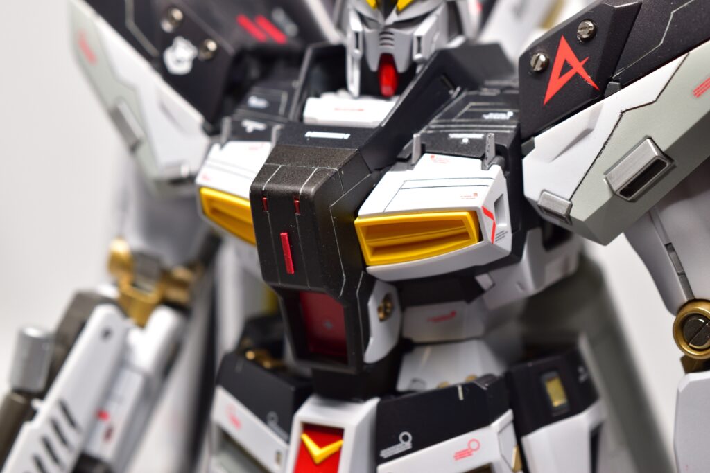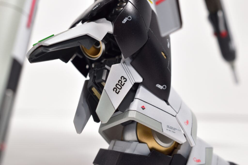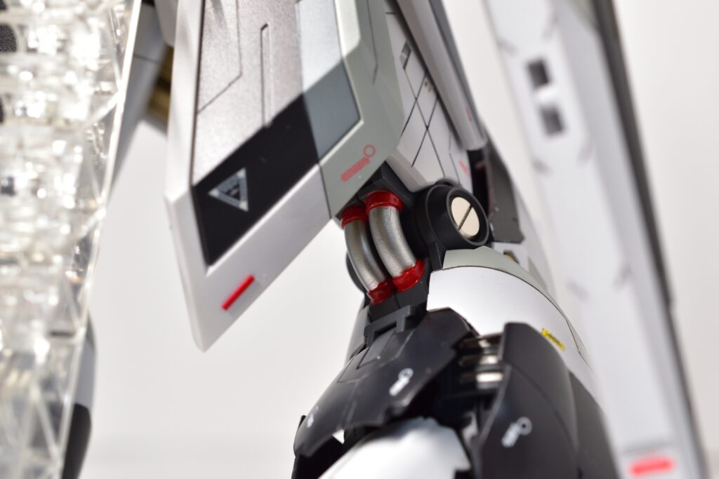 さらに、足首関節のフレーム部はシルバーとゴールドで塗り分け、胸部アーマーにはモールドを追加し、レッドチップを加えました。肩アーマーにもモールドを追加し、グレーとホワイトで塗り分け、マイナスモールドを埋め込んでいます。腰アーマーにはモールドを追加し、メタルパーツを取り付けて赤のワンポイントを加えました。
