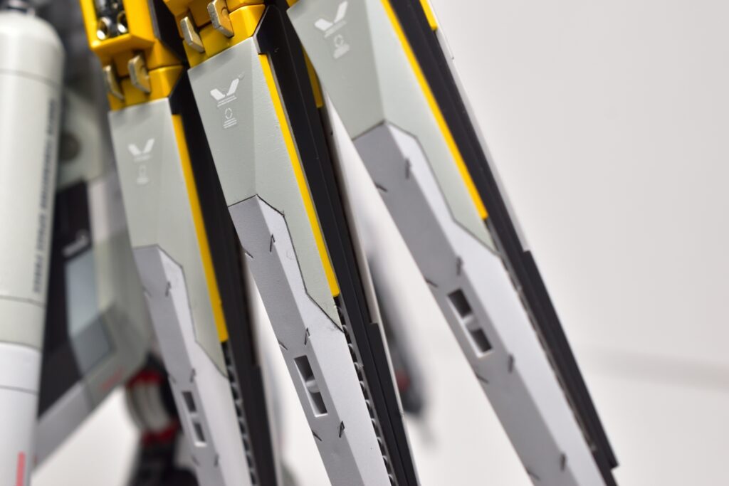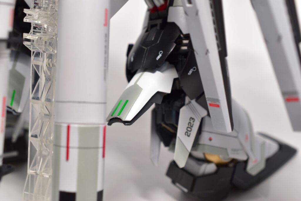 細部のディテールアップはかなり手を入れています。膝関節にはマイナスモールドを埋め込み、膝裏のパイプをシルバーと赤で塗り分けました。アーマーにはレッドチップを取り付け、モールドを追加。バーニアはシルバーとゴールドで塗り分け、脚外装にもモールドを追加し、蛍光グリーンのチップを取り付けています。