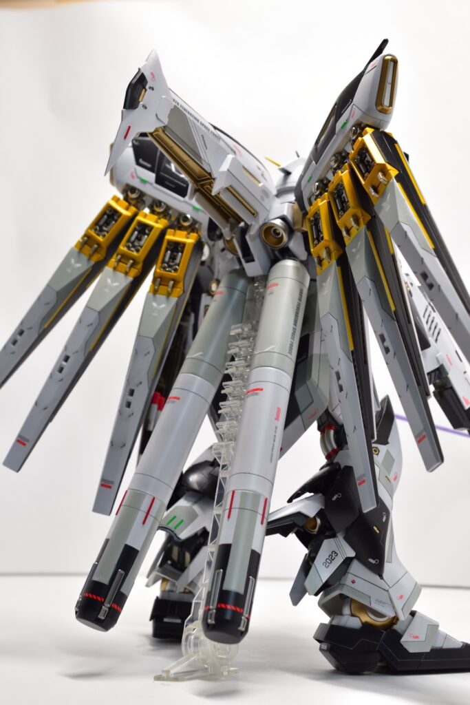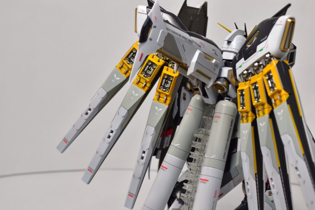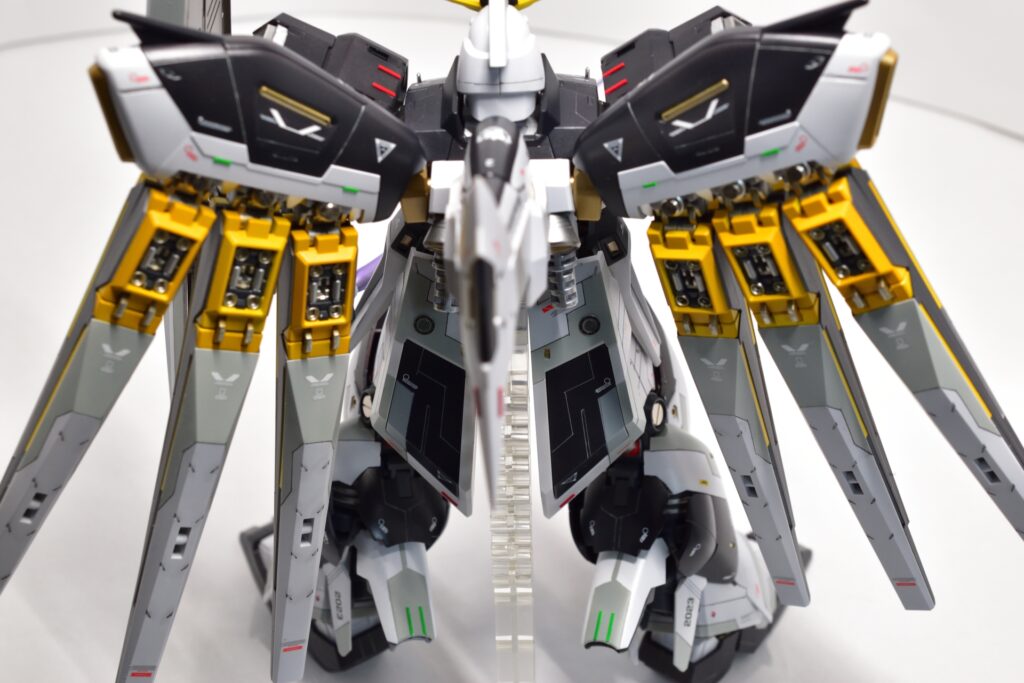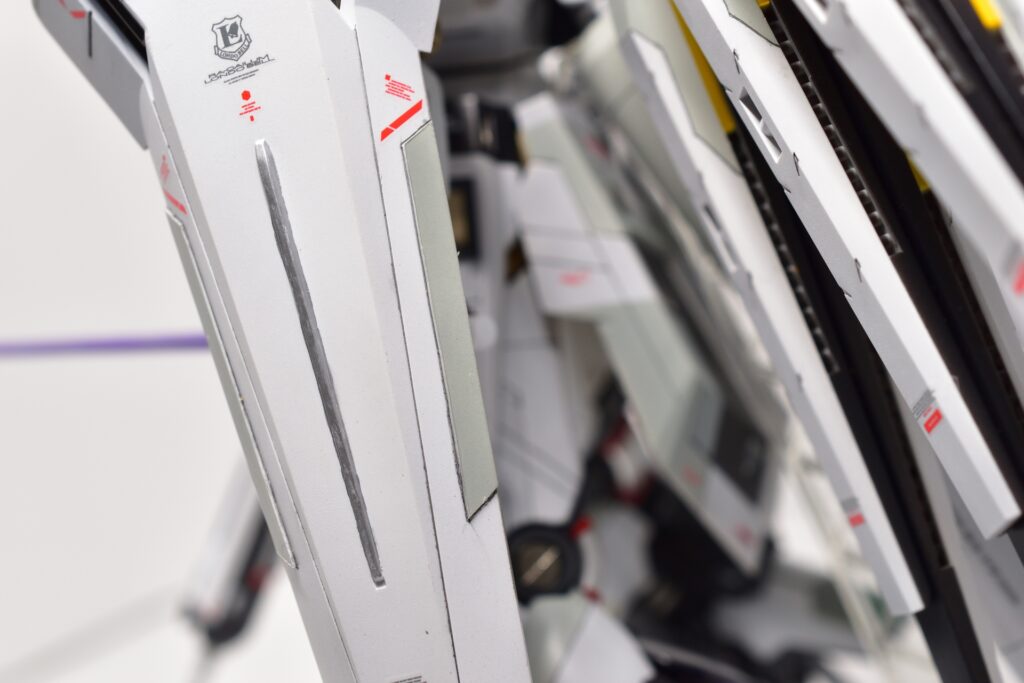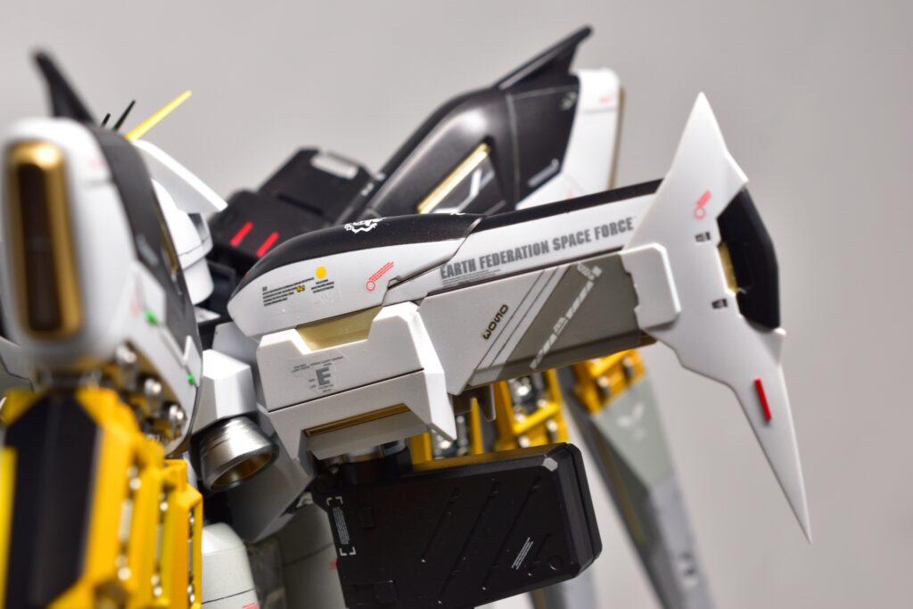 シールド部分は非常に手を入れました。初期状態は平坦だったため、プラバンでディテールアップを行い、段差をつけることで立体感を出しました。モールドを追加し、グレーで塗り分けています。バックパックはモールドを追加して、レッドチップも取り付けました。背面は特に手間をかけ、ファンネルにモールドを追加してグレーで塗り分け、ファンネルの付け根にマイナスモールドを埋め込んでいます。ファンネルの黄色枠のパーツはシルバーとゴールドで塗り分け、プロペラントタンクにもモールドを追加し、レッドチップを追加しています。