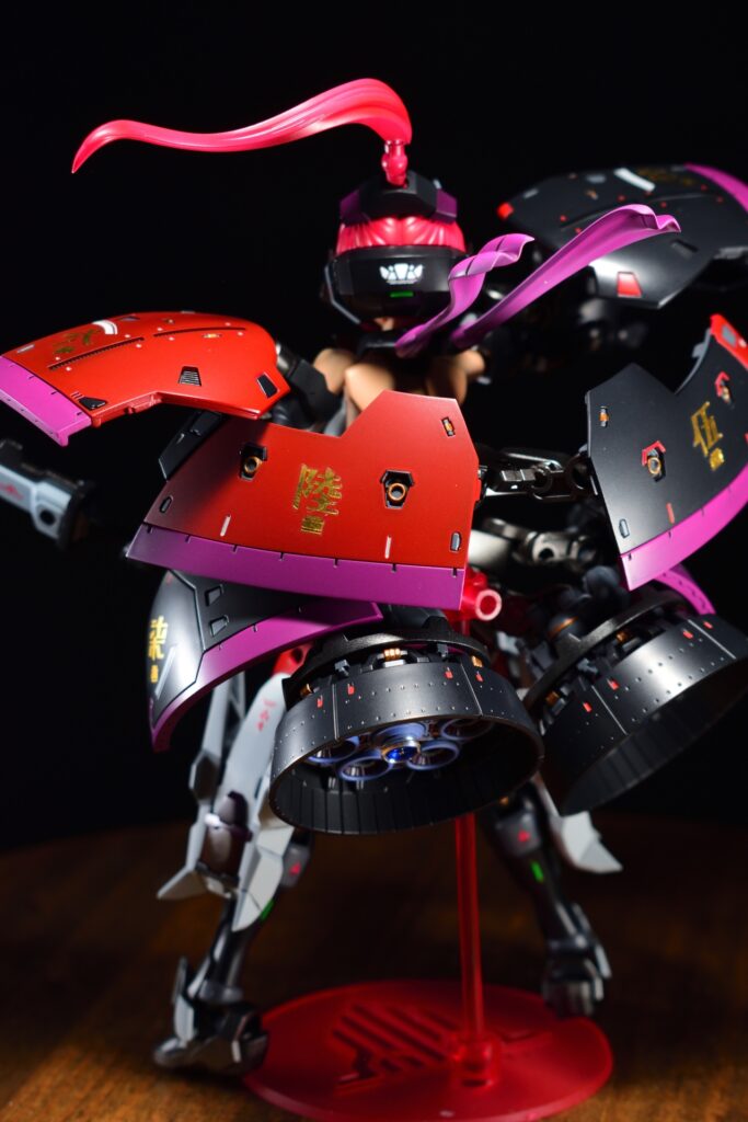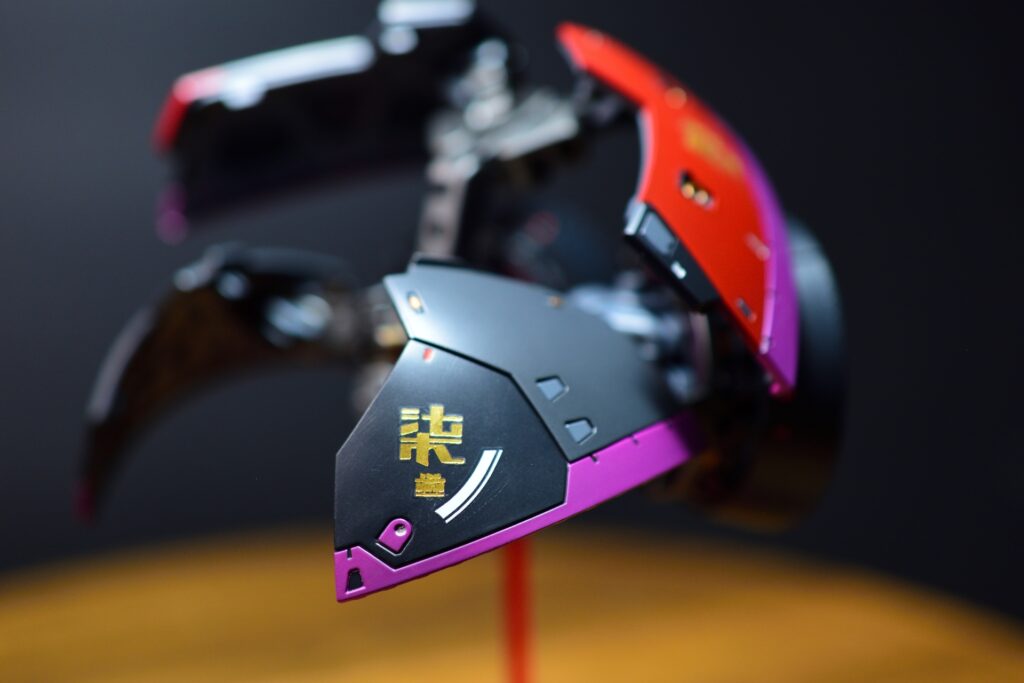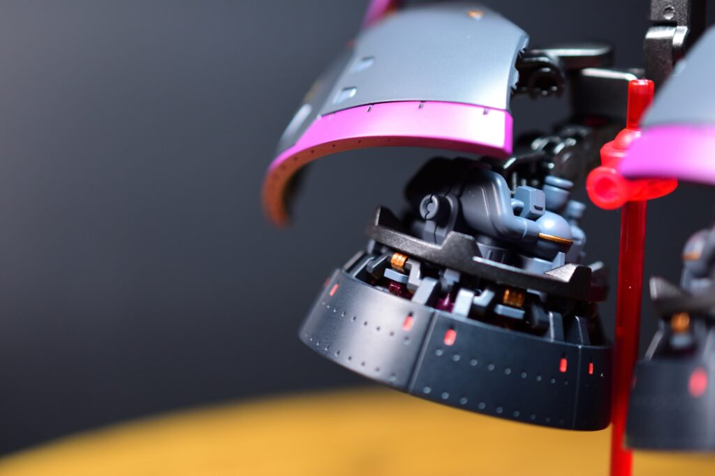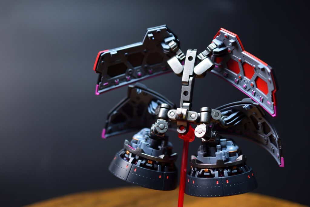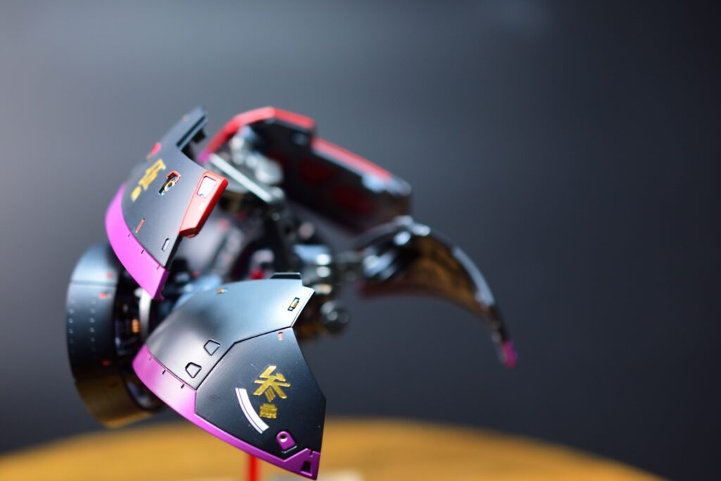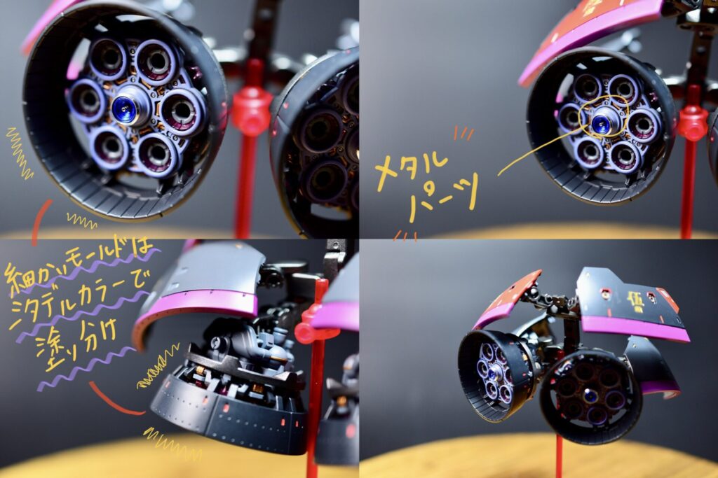 装甲はフレキシブルに動くため、防御形態、展開形態、飛行形態など自由にアレンジ可能です。また、ブースターも角度変更ができます。ブースターや装甲の細かいモールドは、マスキングでは塗り分けが難しかったため、シタデルカラーを用いて筆塗りしました。