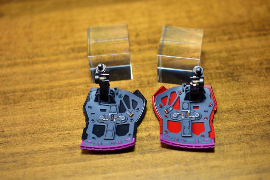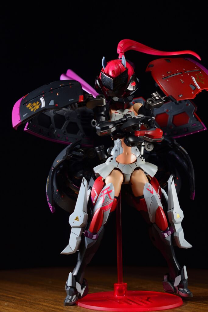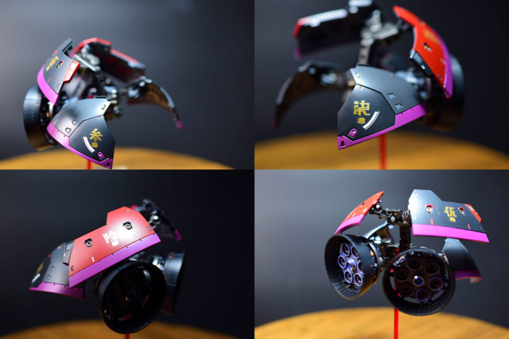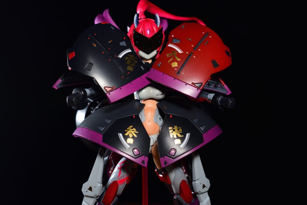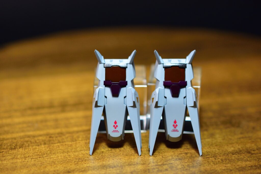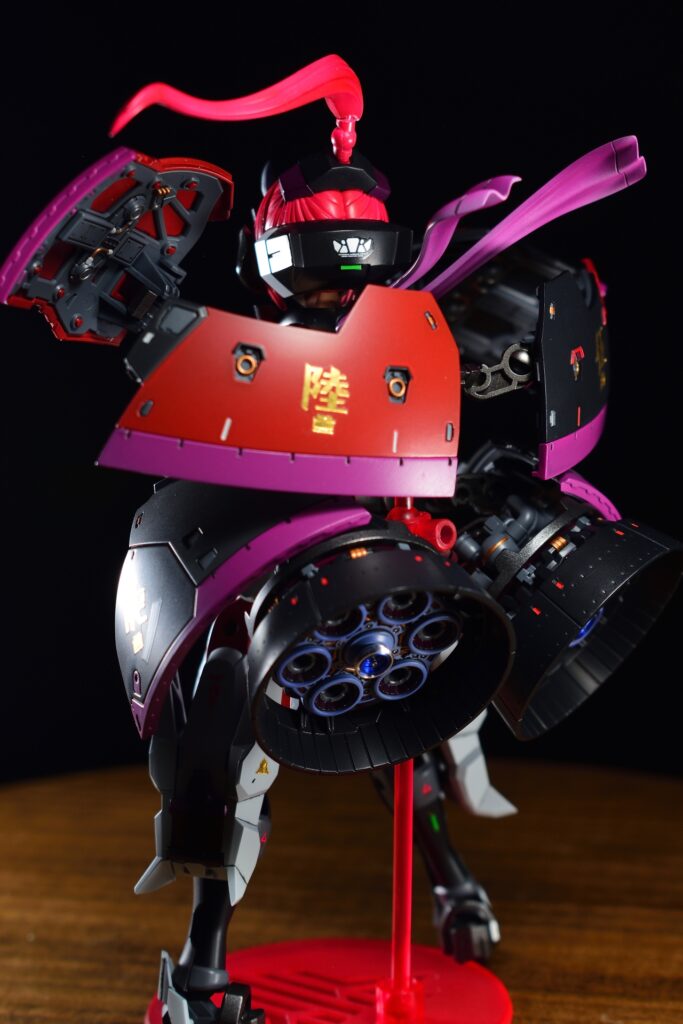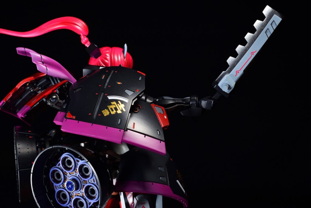 装甲はフレキシブルに動くため、防御形態、展開形態、飛行形態など自由にアレンジ可能です。また、ブースターも角度変更ができます。ブースターや装甲の細かいモールドは、マスキングでは塗り分けが難しかったため、シタデルカラーを用いて筆塗りしました。