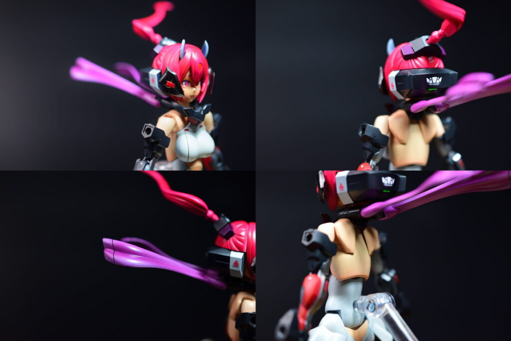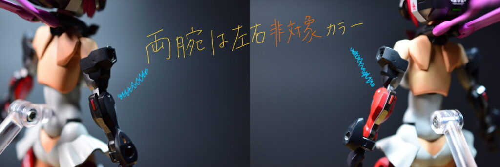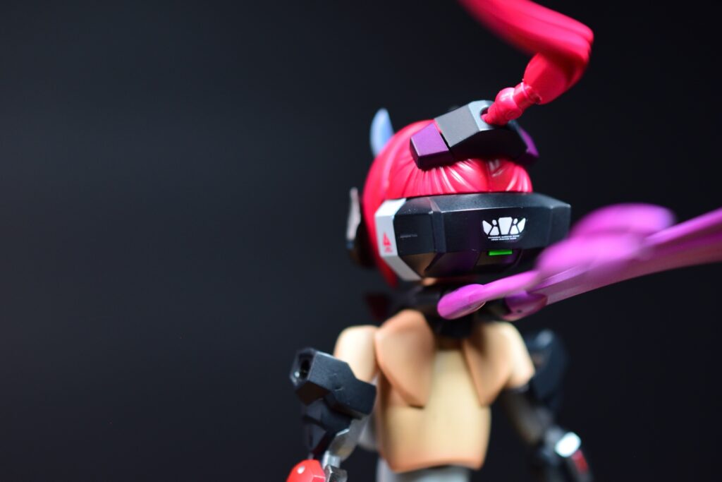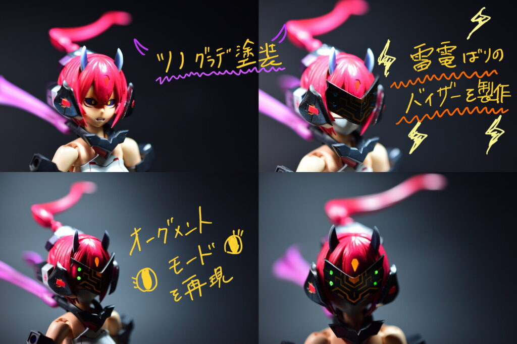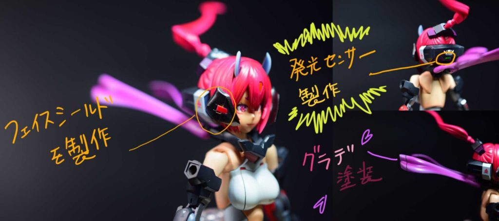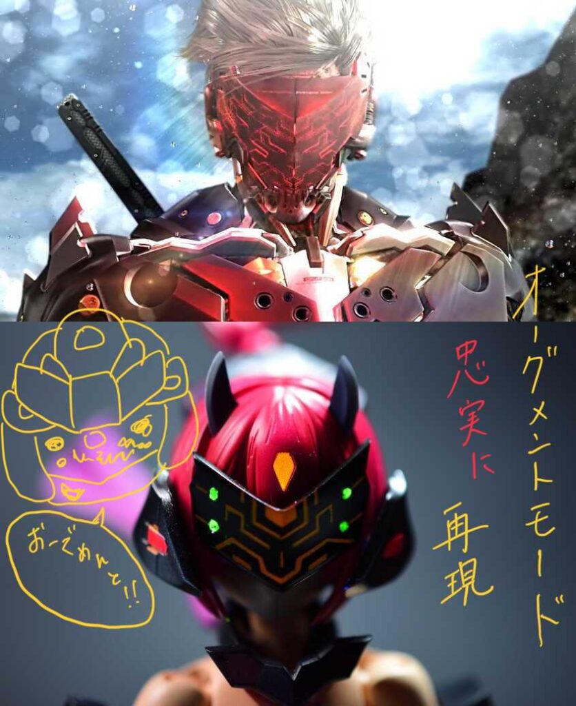 この作品で欠かせないのが、顔の バイザーとフェイスシールド です。『METAL GEAR RISING』の主要キャラクターが装着するギミックを取り入れ、戦闘開始時に「カチャン」と動くバイザーをイメージしました。