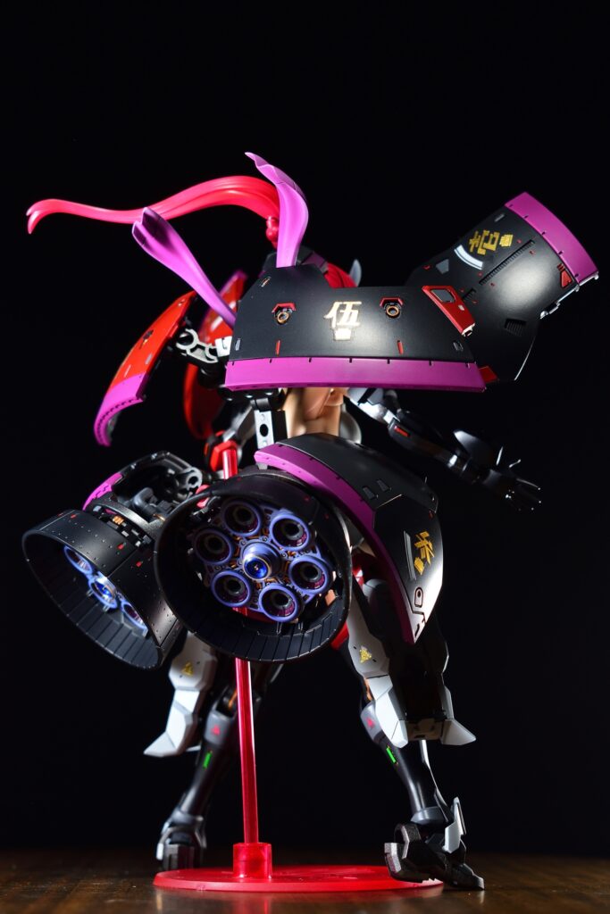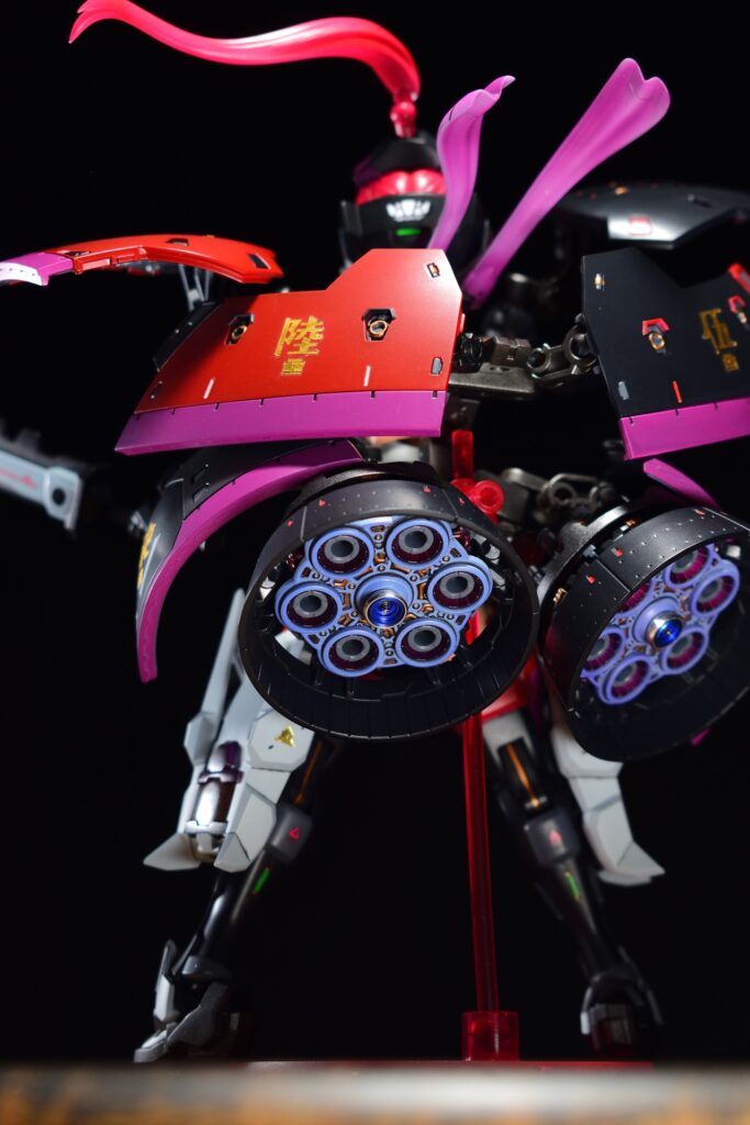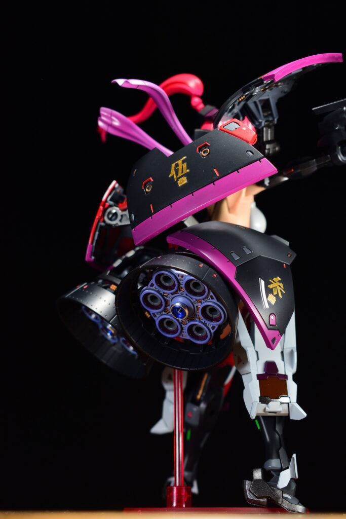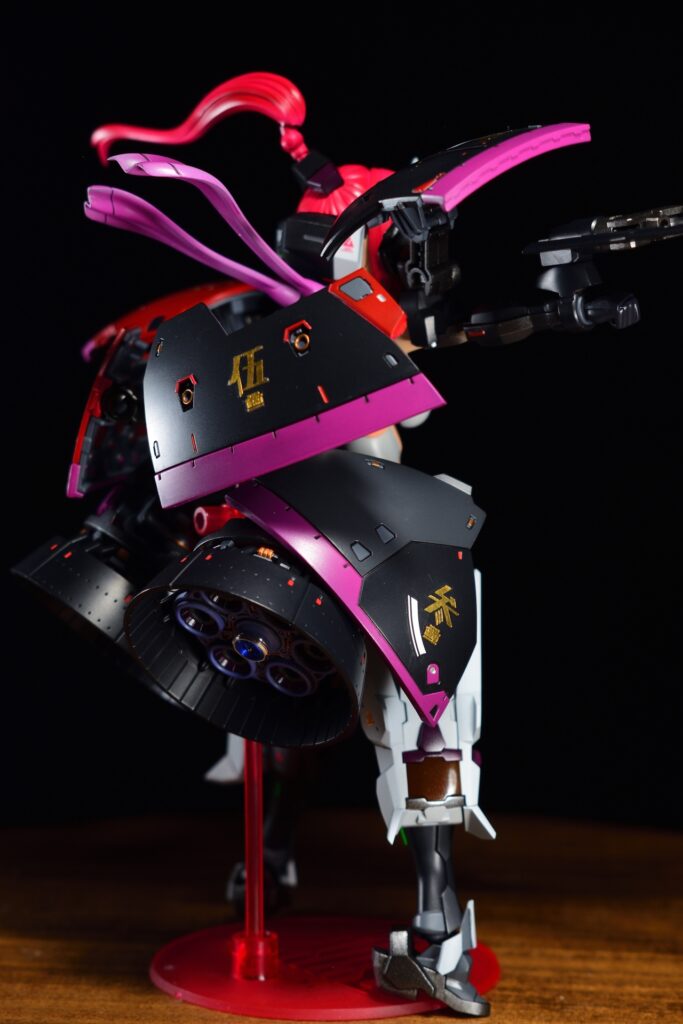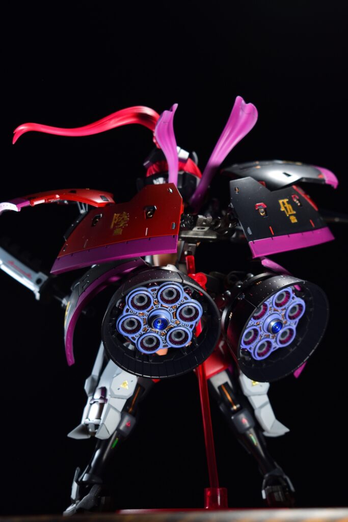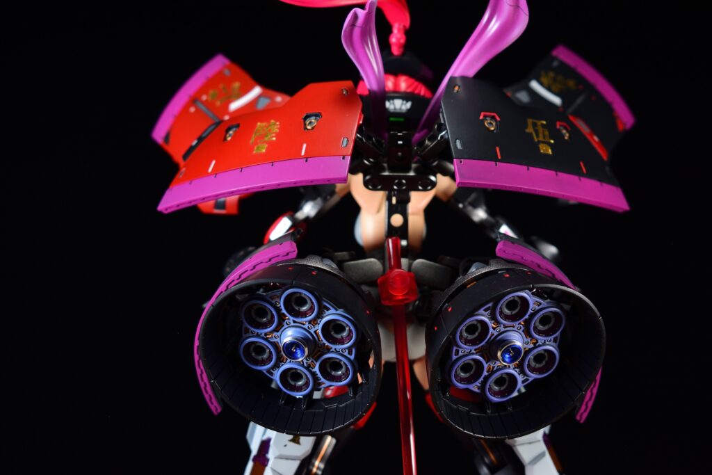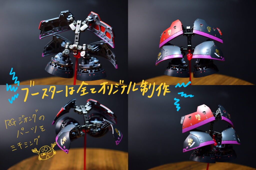 ミキシング元は RGジオング で、スカート部分とブースター2基を使用。これを可変式ジョイントで接続し、アスラの背部に取り付けられるように製作しました。