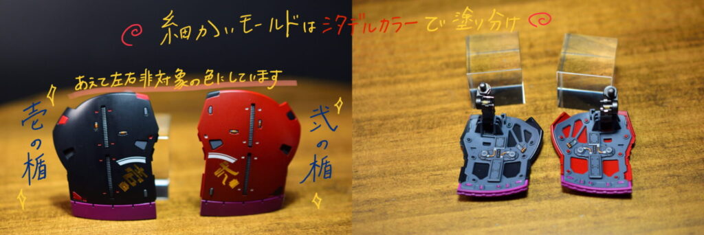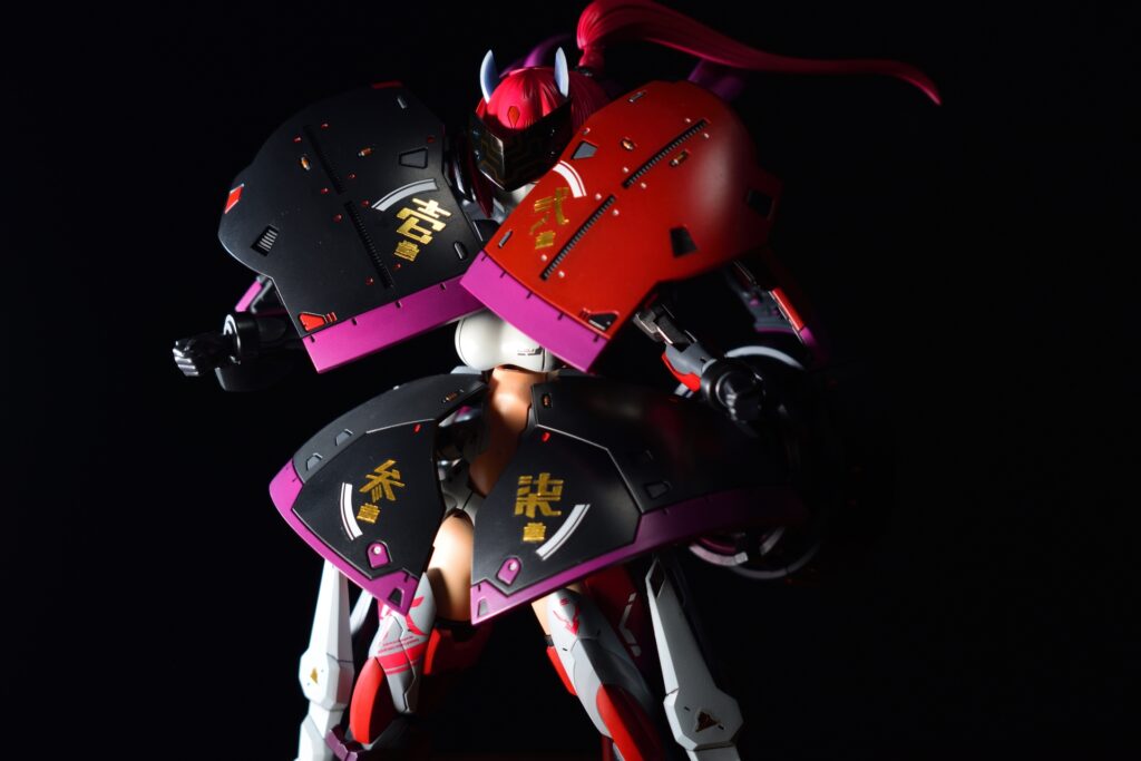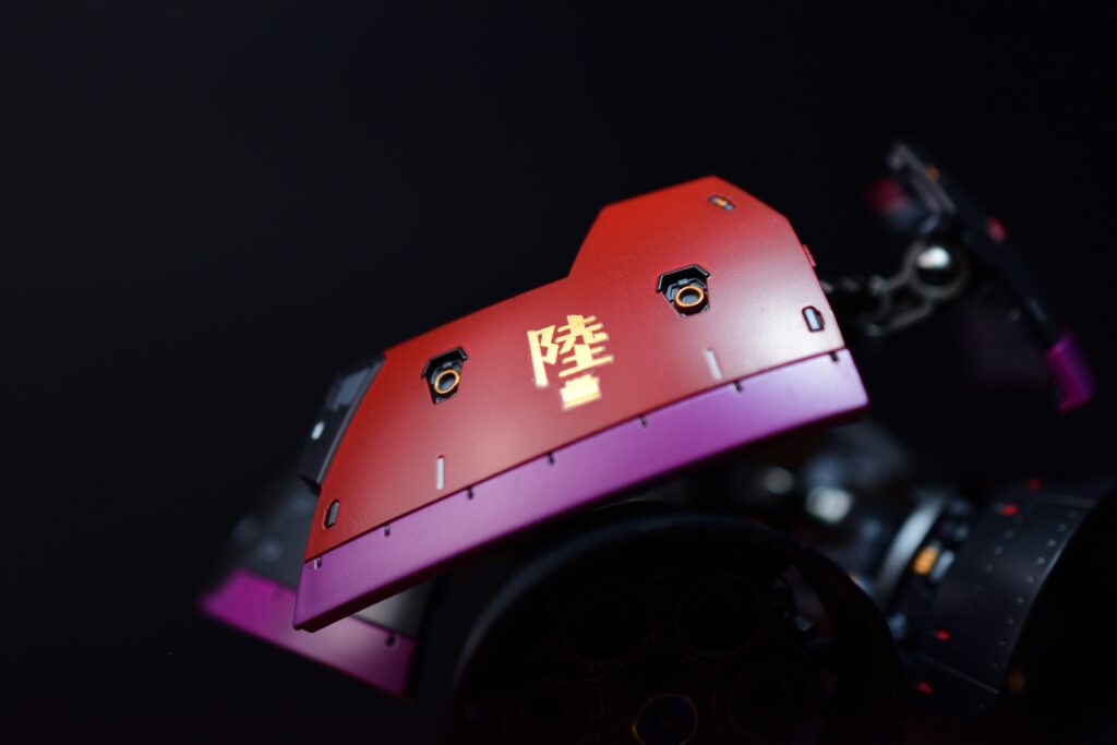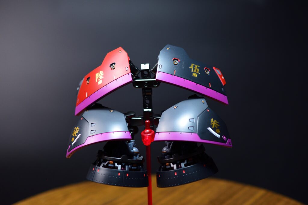 ジオングのスカート部分は、BOSSキャラクター「サンダウナー」の 【爆発反応装甲】 を再現しています。この武装は、防御時に攻撃を受けた相手にダメージを与える仕組みで、装甲は計6枚。和風の要素を取り入れた名前 【壱の楯~陸の楯】 をデカールで明記しました。