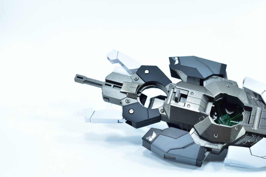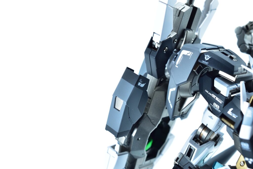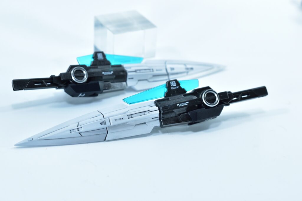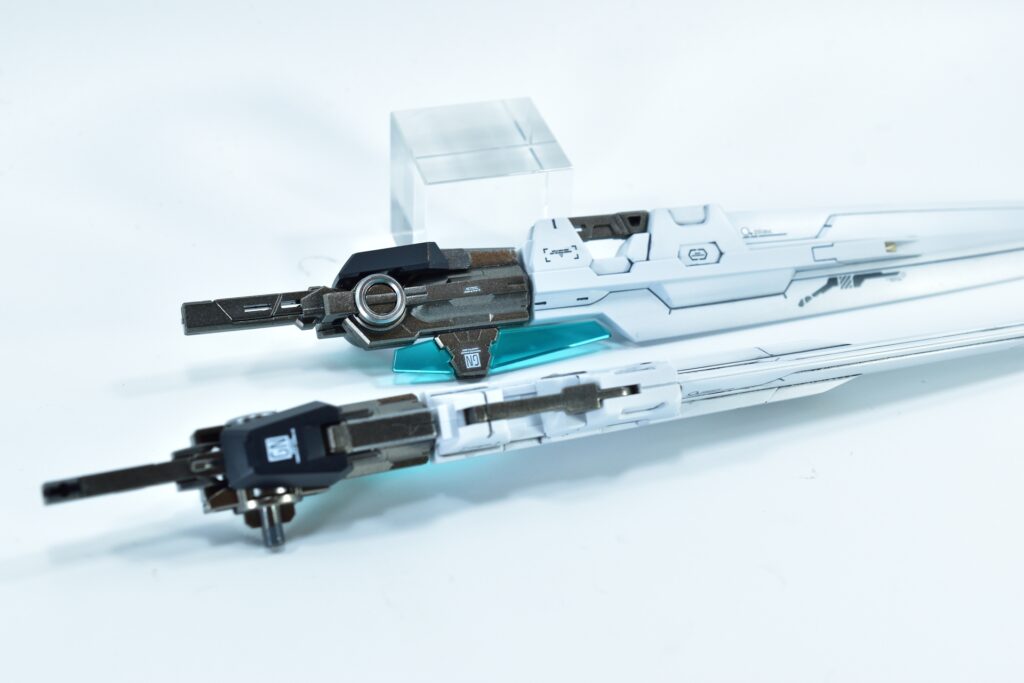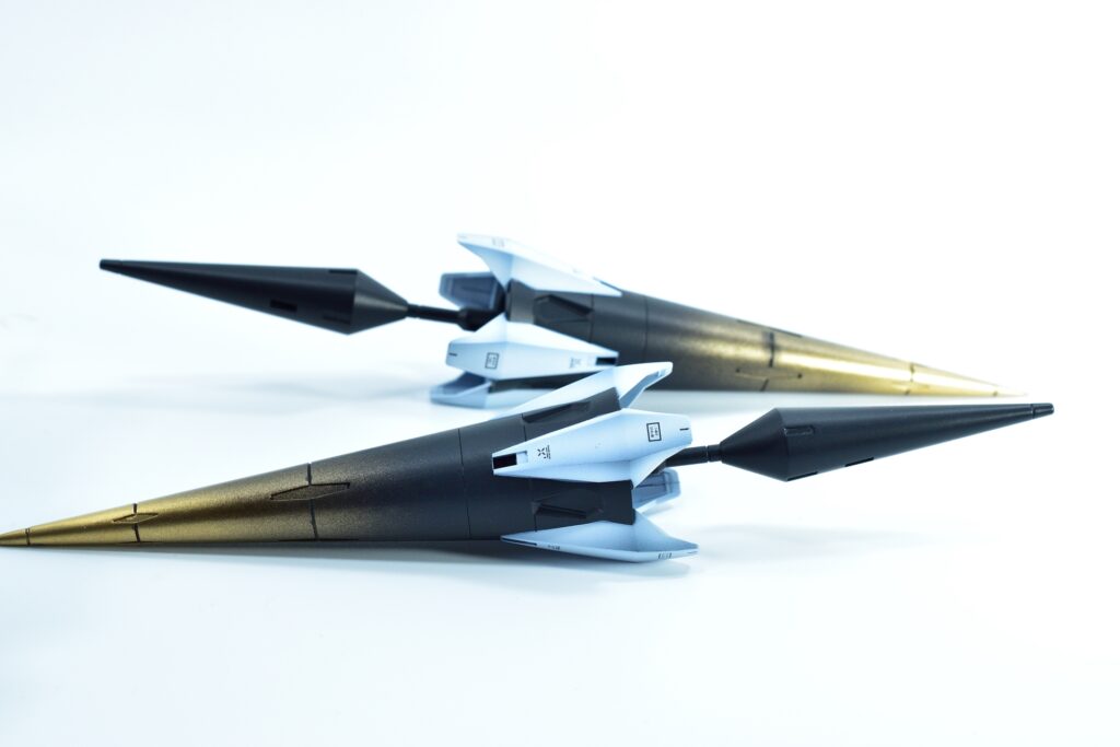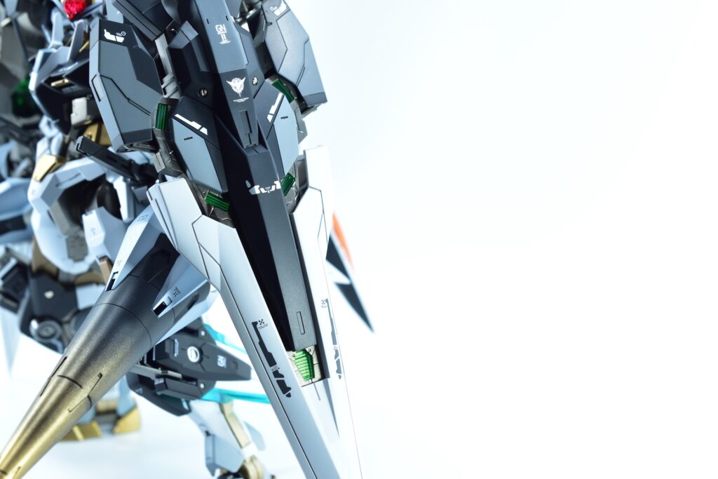 各所にメタルパーツを埋め込み、高級感と機械的な雰囲気をプラスしました。特にバーニアや武器部分に効果的に配置しています。