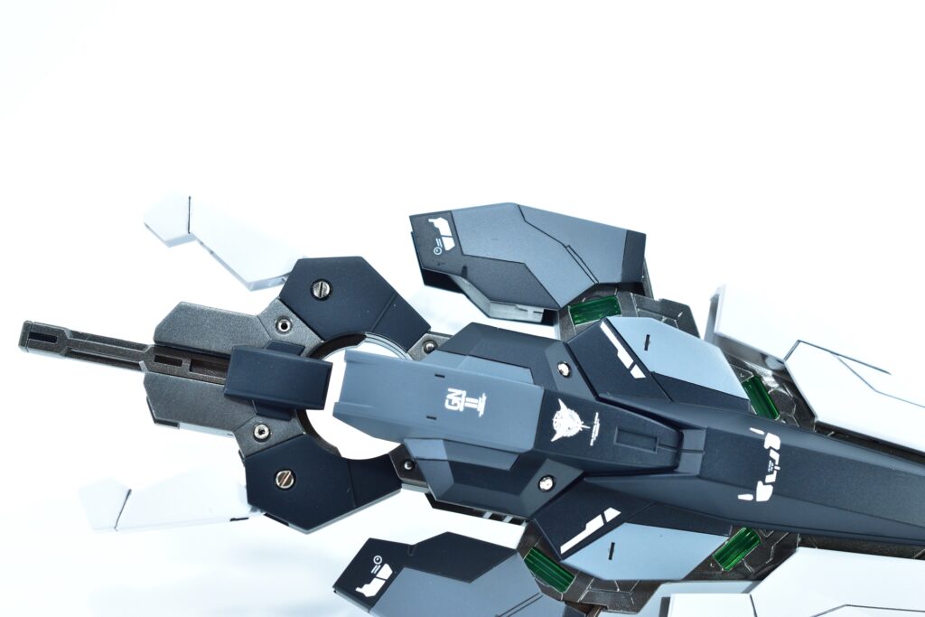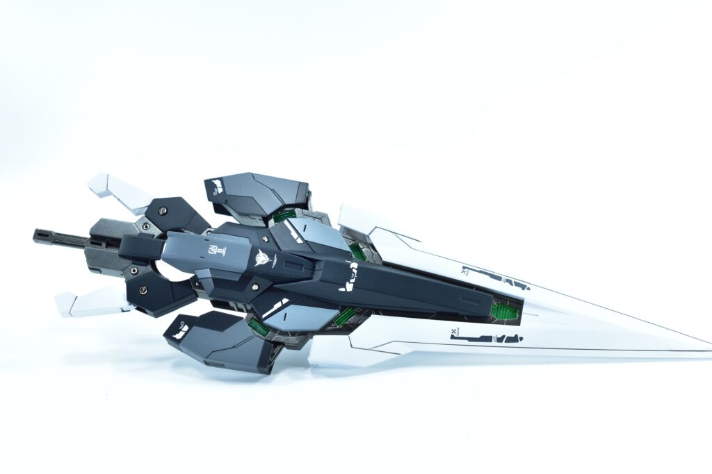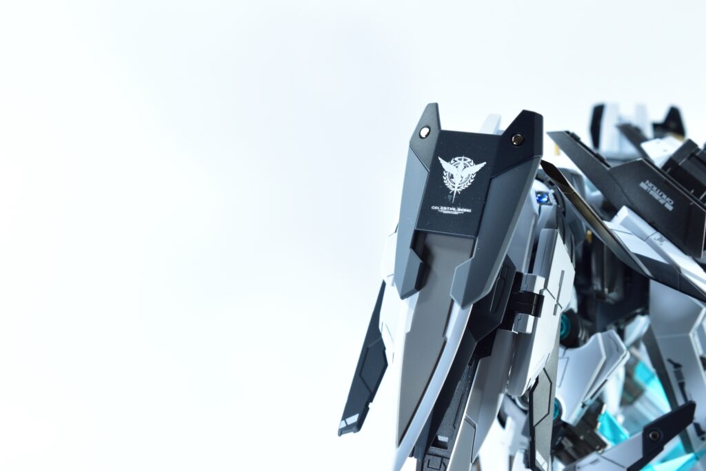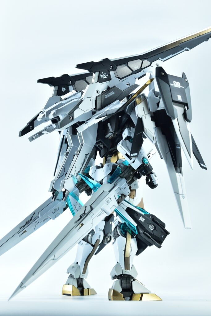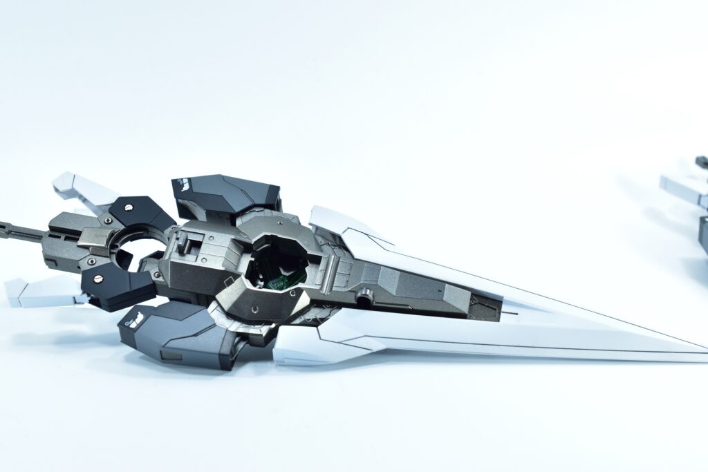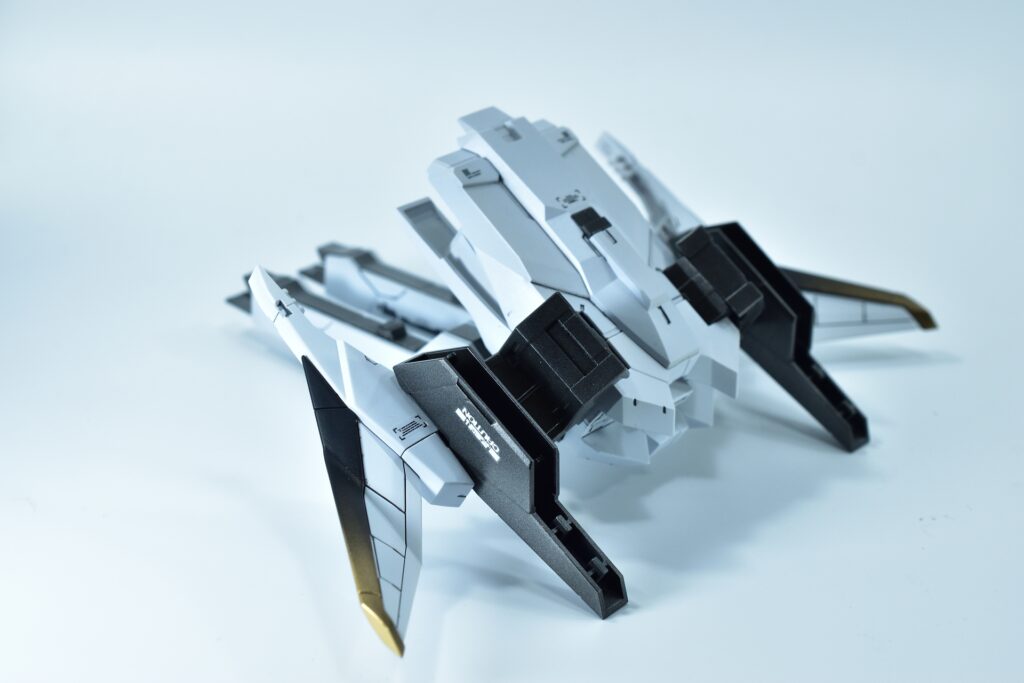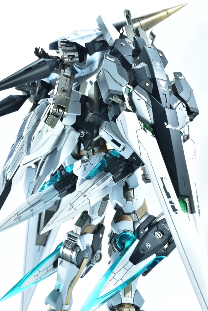 各所にメタルパーツを埋め込み、高級感と機械的な雰囲気をプラスしました。特にバーニアや武器部分に効果的に配置しています。