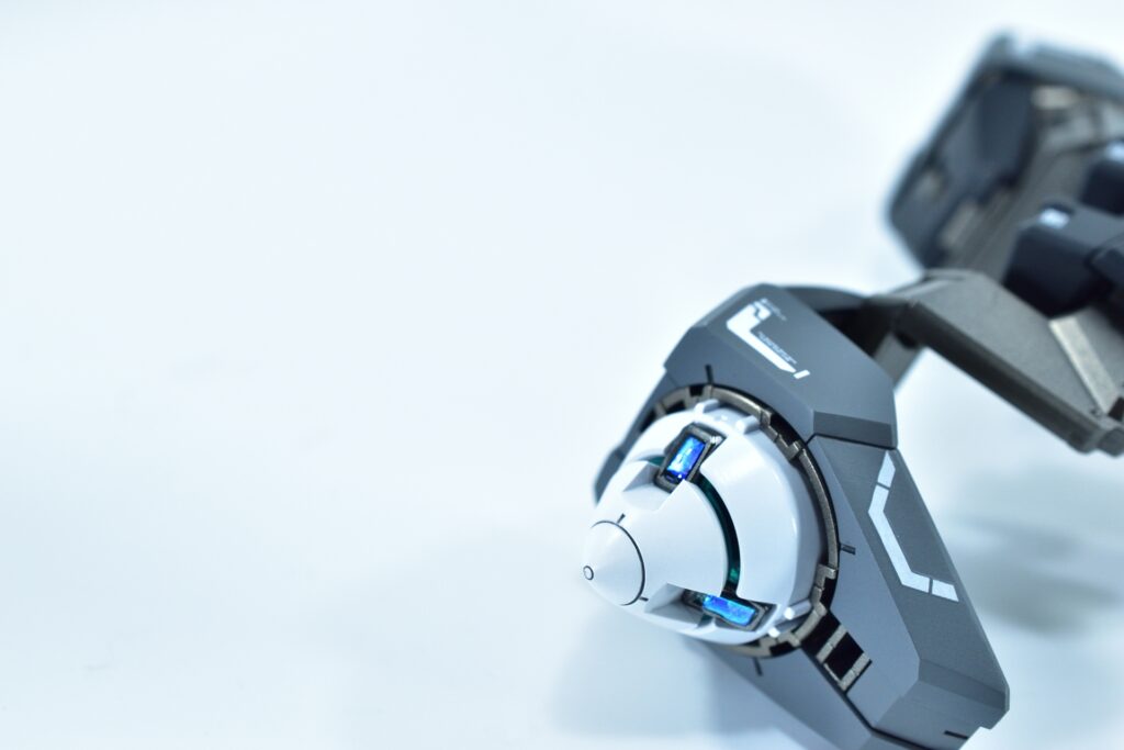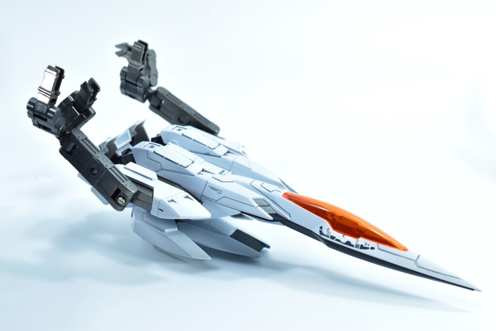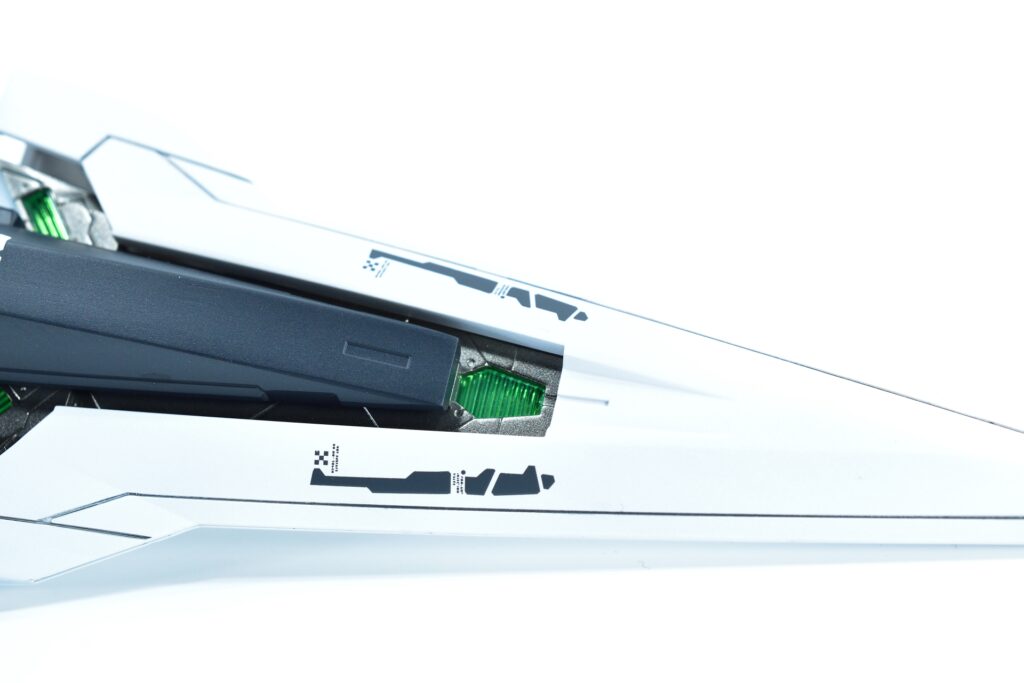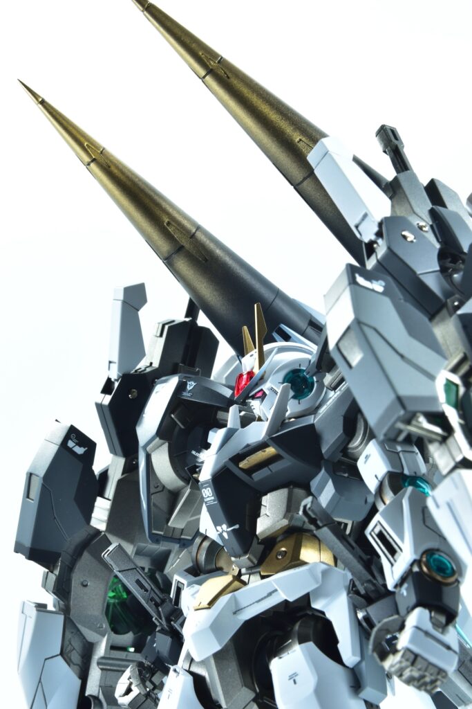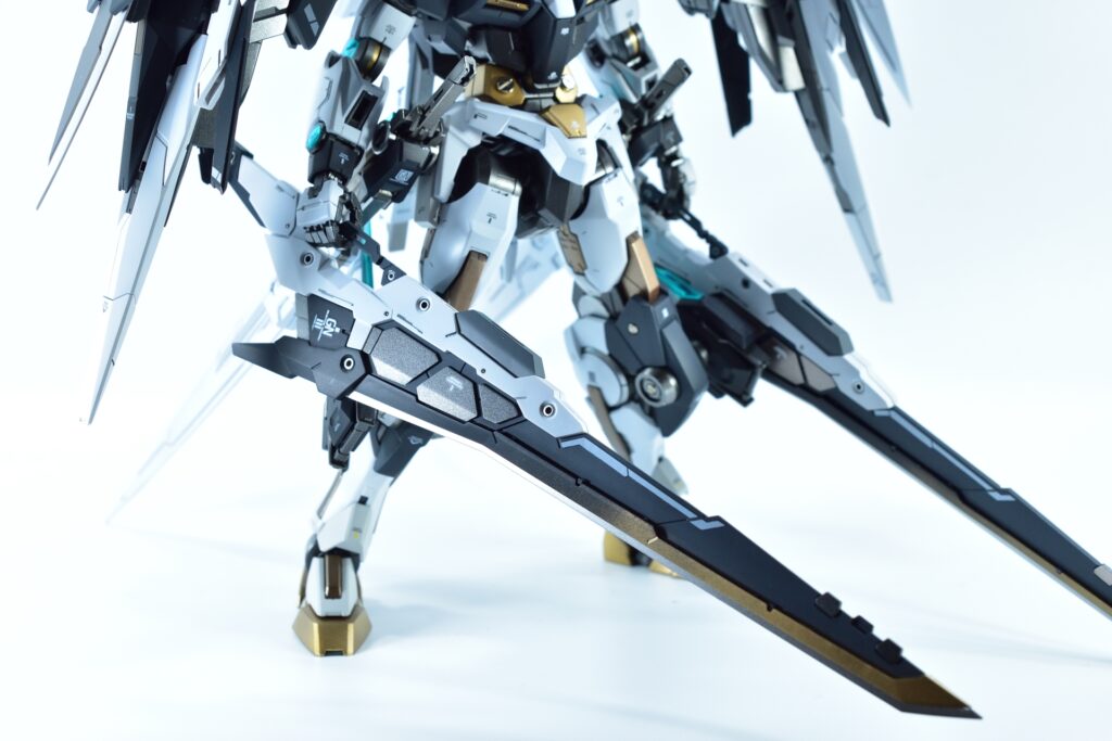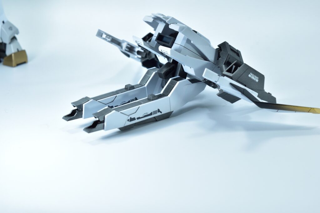 各所にメタルパーツを埋め込み、高級感と機械的な雰囲気をプラスしました。特にバーニアや武器部分に効果的に配置しています。