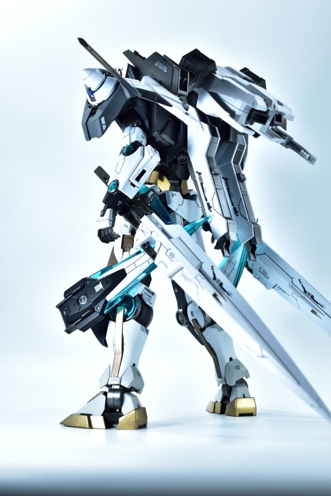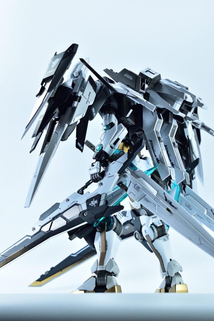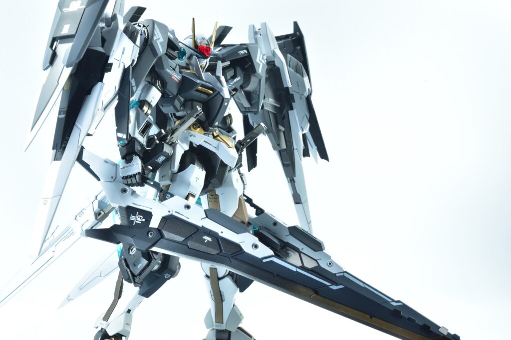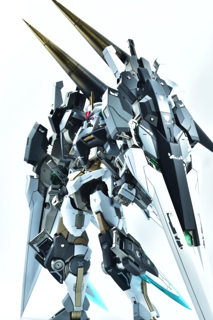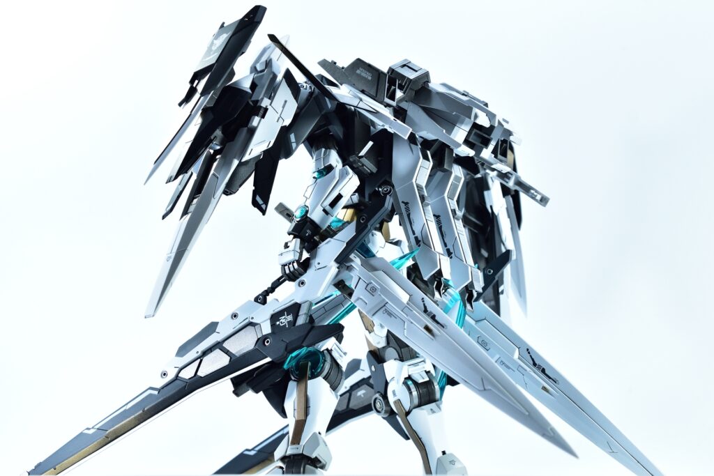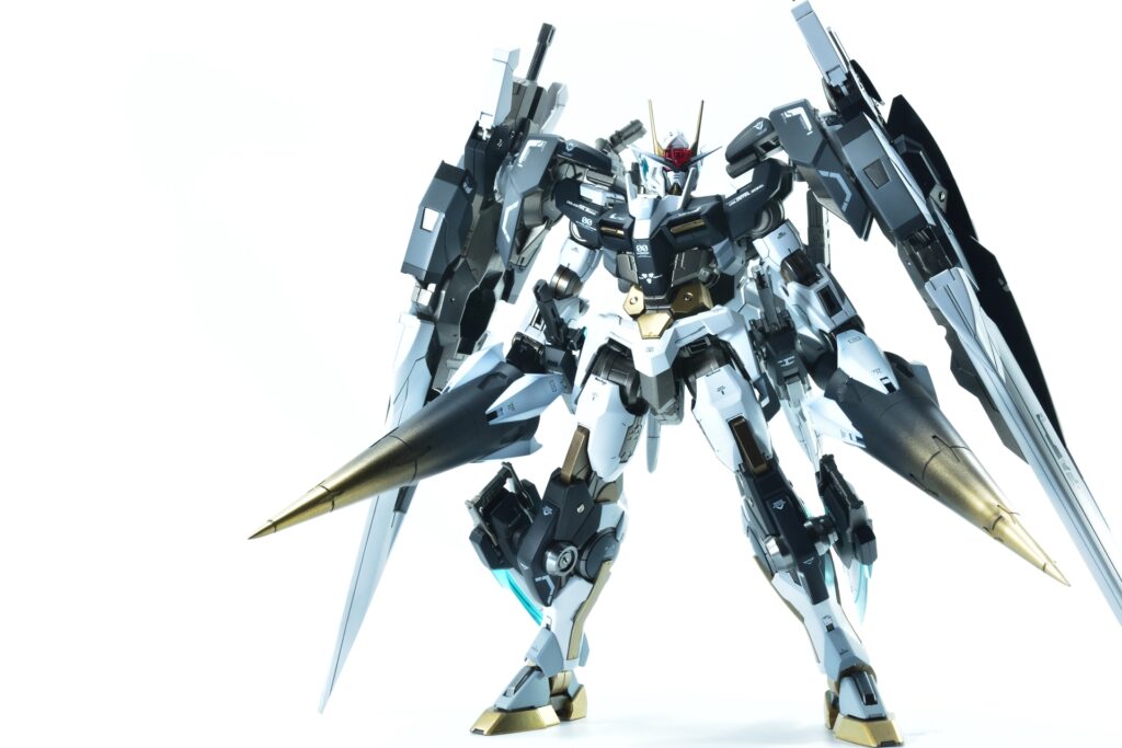 武装をフル装備した際の重量感や存在感はもちろん、スタンドなしで自立できるバランスの良さにもこだわりました。腰関節の補強やジョイント追加といった改造を通じて、見た目の美しさだけでなく実用性も兼ね備えた作品に仕上げています。