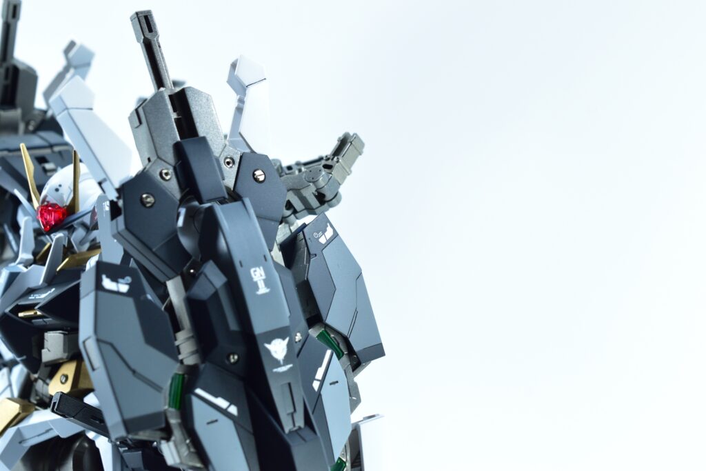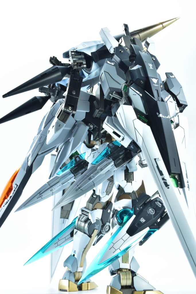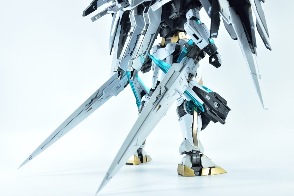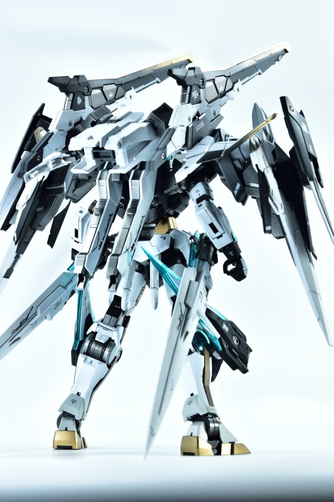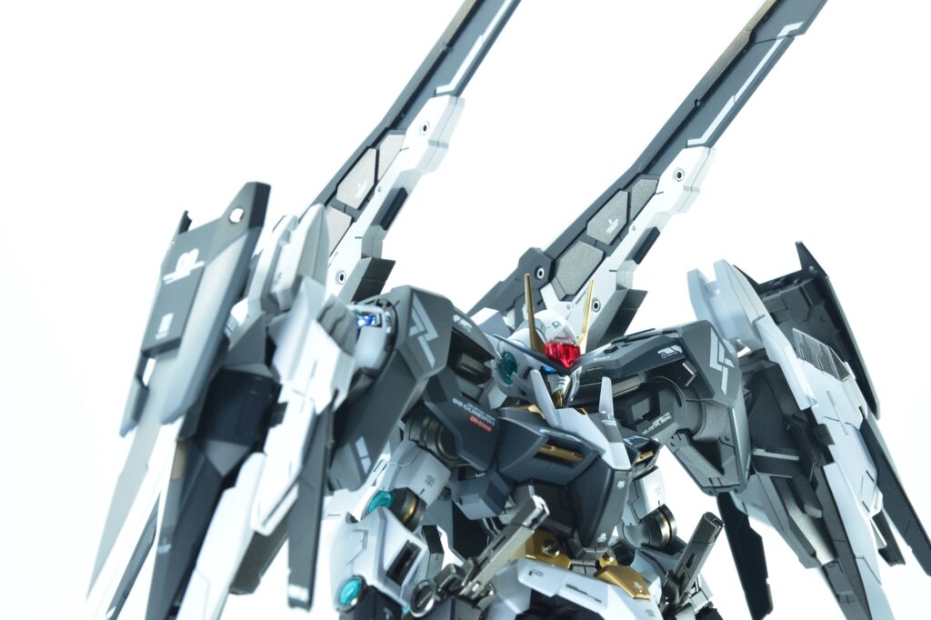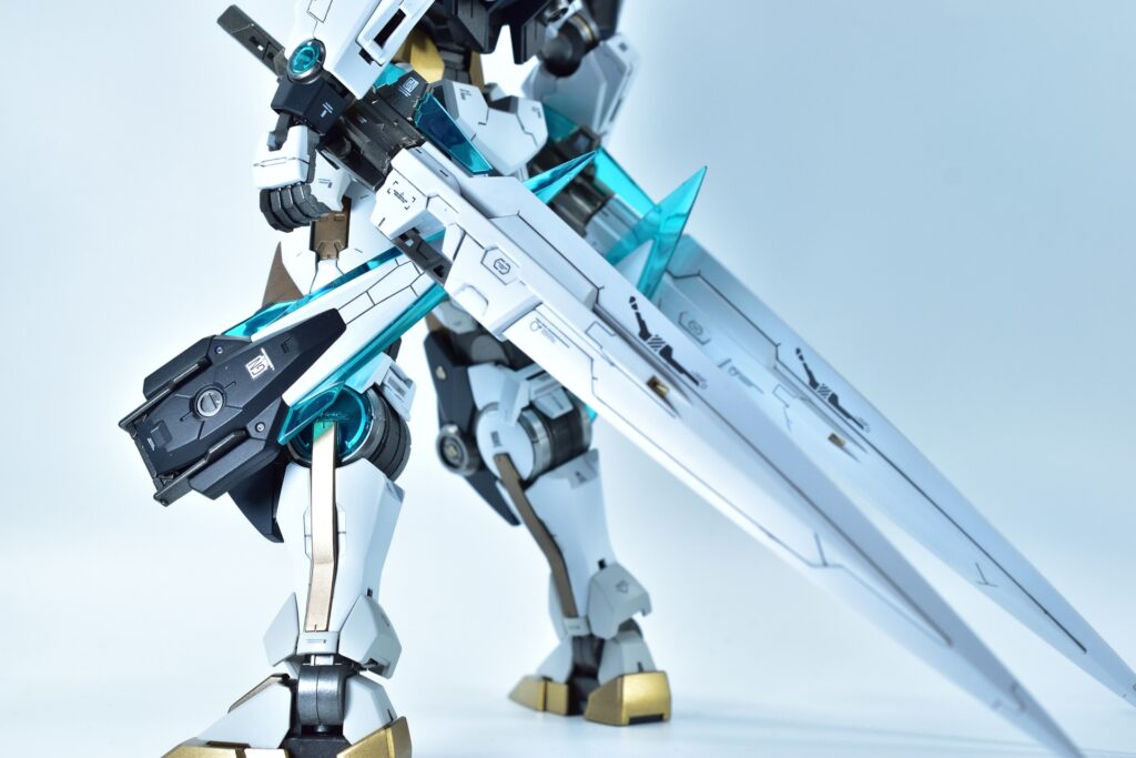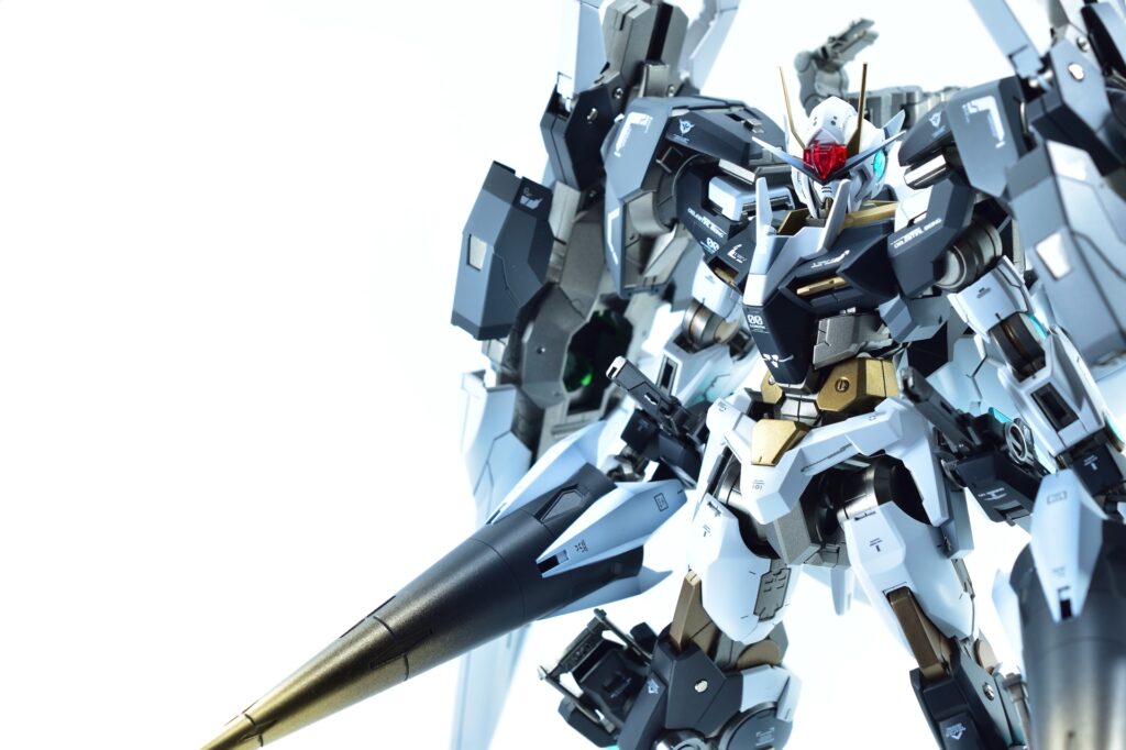 武装をフル装備した際の重量感や存在感はもちろん、スタンドなしで自立できるバランスの良さにもこだわりました。腰関節の補強やジョイント追加といった改造を通じて、見た目の美しさだけでなく実用性も兼ね備えた作品に仕上げています。
