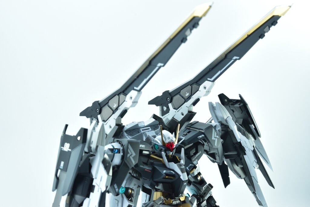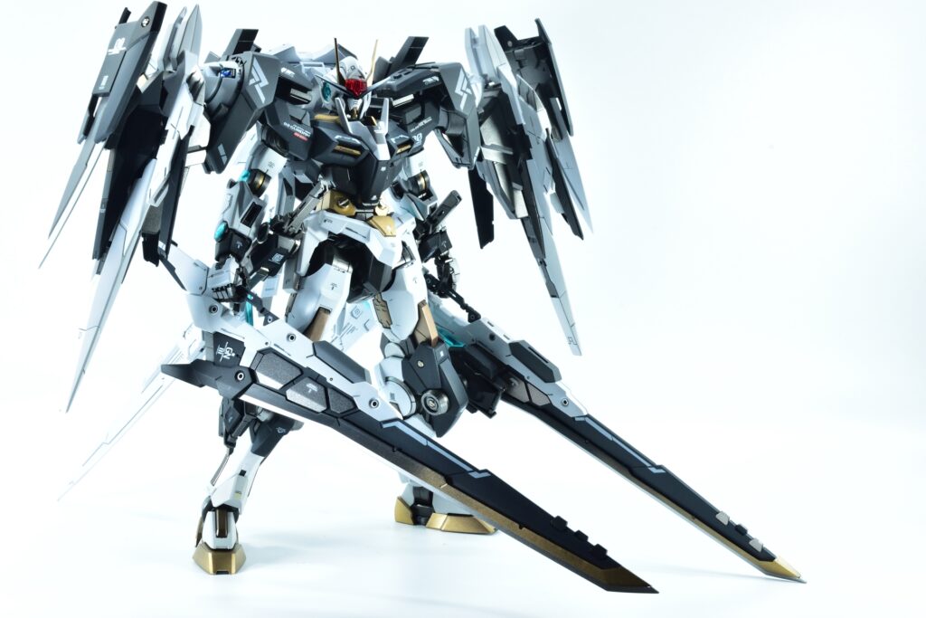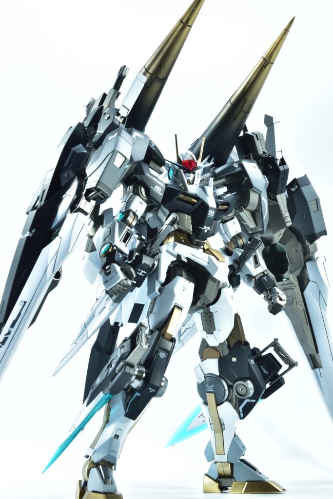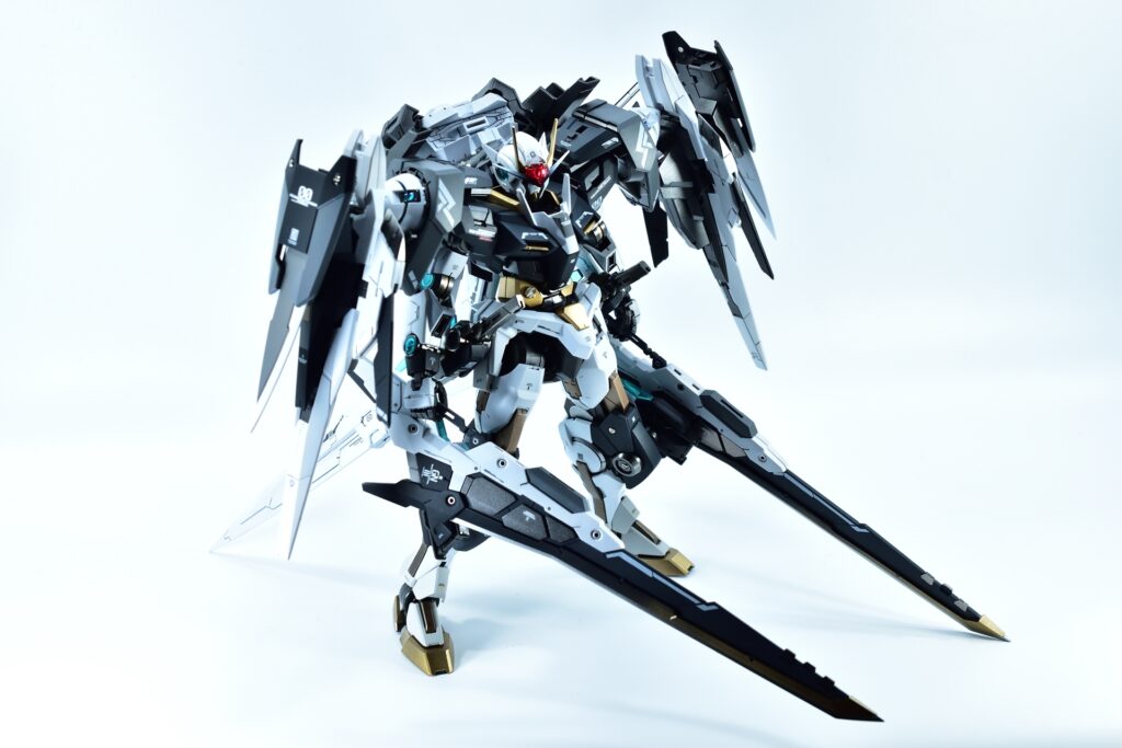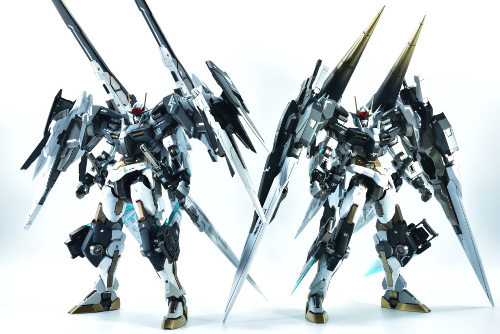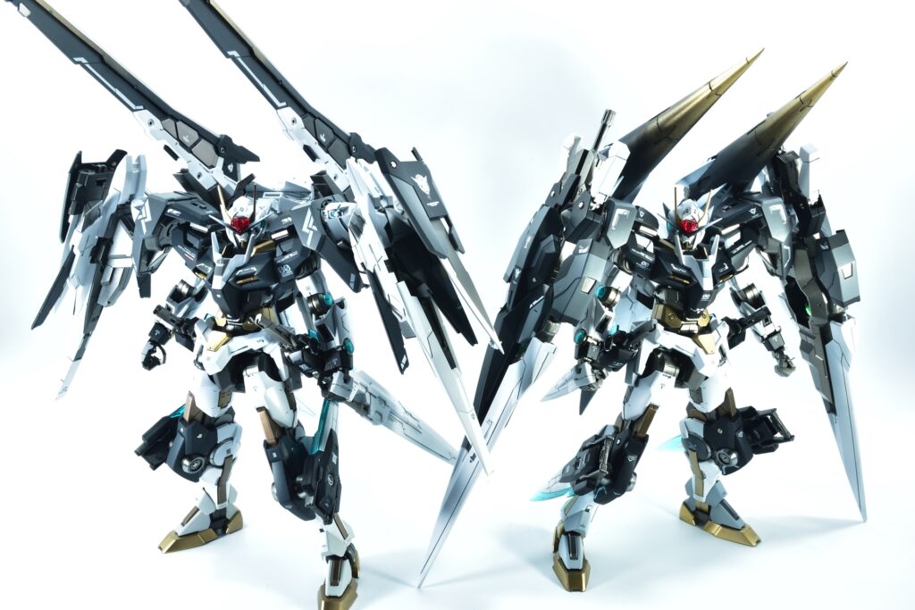 今回制作したのは、MGダブルオーザンライザーとMGダブルオーガンダムセブンソード/Gをベースにミキシングを施し、姉妹機として仕上げたオリジナルカスタム作品です。二機を同時進行で制作し、統一感のあるデザインとカラーパターンに仕上げました。