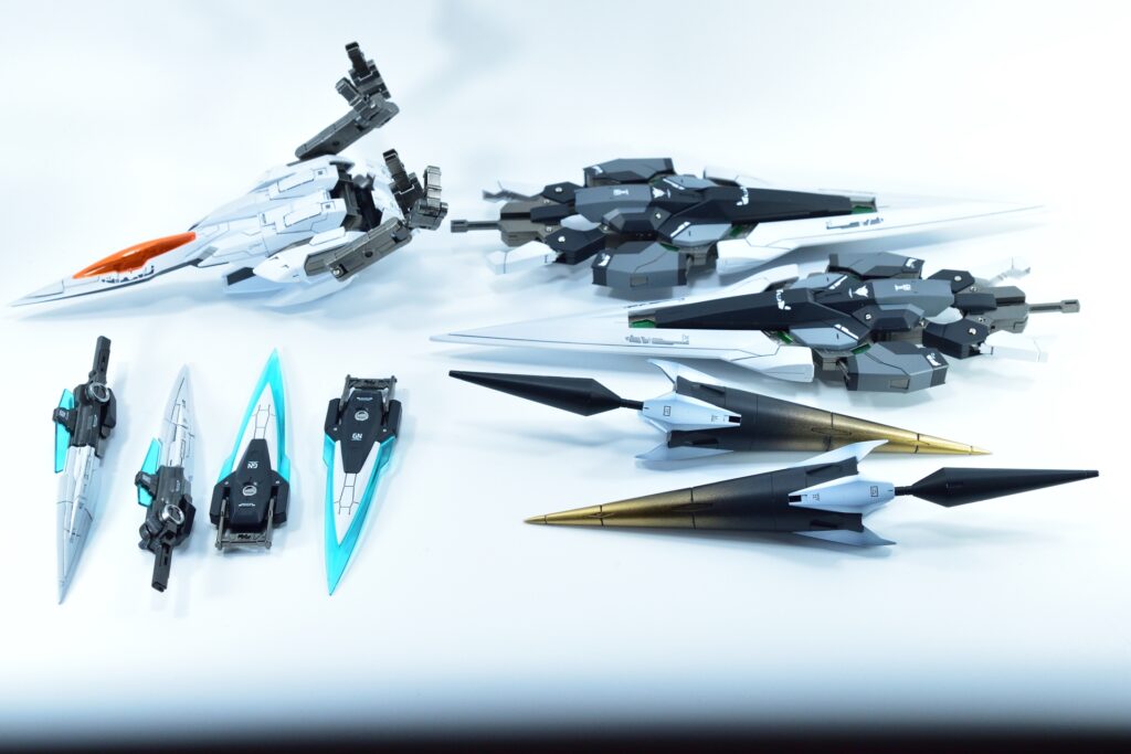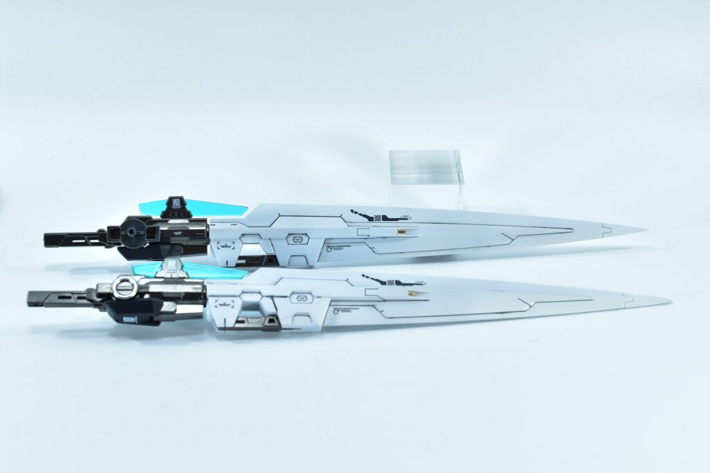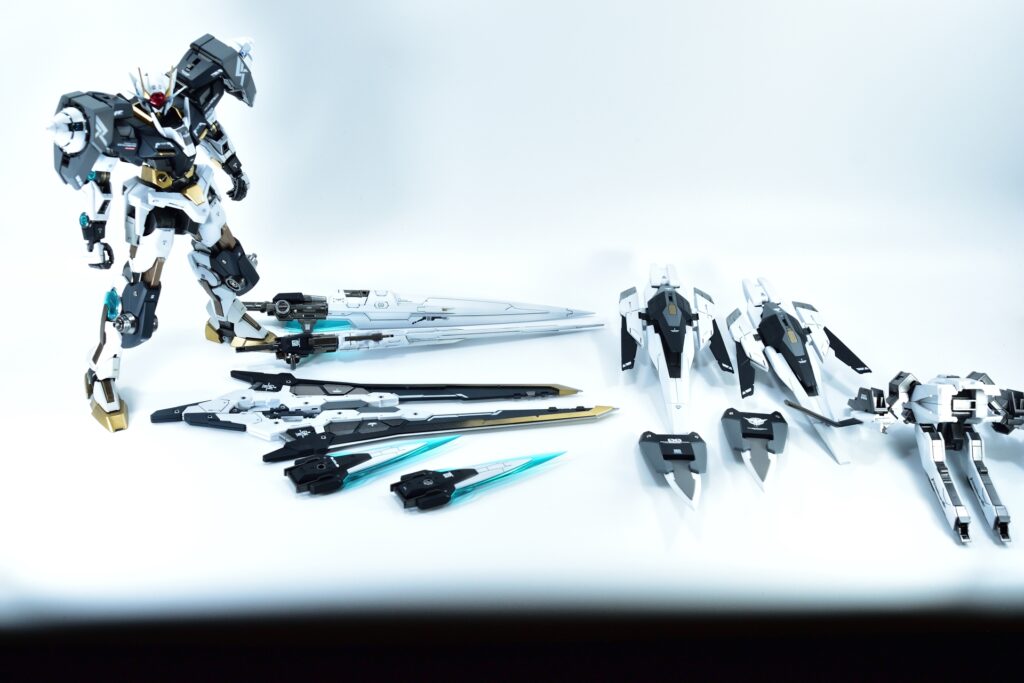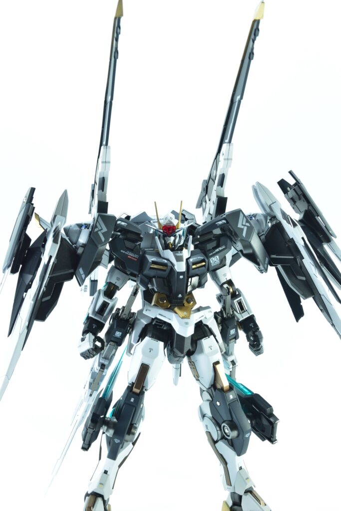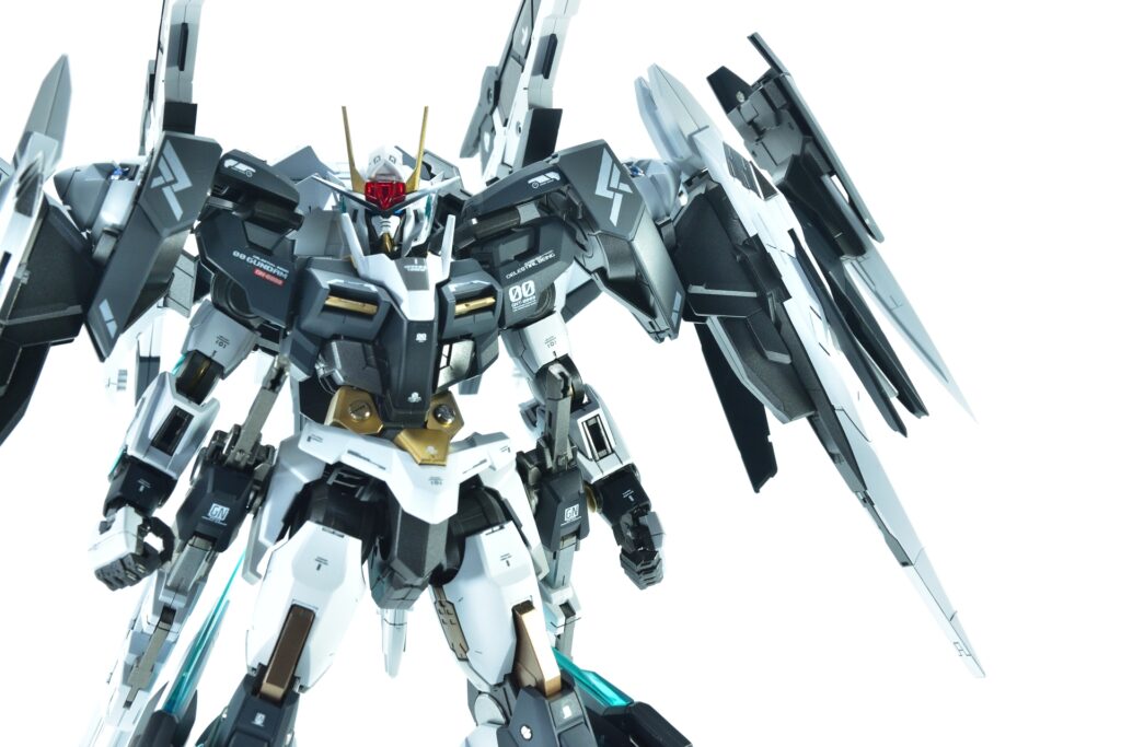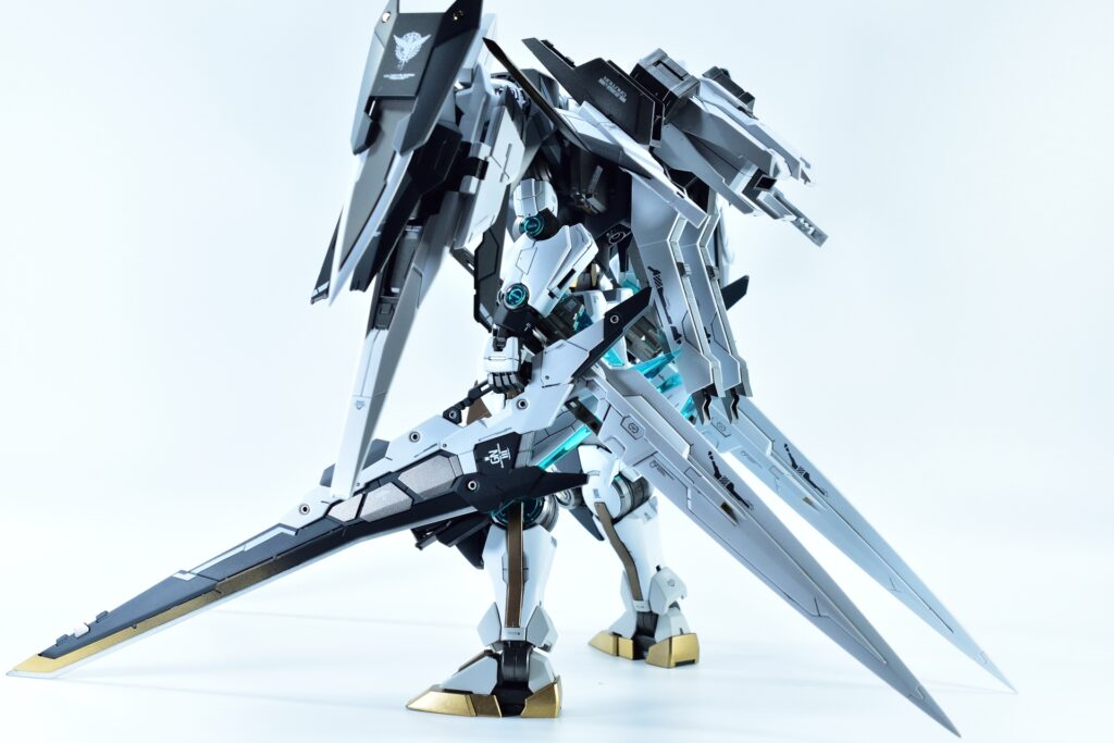 今回制作したのは、MGダブルオーザンライザーとMGダブルオーガンダムセブンソード/Gをベースにミキシングを施し、姉妹機として仕上げたオリジナルカスタム作品です。二機を同時進行で制作し、統一感のあるデザインとカラーパターンに仕上げました。