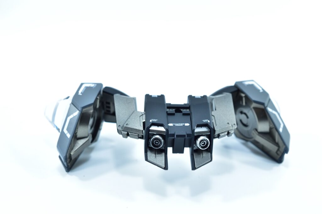 カラーリングは、最近マイブームとなっているモノクロを基調に、一部差し色を配したシンプルながらも目を引く配色。どちらの機体も武装をフル装備しており、重量感がありますが、関節強化によりスタンドなしでの自立が可能です。特に素組の状態では重量バランスが悪く後ろにのけぞるため、腰関節にプラバンを用いてしっかり補強しています。