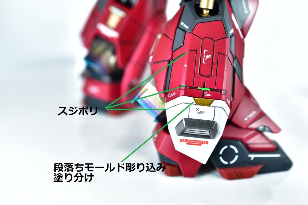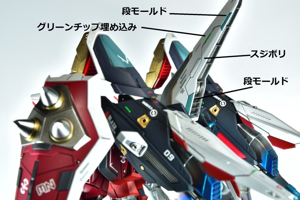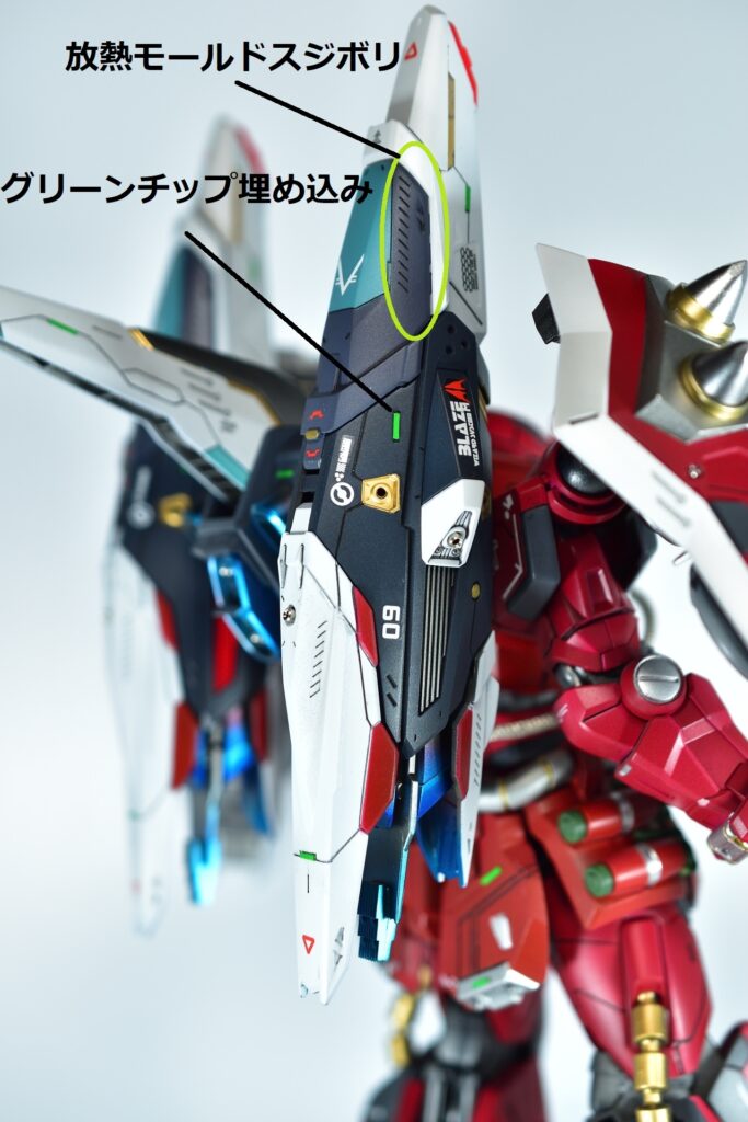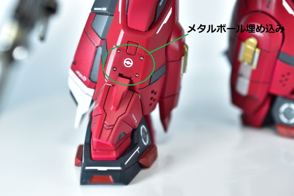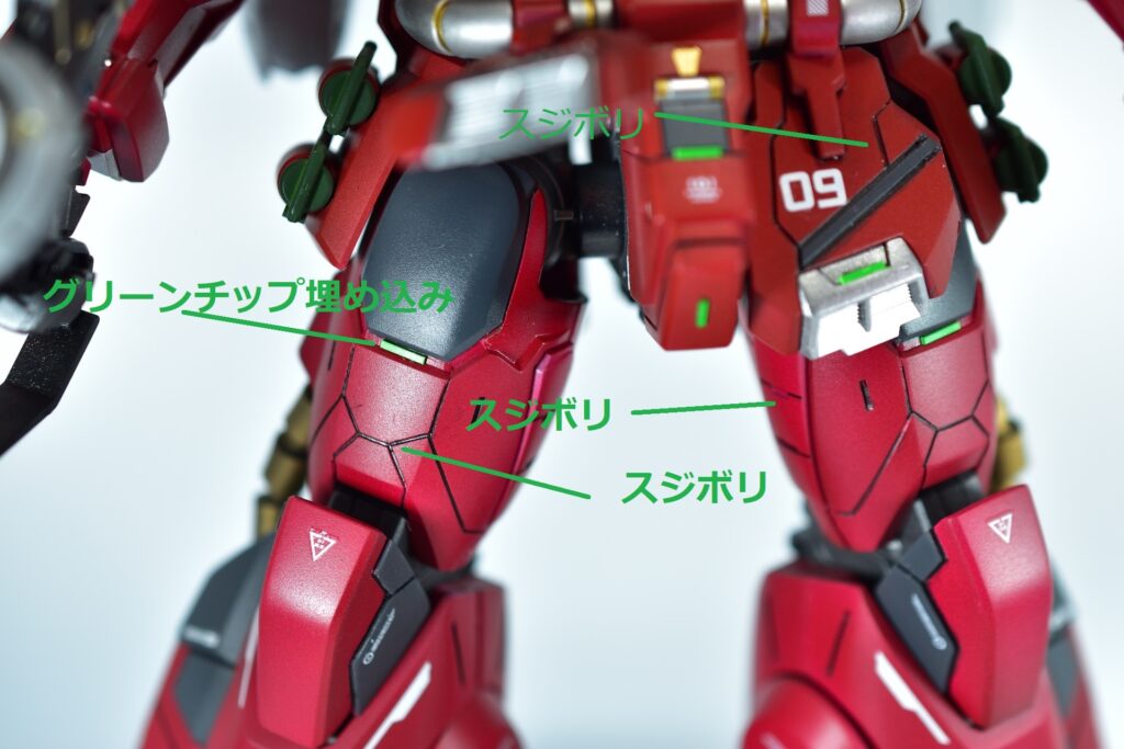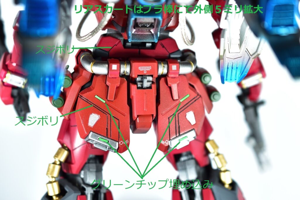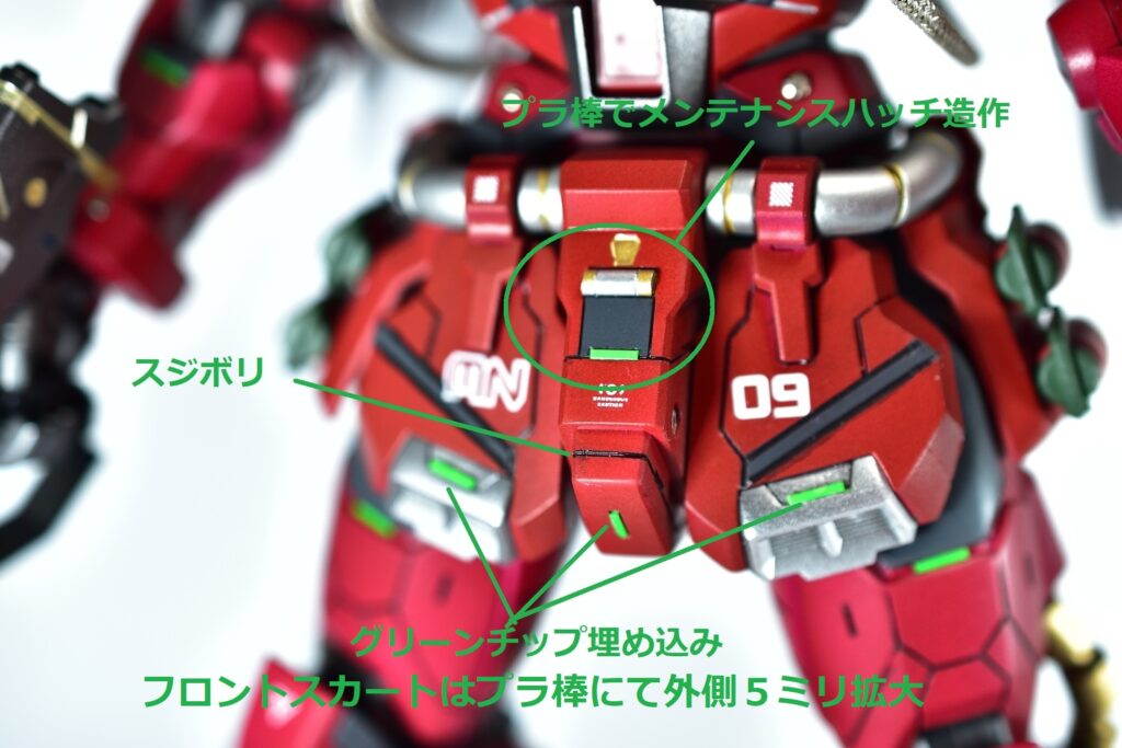 フロントスカートとリアスカートを左右それぞれ5ミリ拡大し、ザクらしい迫力を強調。全ての外装パーツに彫り込んだスジボリは、タガネを使用してくっきりさせています。甘いモールドも全て掘り直し、立体感をアップ。さらに、スジボリ箇所にはチップを埋め込み、全体の密度感を向上させました。