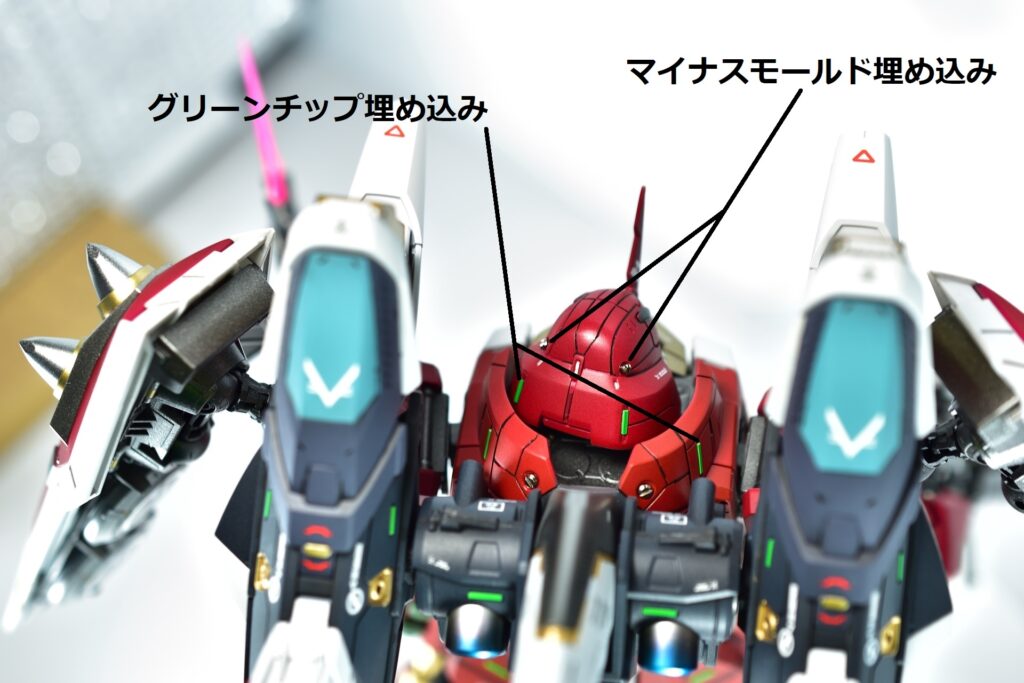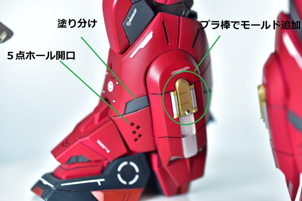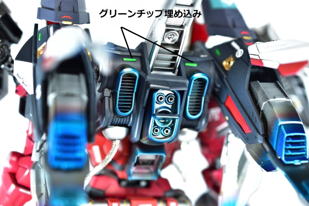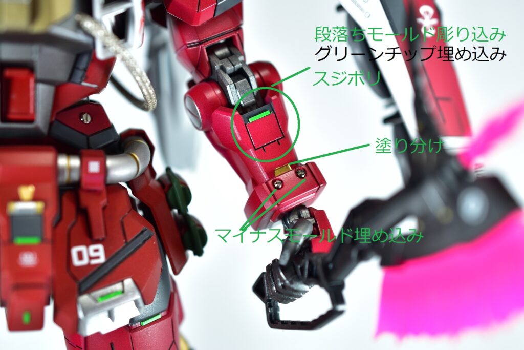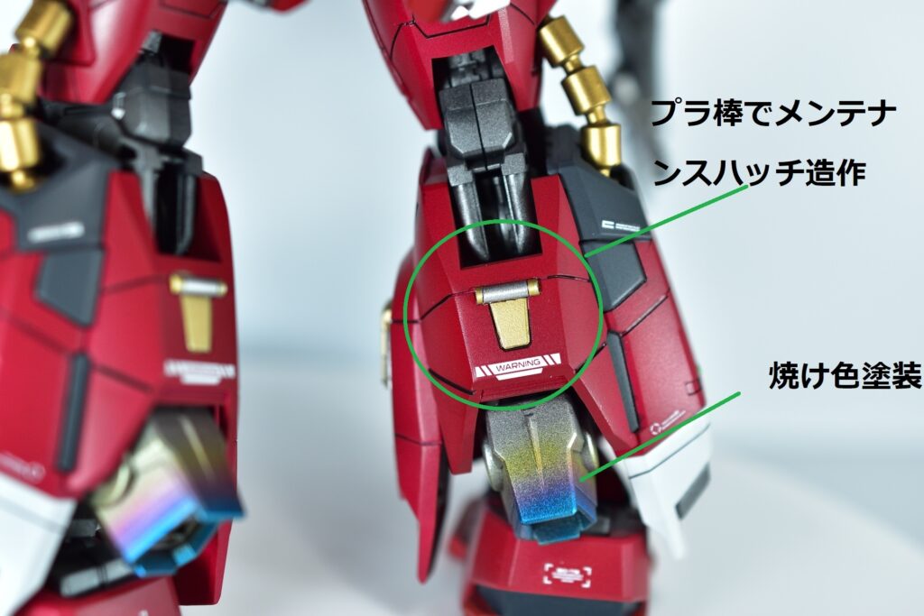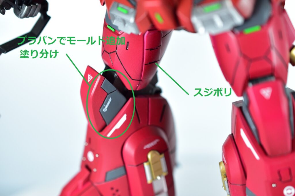 フロントスカートとリアスカートを左右それぞれ5ミリ拡大し、ザクらしい迫力を強調。全ての外装パーツに彫り込んだスジボリは、タガネを使用してくっきりさせています。甘いモールドも全て掘り直し、立体感をアップ。さらに、スジボリ箇所にはチップを埋め込み、全体の密度感を向上させました。