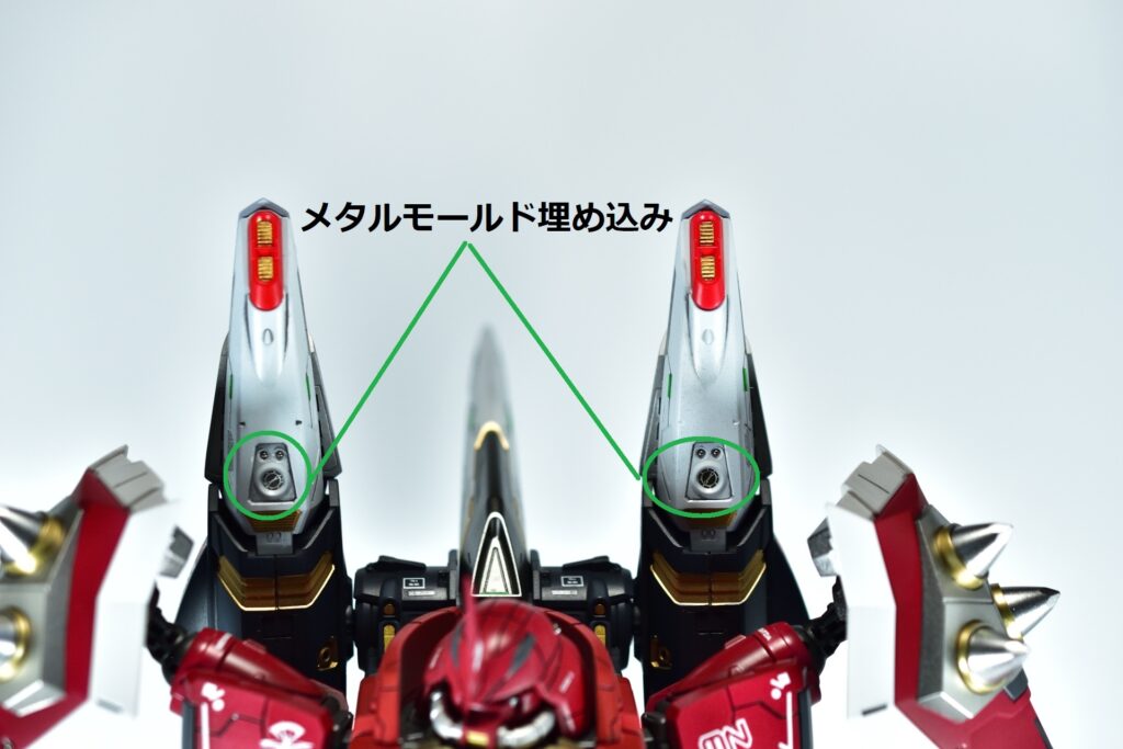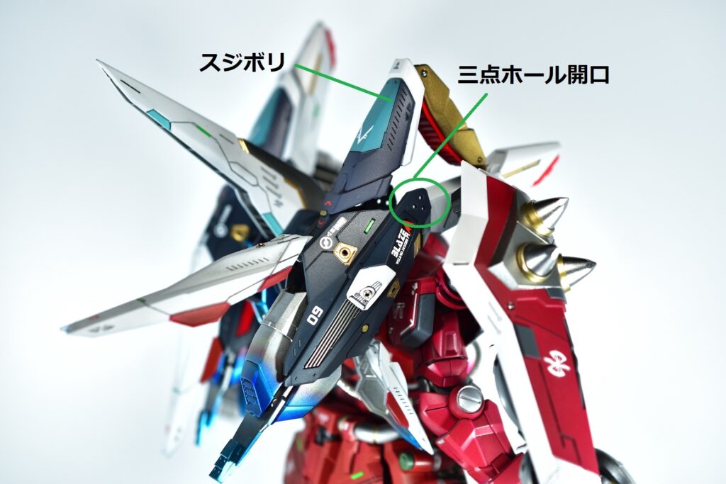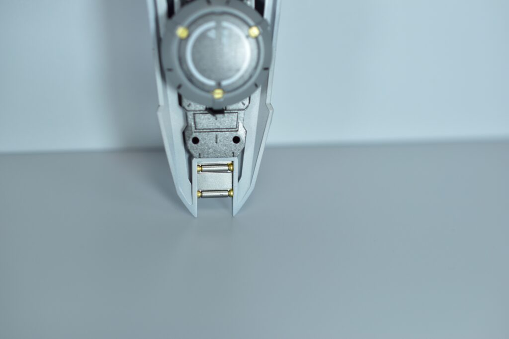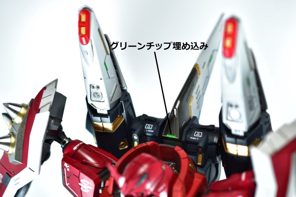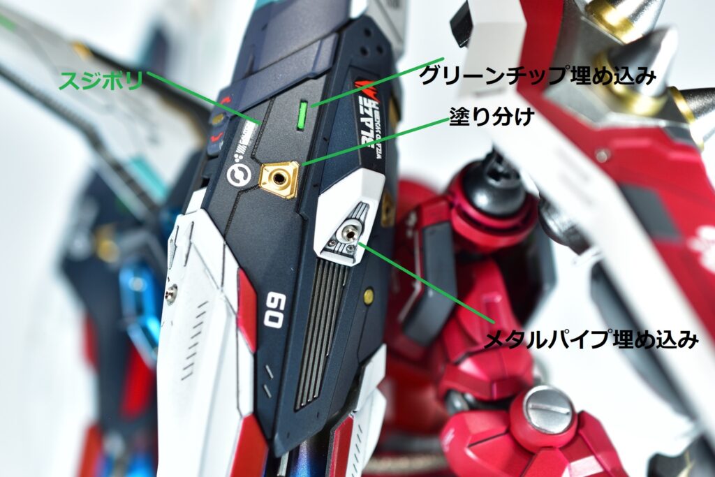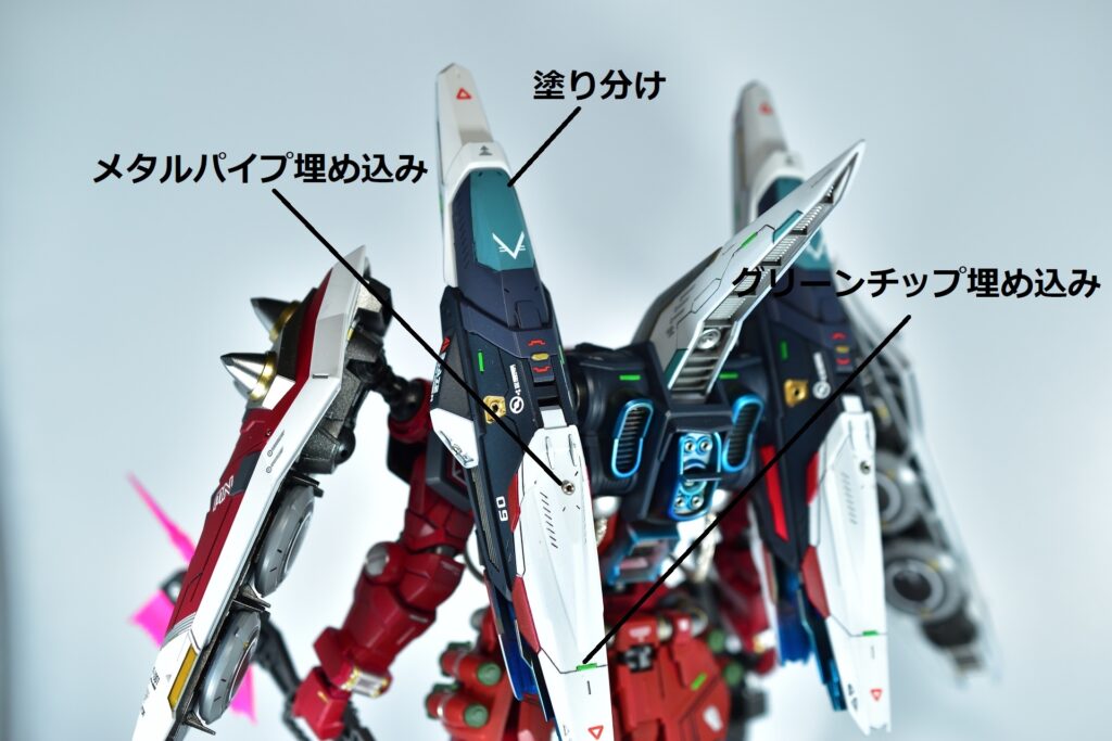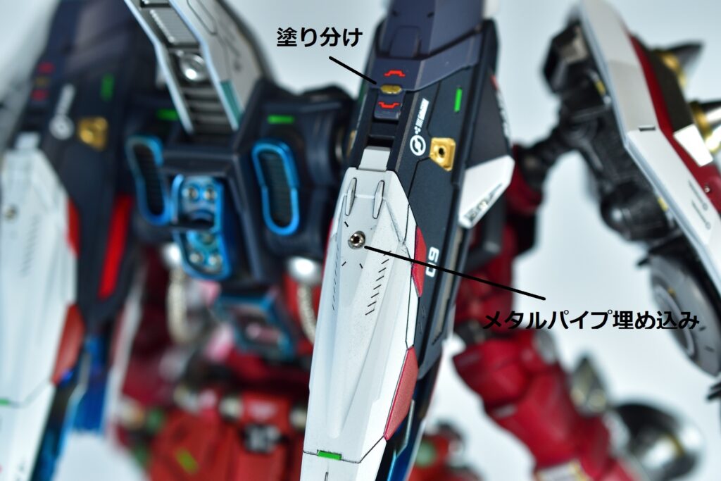 フロントスカートとリアスカートを左右それぞれ5ミリ拡大し、ザクらしい迫力を強調。全ての外装パーツに彫り込んだスジボリは、タガネを使用してくっきりさせています。甘いモールドも全て掘り直し、立体感をアップ。さらに、スジボリ箇所にはチップを埋め込み、全体の密度感を向上させました。