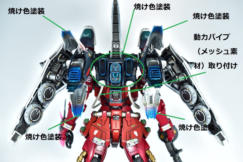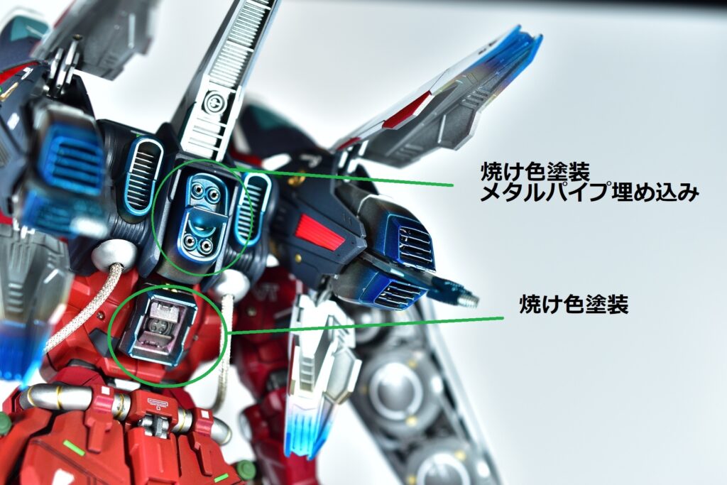 動力パイプを設置し、メタルパーツをふんだんに使用。ザク特有のメカニカルな雰囲気を強調しています。バーニアやスラスターには焼け色塗装を施し、リアリティを追求しました。