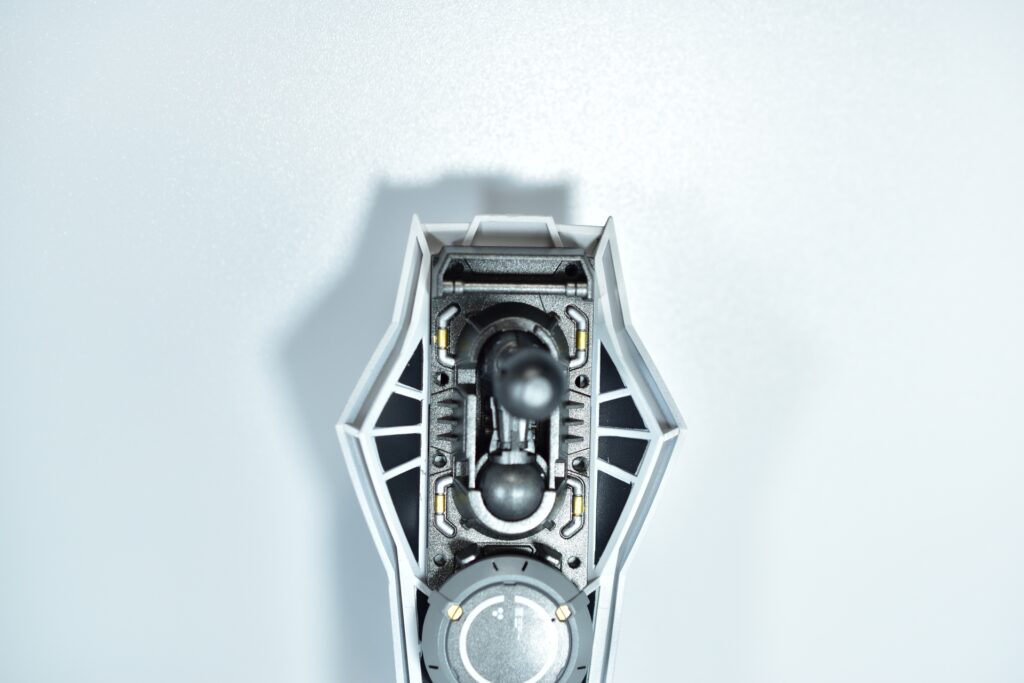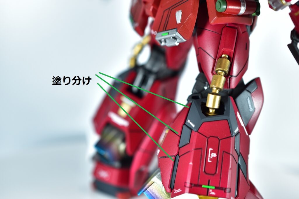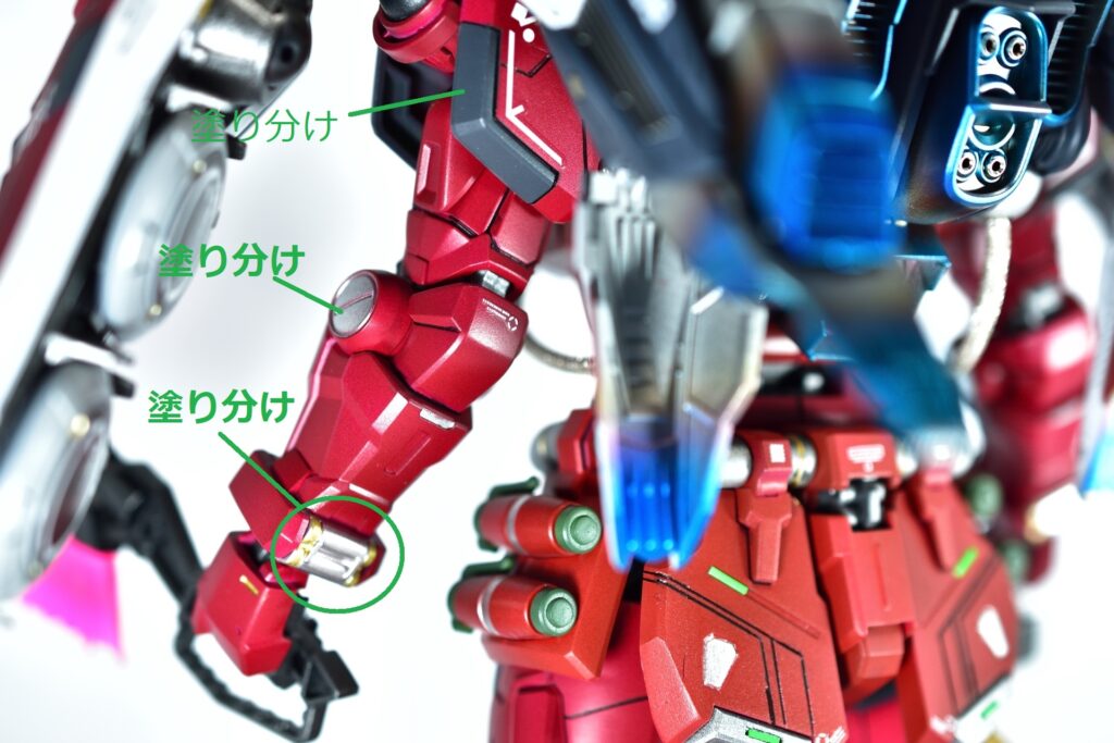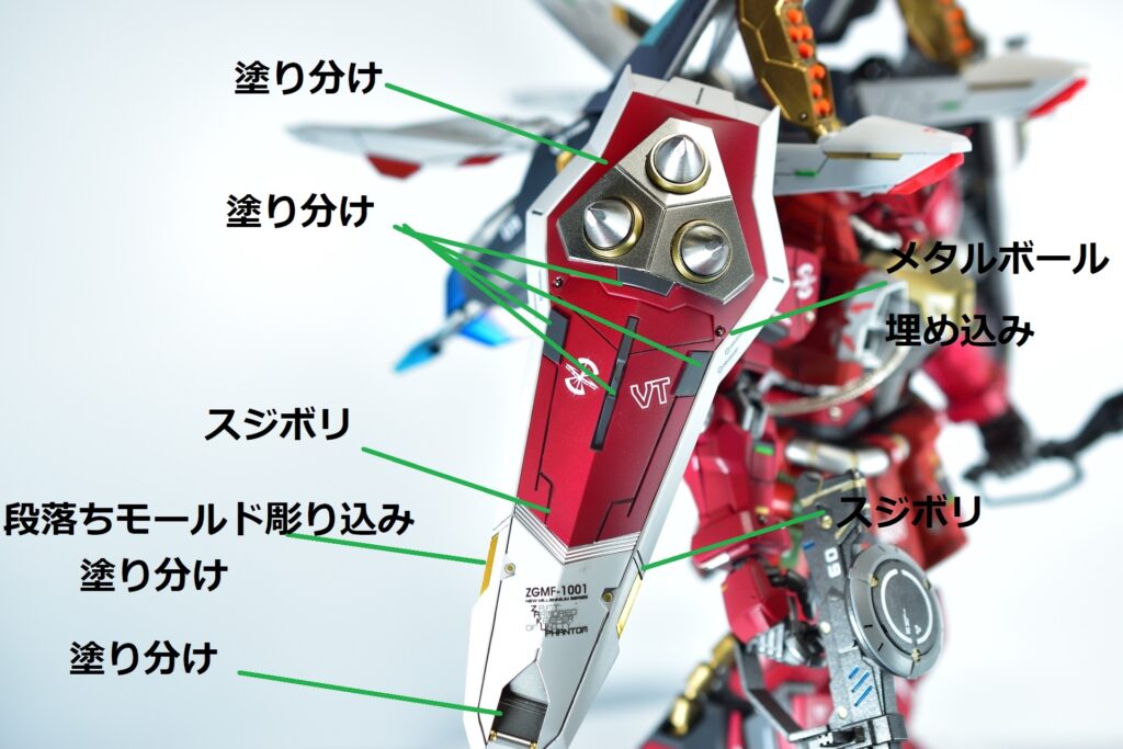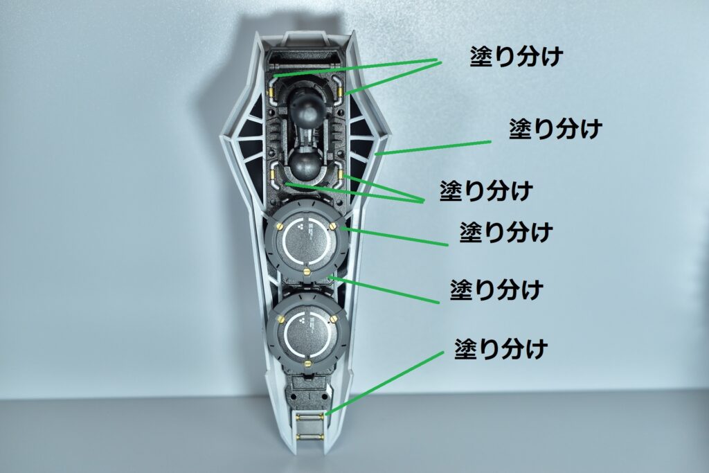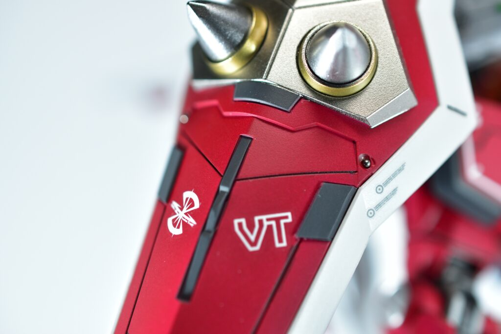 塗装前には超音波洗浄を実施し、ABSパーツにはプライマー処理を施した上で塗装。各部のモールドにはブラックとグレーで墨入れを行い、細部のラインを際立たせています。水転写デカールを貼り付けた後、つや消しクリアーで全体を仕上げています。