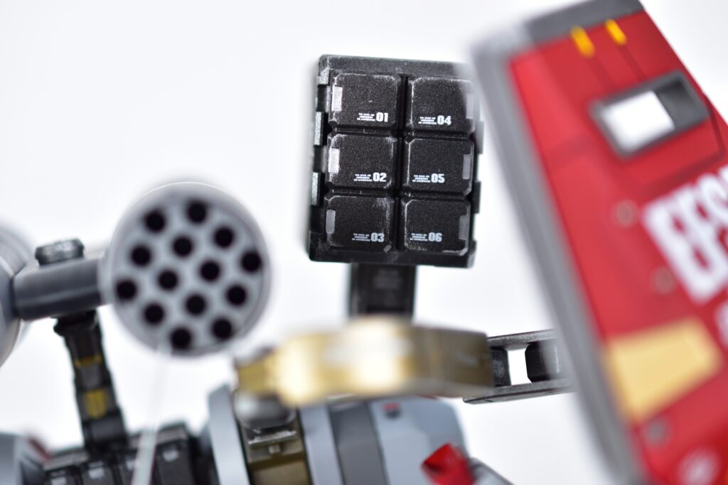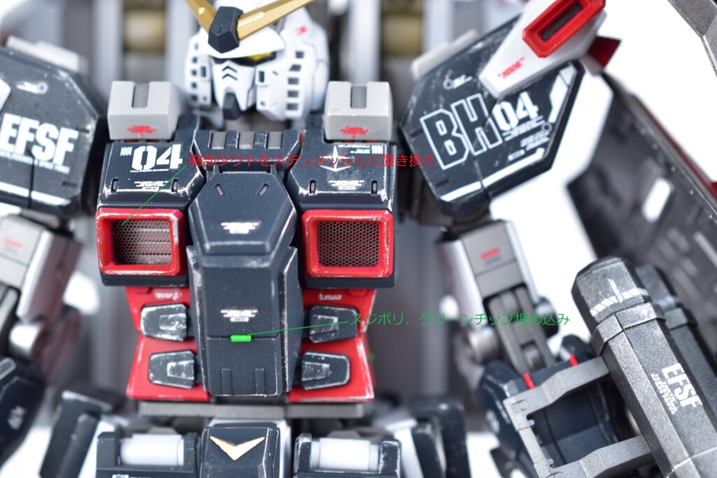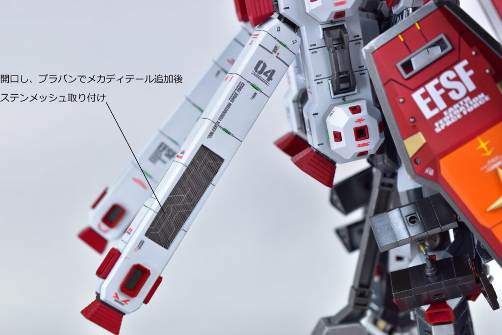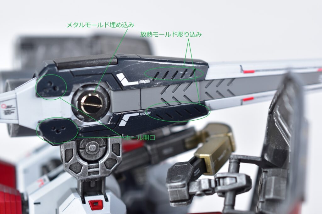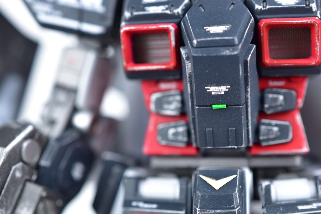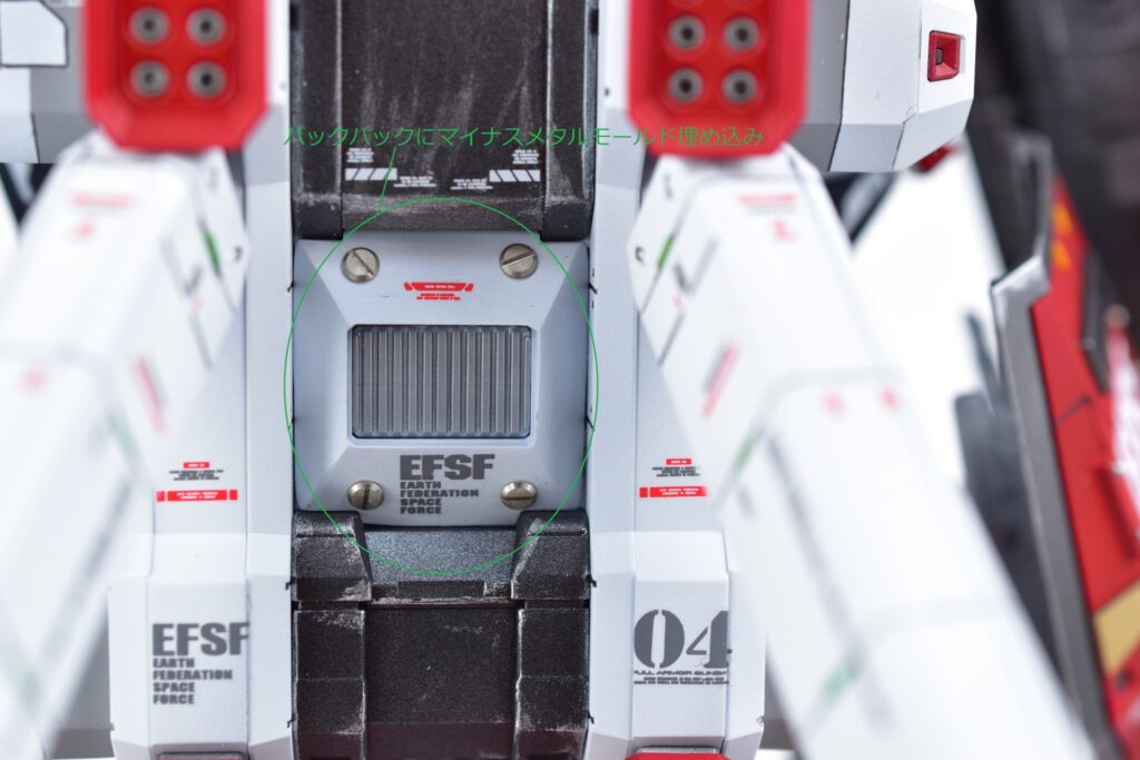 キットではシンプルなデザインだったバックパックにスジボリ、チップ埋め込み、開口部へのメッシュ追加を実施。機械的な密度感を表現し、存在感を高めています。
