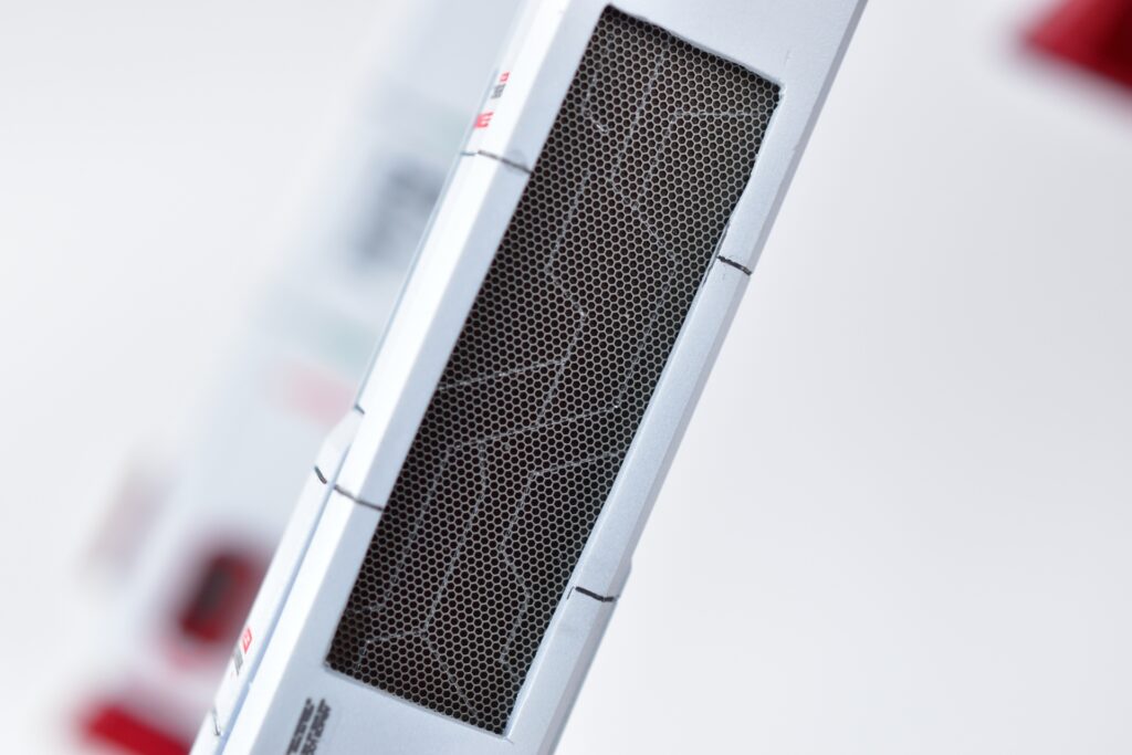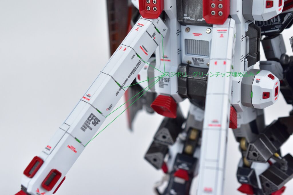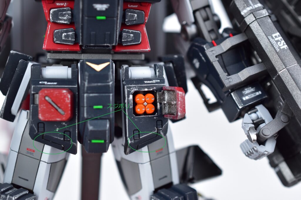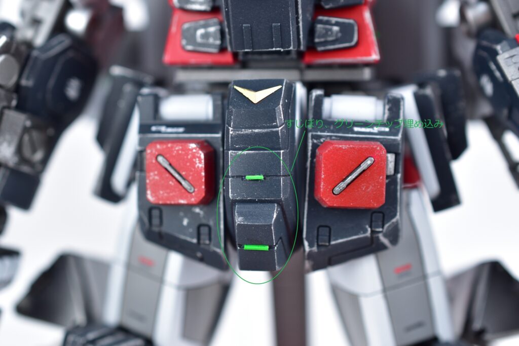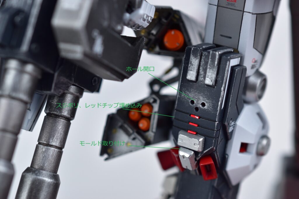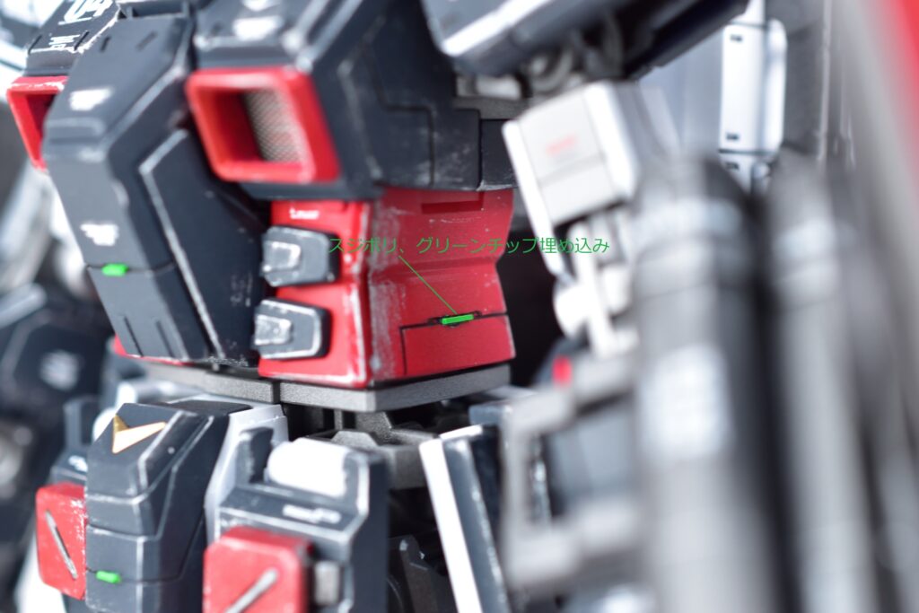 キットではシンプルなデザインだったバックパックにスジボリ、チップ埋め込み、開口部へのメッシュ追加を実施。機械的な密度感を表現し、存在感を高めています。
