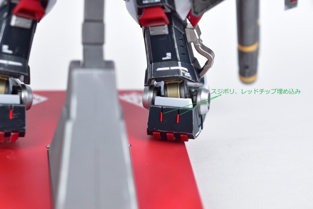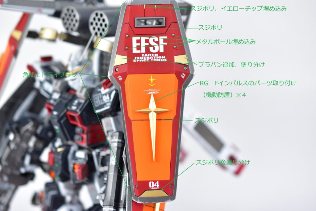 シールドの十字マークはRGフォースインパルスガンダムのパーツを4つ使用して作成。立体感と存在感を増し、シールドそのものが映えるよう工夫しています。