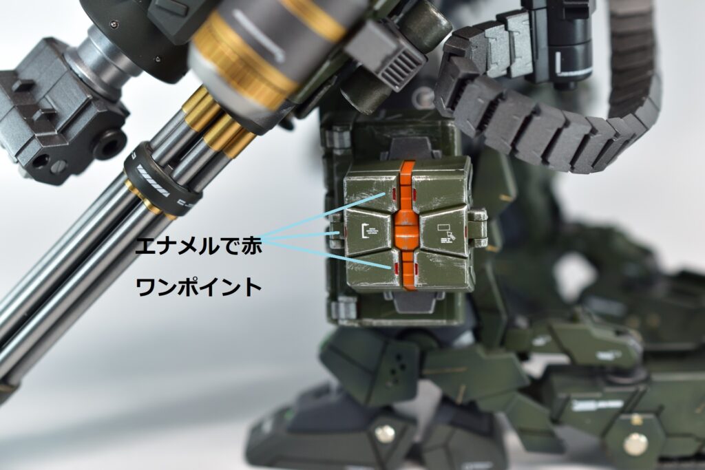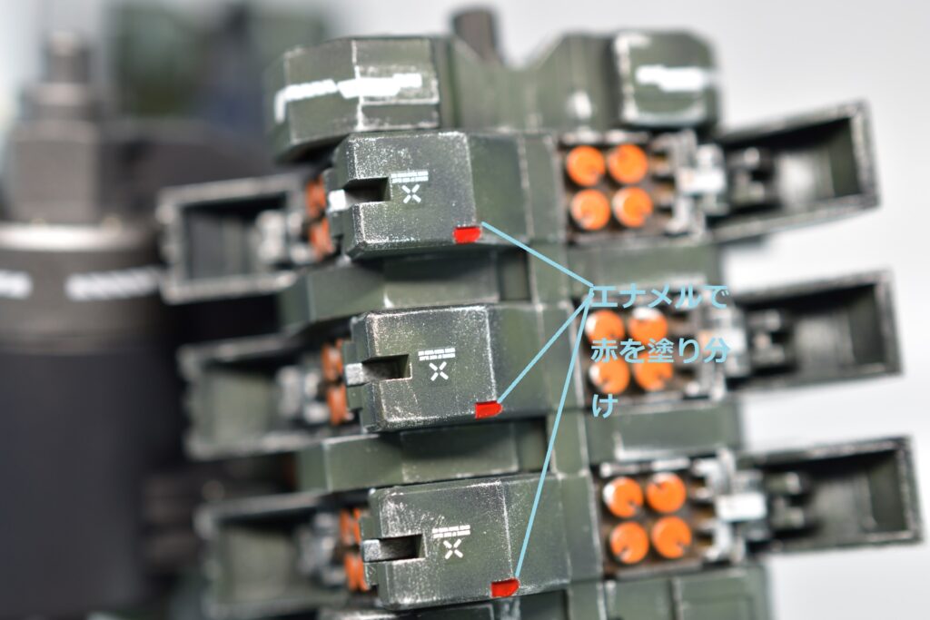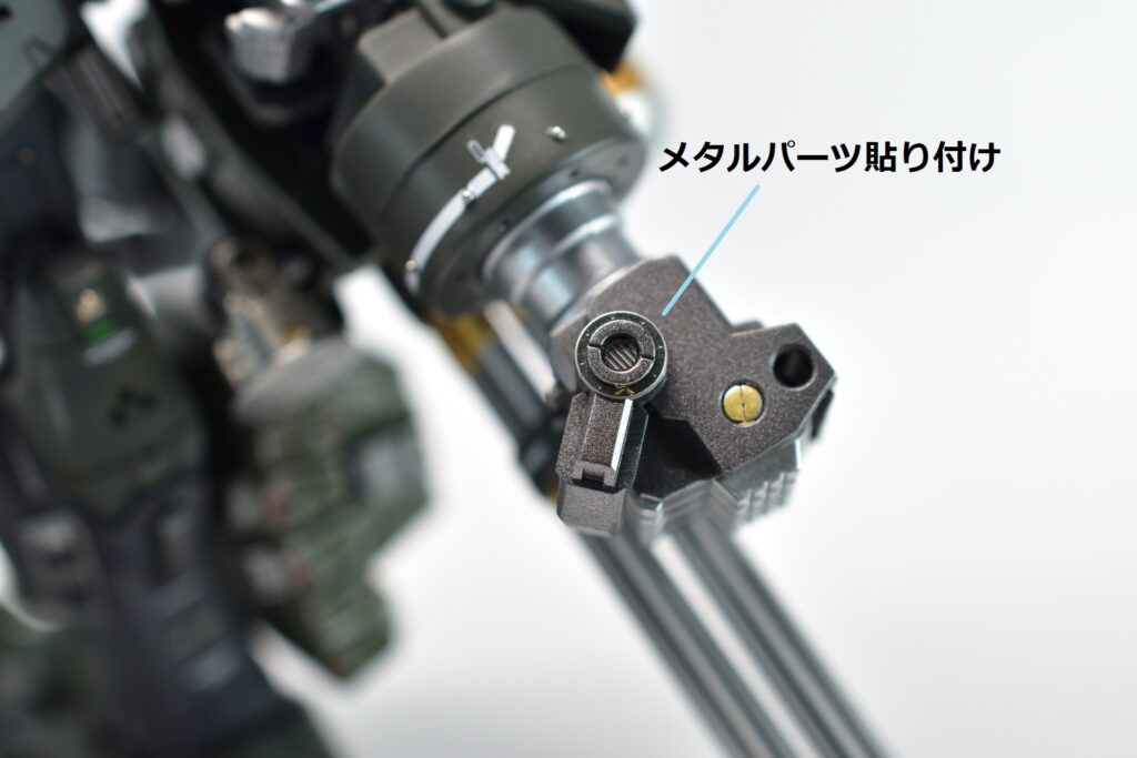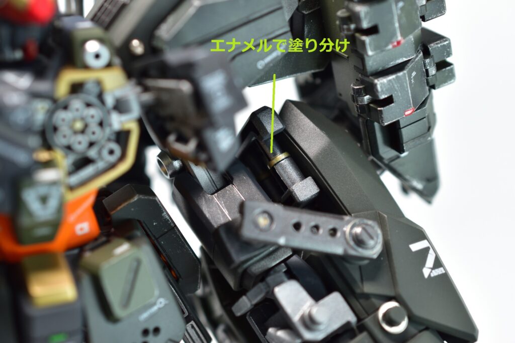 全体のメインカラーを「メカサフスーパーヘビー」に変更。オリーブグリーン部分にはクレオスの309グリーンを採用し、黒サフを下地に迷彩風のまだら模様を施しました。各部の金属表現にはガイアとクレオスのメタリックカラーを使用。ドライブラシで剥がれ表現を加え、質感をリアルにしています。