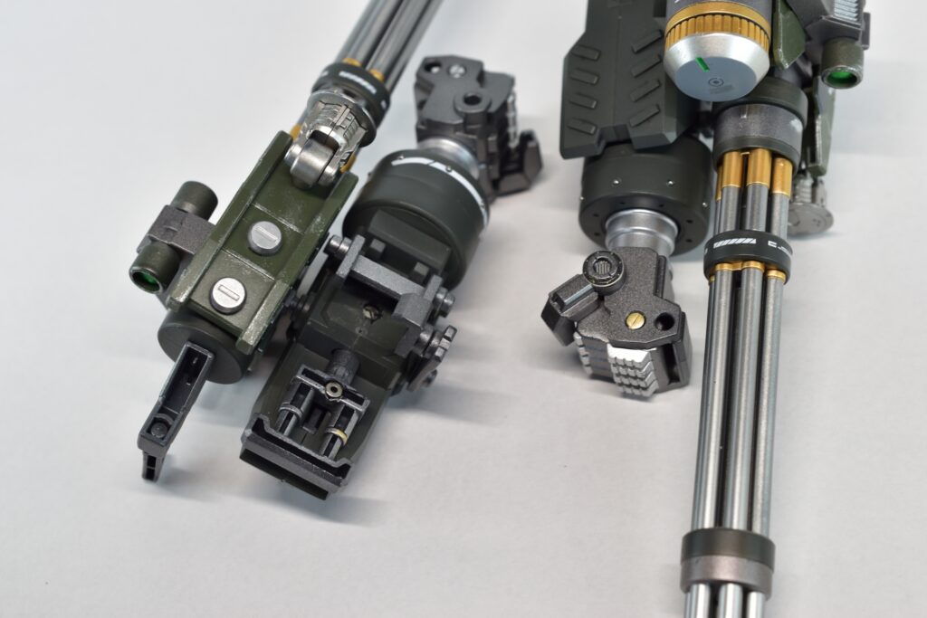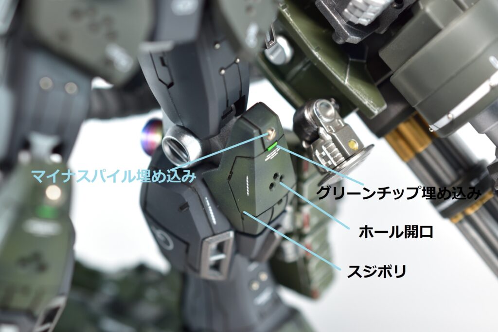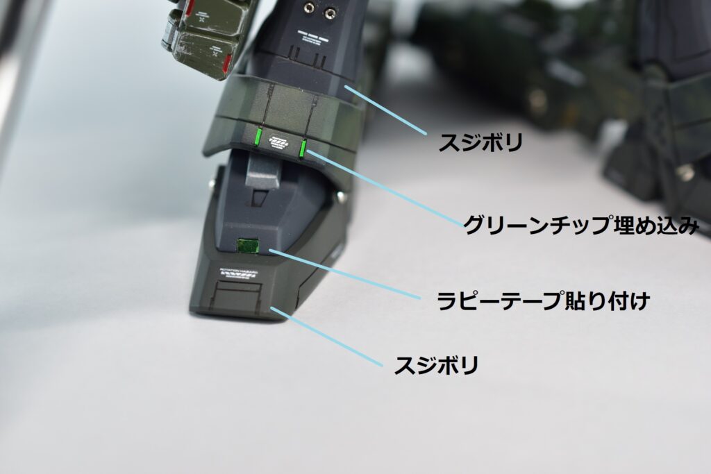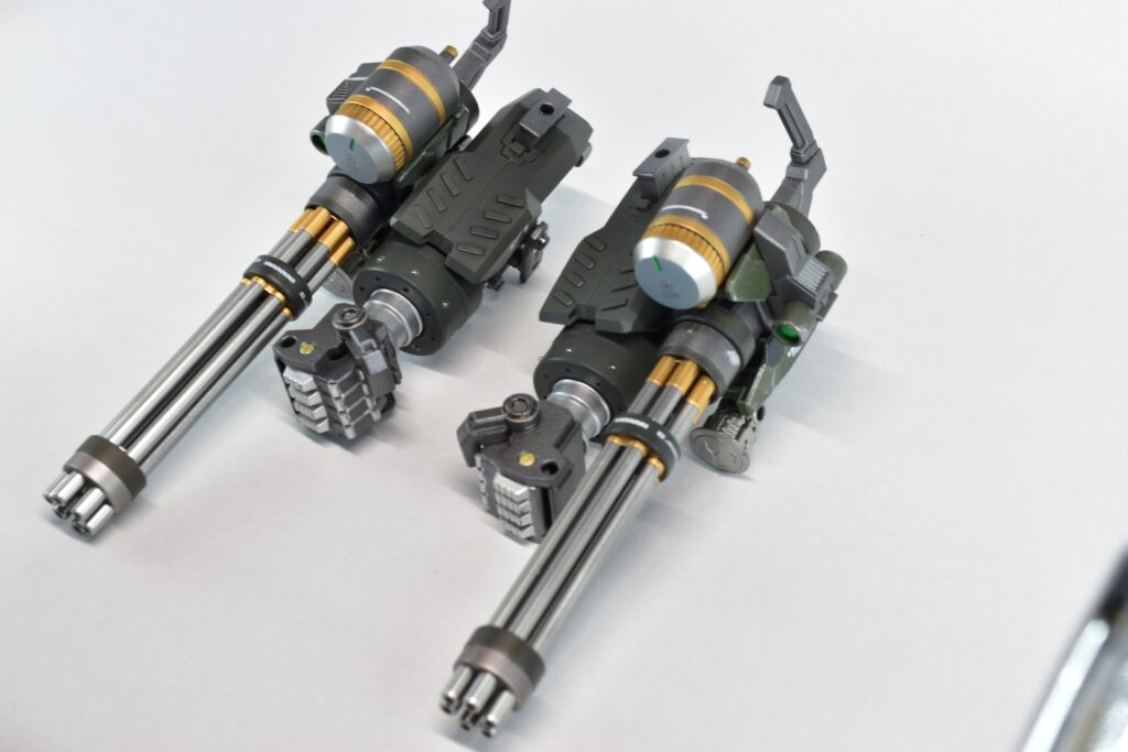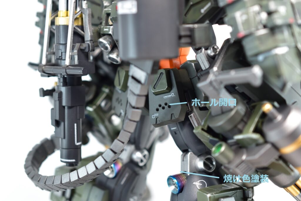 全体のメインカラーを「メカサフスーパーヘビー」に変更。オリーブグリーン部分にはクレオスの309グリーンを採用し、黒サフを下地に迷彩風のまだら模様を施しました。各部の金属表現にはガイアとクレオスのメタリックカラーを使用。ドライブラシで剥がれ表現を加え、質感をリアルにしています。