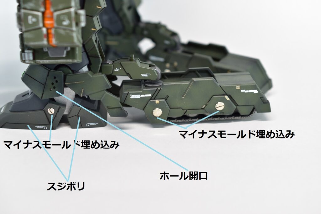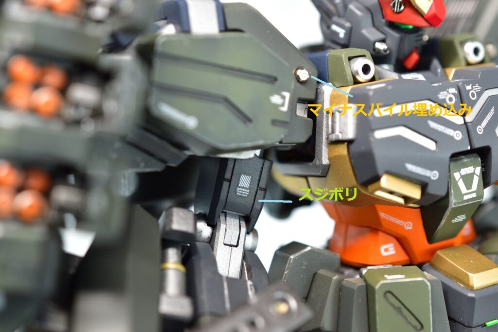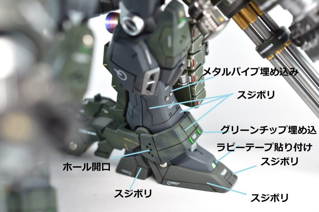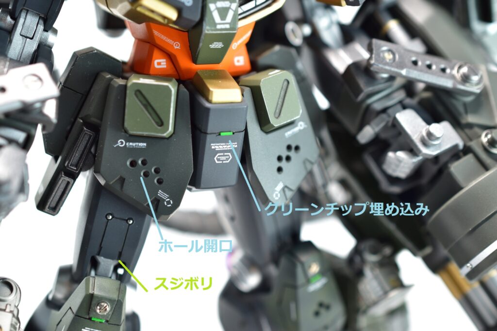 基本工作ではゲート処理、表面処理を行い、スジボリでディテールを追加しました。スジボリの幅は0.2~0.6ミリを使い分け、部分ごとに異なる表情を持たせています。