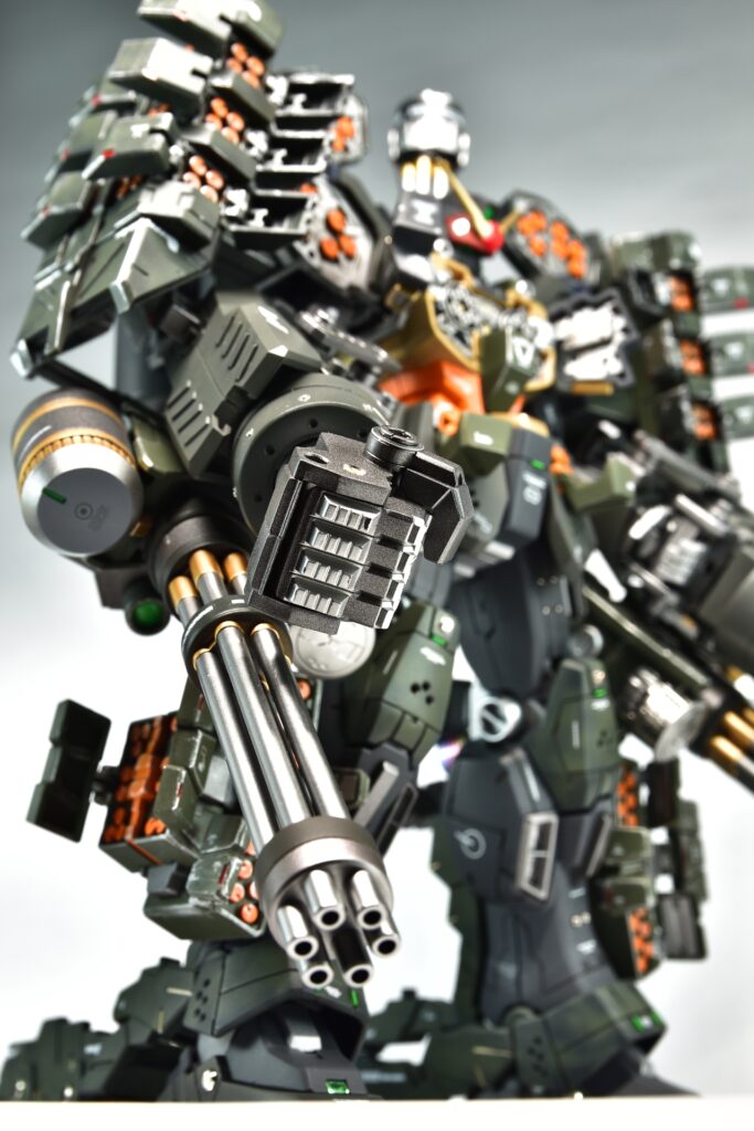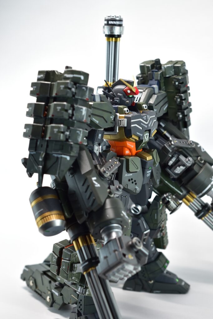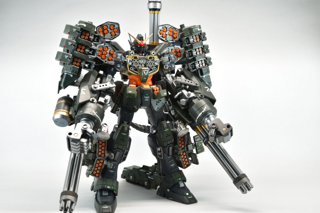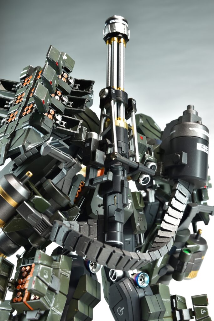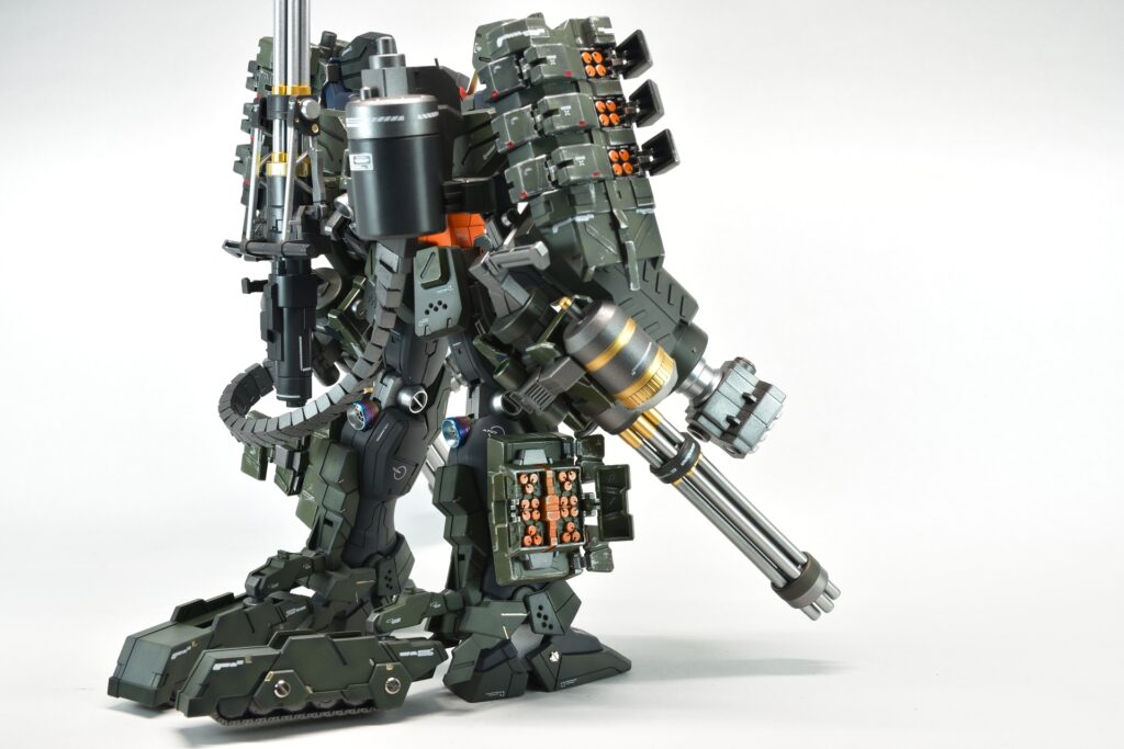 ミリタリーテイストと追加武装により、元の機体からは想像できないほどの力強い姿に仕上がりました。特に迷彩風のグラデーション塗装と金属の質感表現が、重厚感を際立たせています。