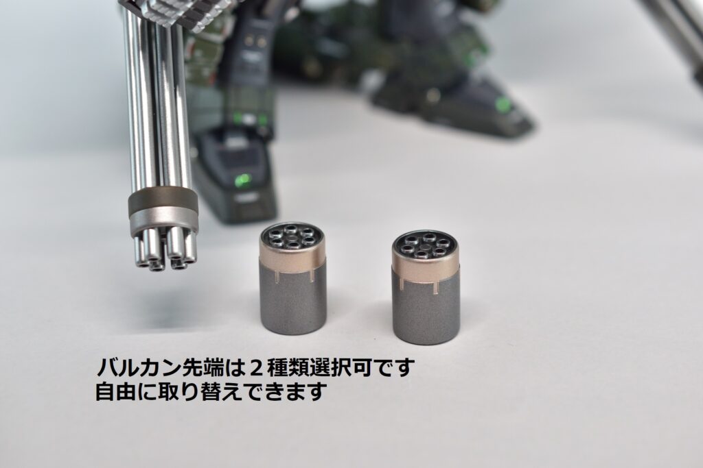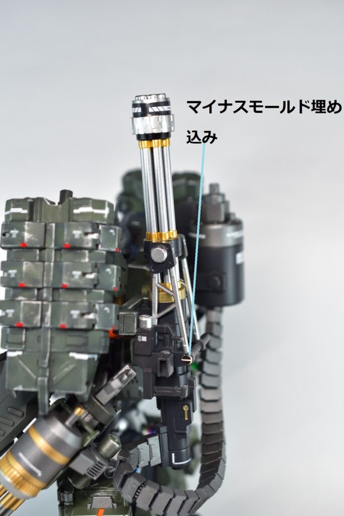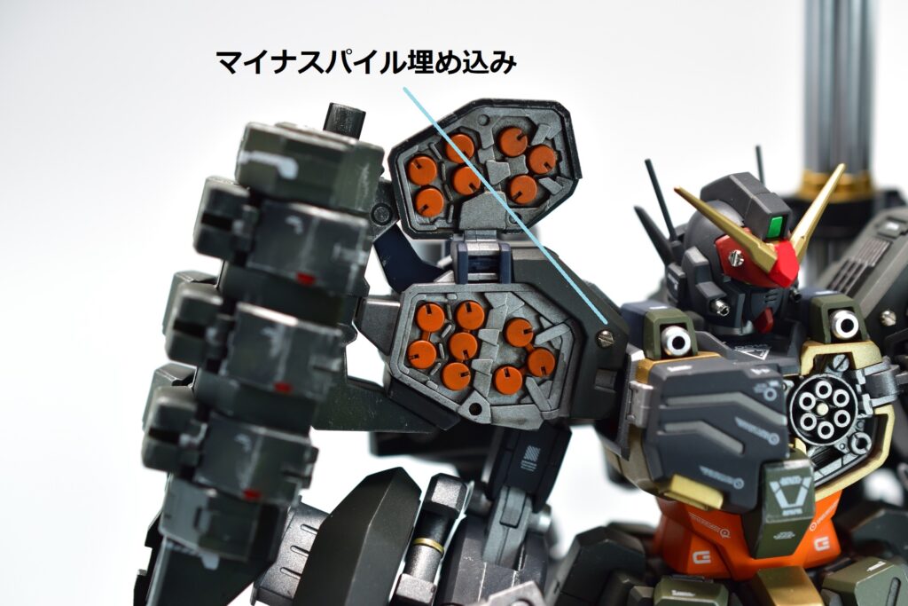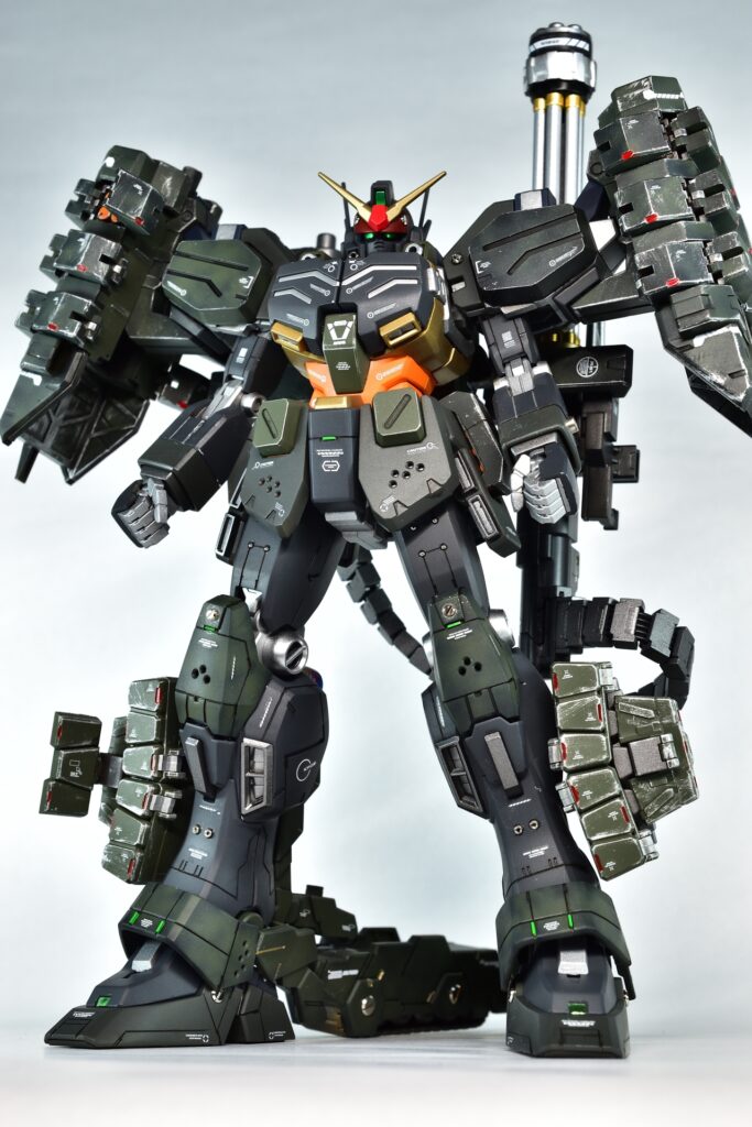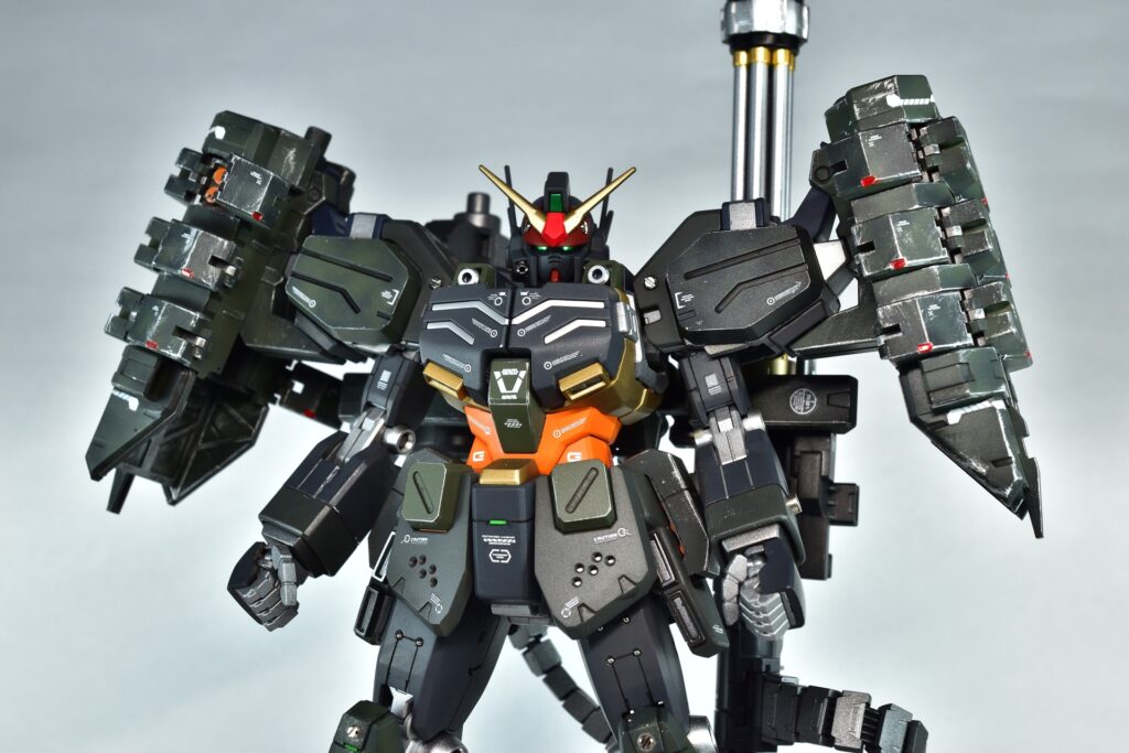 ミリタリーテイストと追加武装により、元の機体からは想像できないほどの力強い姿に仕上がりました。特に迷彩風のグラデーション塗装と金属の質感表現が、重厚感を際立たせています。