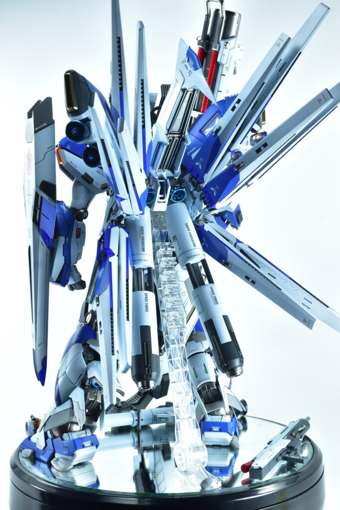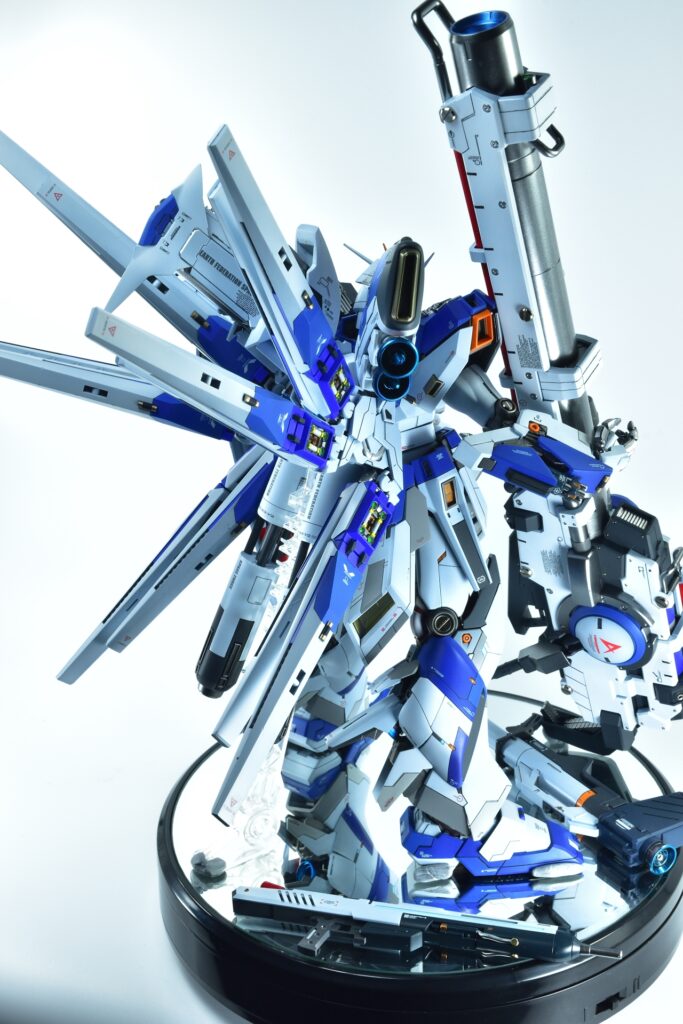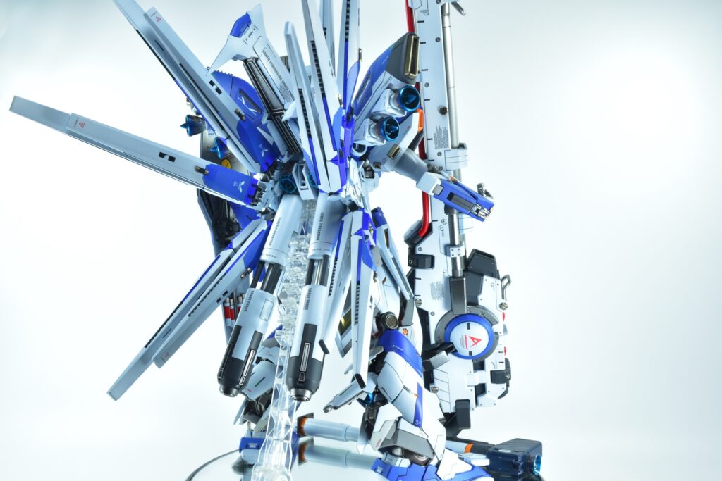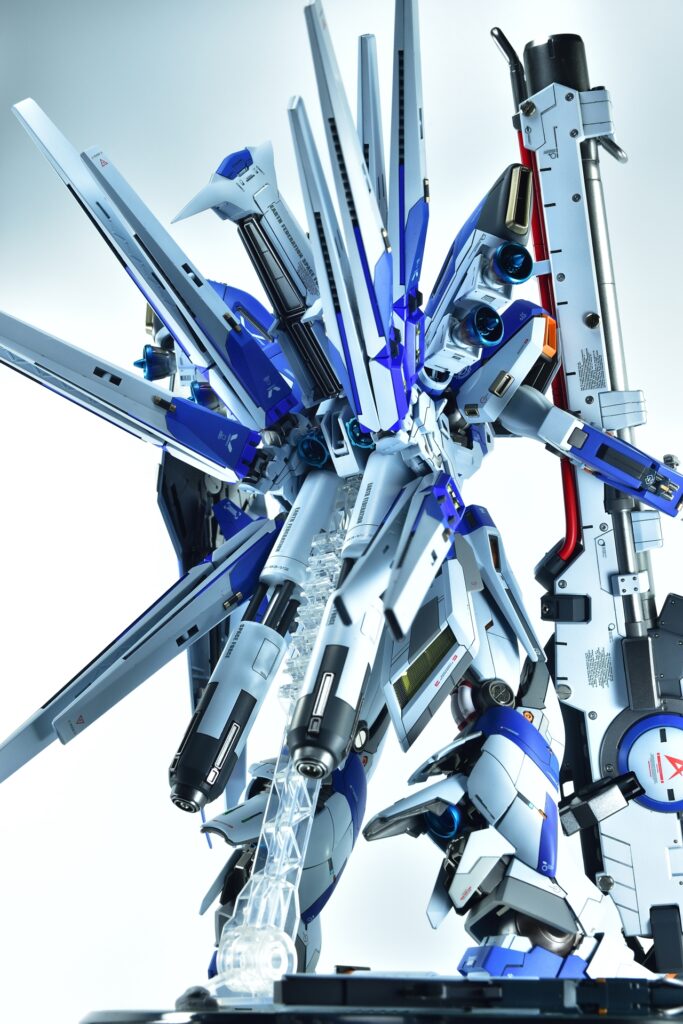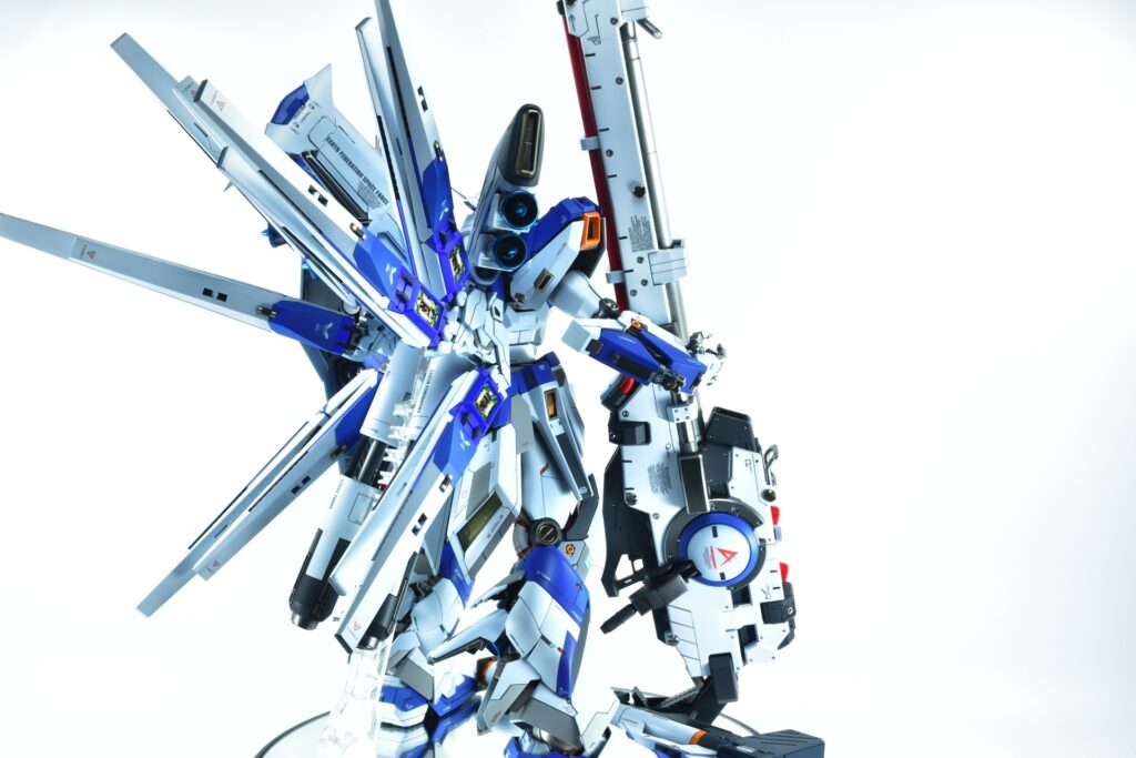 ファンネル12枚の平面処理から始まる壮大な改修作業でしたが、その分仕上がりには大満足しています。ハイパーメガバズーカやファンネルの固定方式を変更するなど、細部にわたる改造を施し、MG Hi-νガンダムに新たな魅力を加えることができました。改修を施すことで、オリジナルのMG Hi-νガンダムとは一線を画す、より強烈でインパクトのあるMSが完成しました。