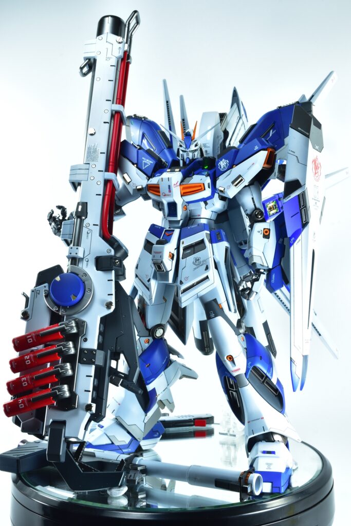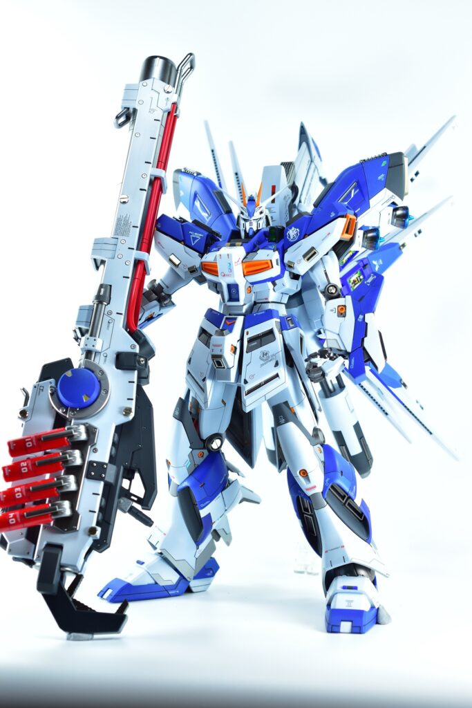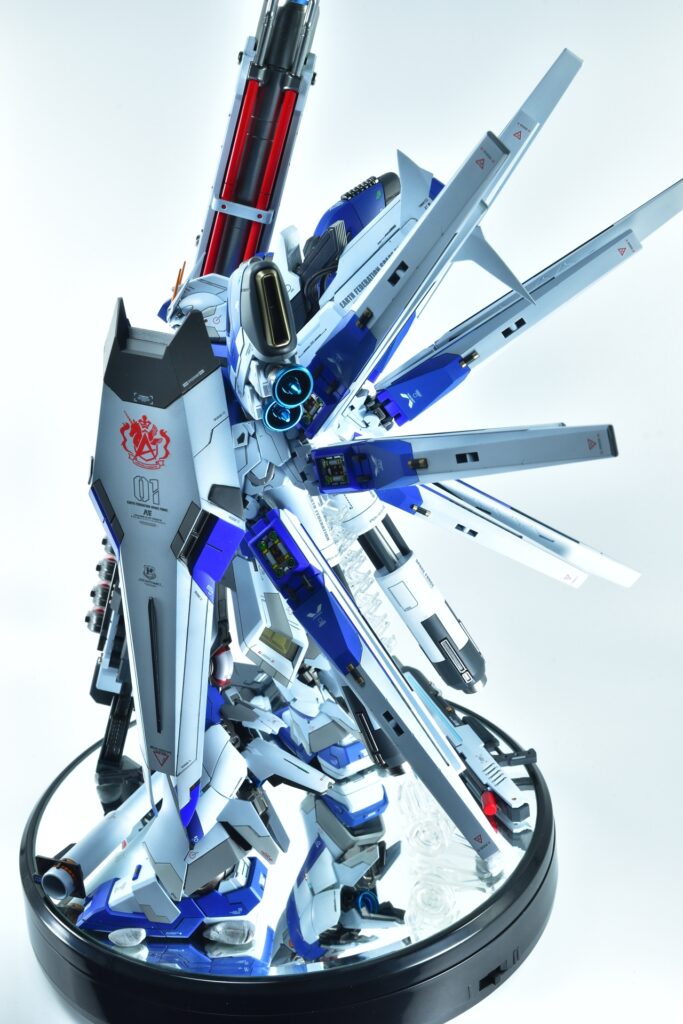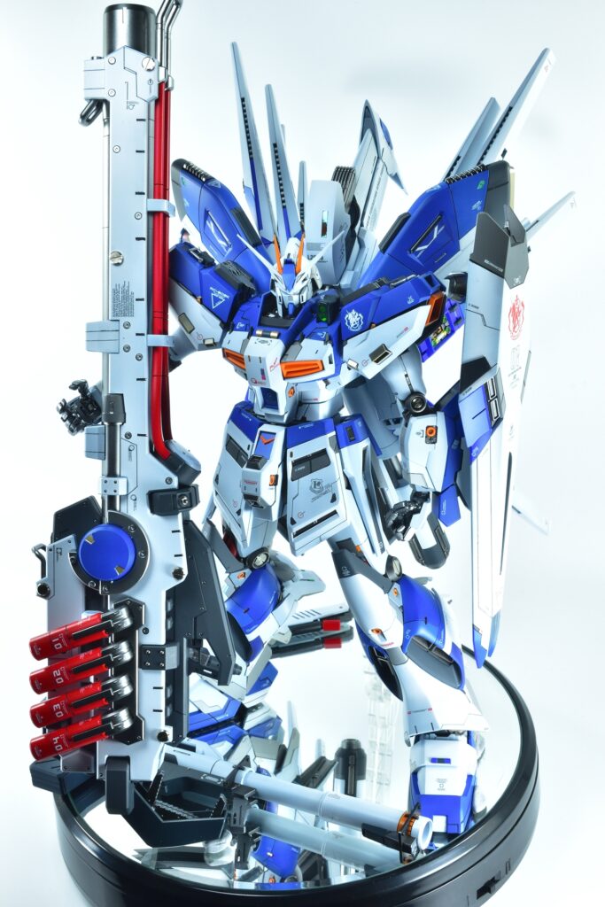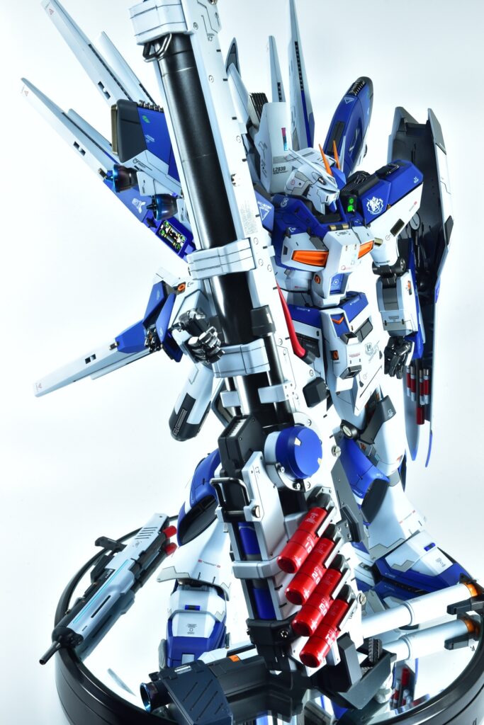 ファンネル12枚の平面処理から始まる壮大な改修作業でしたが、その分仕上がりには大満足しています。ハイパーメガバズーカやファンネルの固定方式を変更するなど、細部にわたる改造を施し、MG Hi-νガンダムに新たな魅力を加えることができました。改修を施すことで、オリジナルのMG Hi-νガンダムとは一線を画す、より強烈でインパクトのあるMSが完成しました。