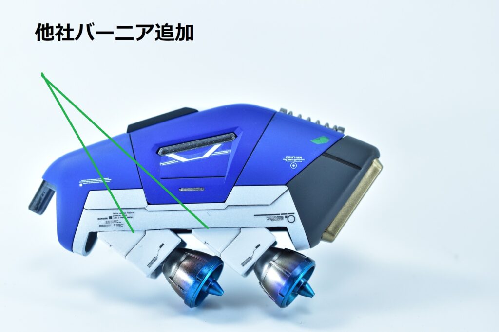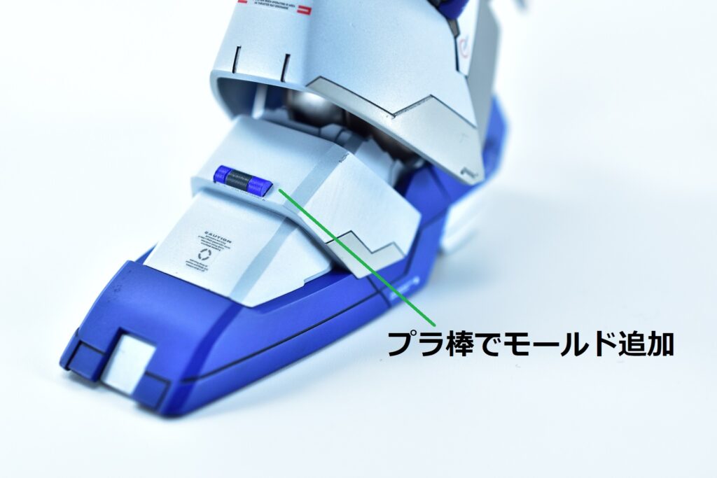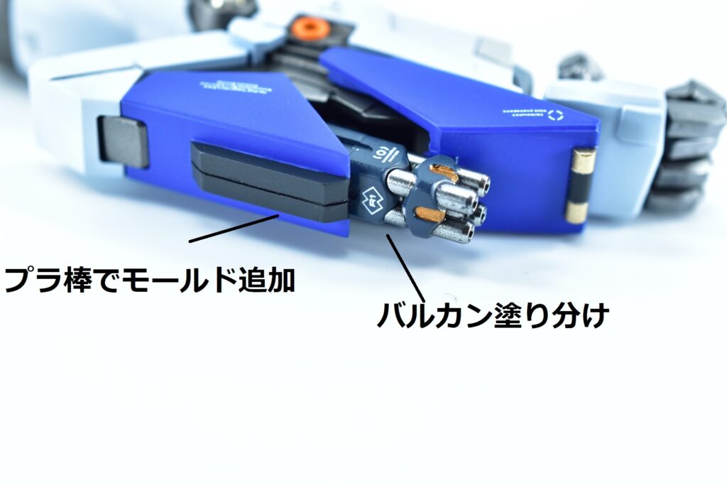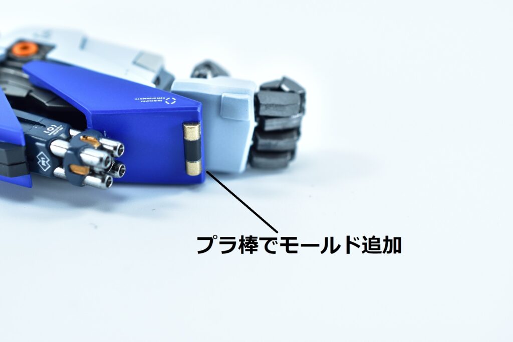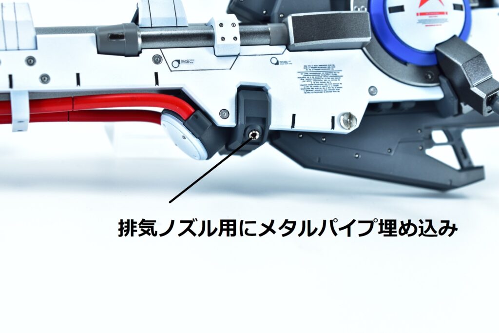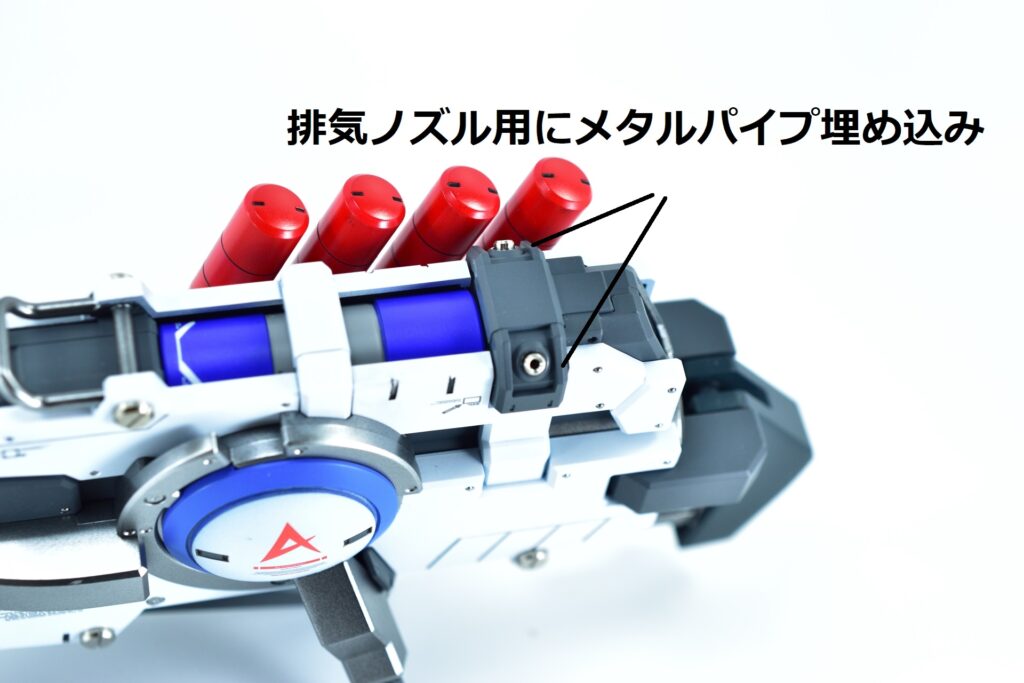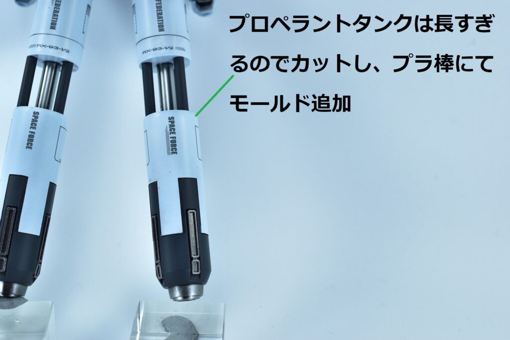 従来のプロペラントタンクは長すぎて、個人的に好きではなかったため、切り詰めて改修しました。さらに、プラ棒を使ってパイピング風のディテールを加え、より実戦的な印象を与えています。