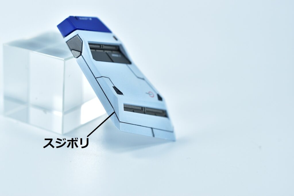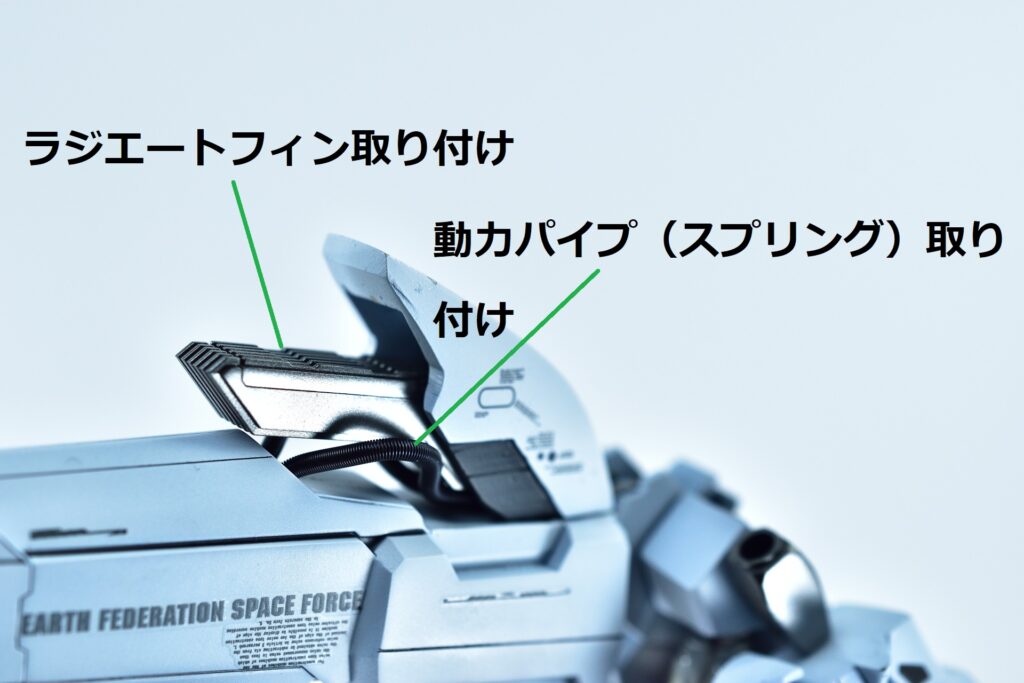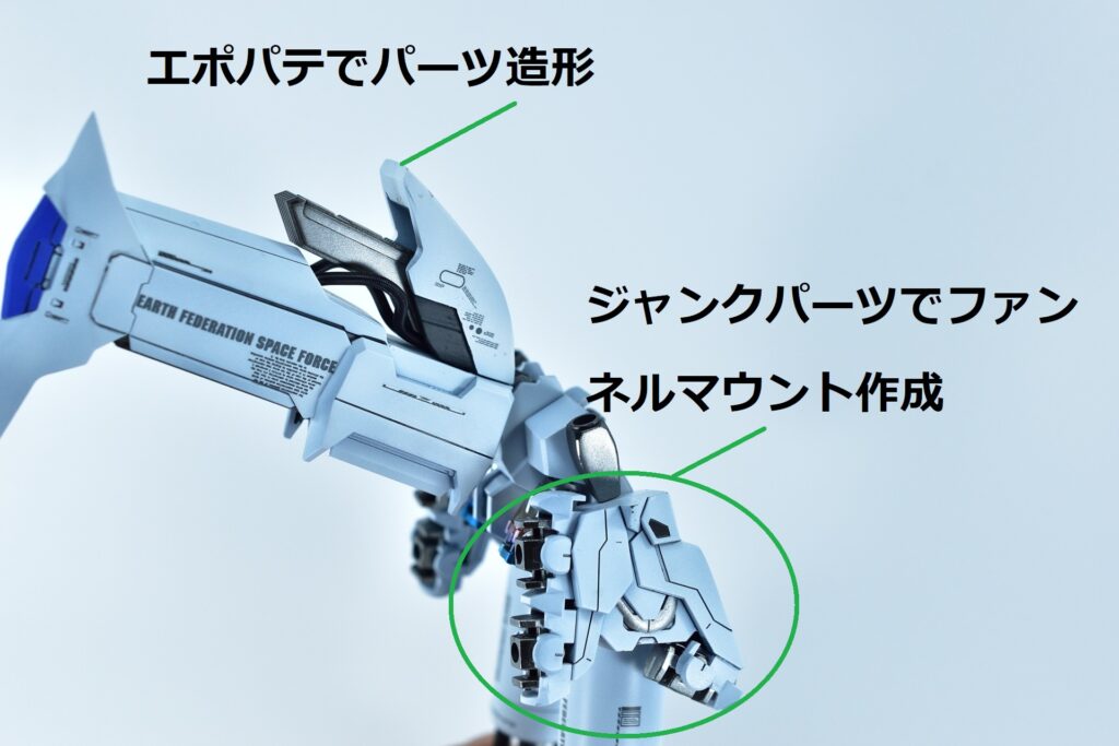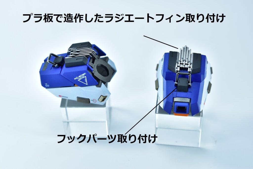 従来のぶら下げ固定方式から脱却し、ジャンクパーツを使って横に固定できる方式に変更しました。この改造により、ファンネルの位置が安定し、より迫力ある姿勢が表現できるようになりました。